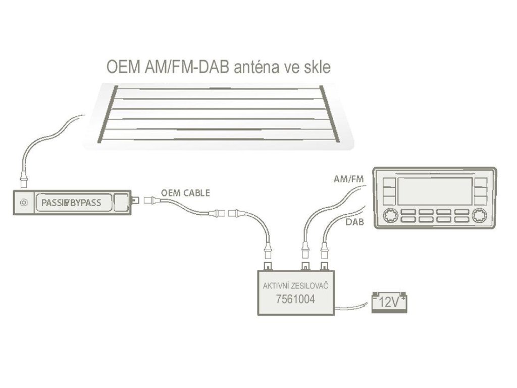 nebo v kombinaci se sadou Active Splitter a kabely. Pasivní bypass DAB funguje pouze ve vozidlech s OEM AM/FM /DAB anténou vyadním nebo bočním skle