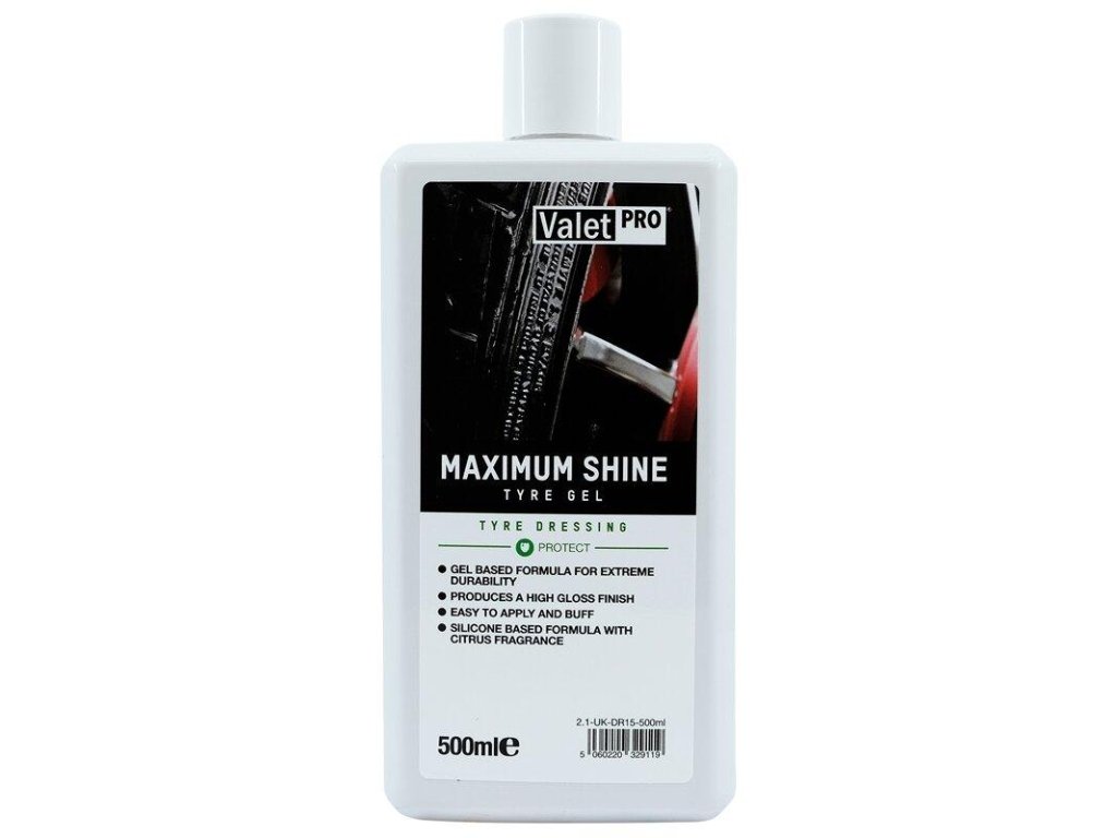 ValetPro Maximum Shine Tyre Gel je snadno aplikovatelný gelový přípravek pro ošetření pneumatik. Dokonale obstává i v extrémních podmínkách – nezaskočí ho vysoké teploty ani intenzivní deště.