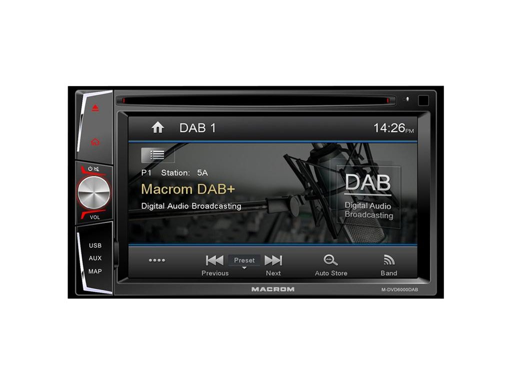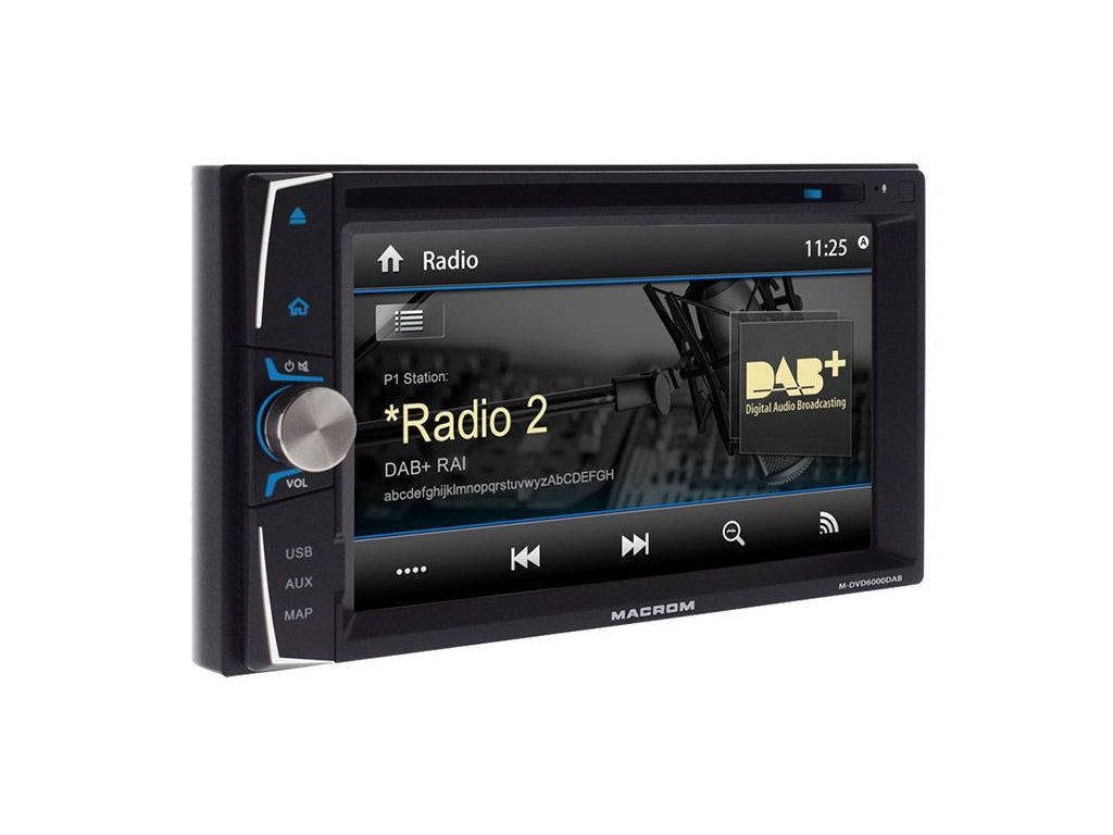 MACROM M-DVD6000DAB je multimediální jednotka s DAB přijímačem, navigaci, vestavěnou CD / DVD mechanikou, USB předním a zadním vstupem a SD čtečkou pamětových karet. Přístroj je vybaven dotykovým monitorem 6,2 palců, vstupem pro couvací kameru (po zařazení zpátečky), vstupem pro ovládání z volantu. MACROM obsahuje vestavěnou GPS navigaci a Hands free sadu s externím mikrofonem. Pomocí 2DIN instalačního rámečku lze umístit do většiny typů automobilů.