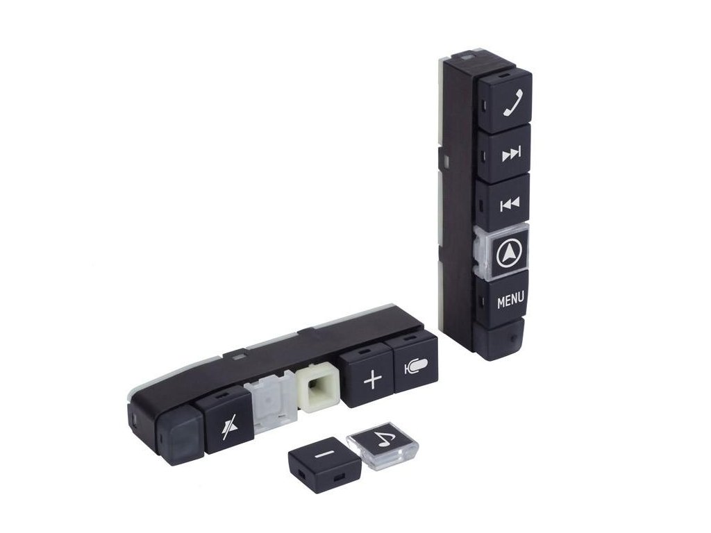 Dvojici tlačítkových panelů přijímače je možné nainstalovat vodorovně nebo svisle v závislosti na jeho poloze. Díky výměnným tlačítkům lze pozice/funkce přiřadit i jednotlivě. Systém si tak můžete přizpůsobit zcela podle svého ať už jste levák či pravák nebo i toho, na které straně máte řízení. Doporučujeme např. umístit tlačítka pro ovládání hlasitosti na stejné straně jako je volant, aby byla snadno dosažitelná.