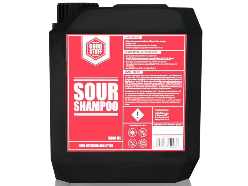 Good Stuff Sour Shampoo 5000 ml. Speciálně vyvinutý autošampon s dokonalými pěnícími vlastnostmi. V koncetrátu disponuje kyselým pH 3.5, skvělá lubricita zaručuje bezpečné a bezchybné mytí auta. Při ředění 20 – 50 ml na 10 litrů vody je šetrný k naneseným ochranám a sealantům. Na rozdíl od jiných šamponů ve stejné cenové hladině je Good Stuff Pure Shampoo výjimečný svou nízkou spotřebou.