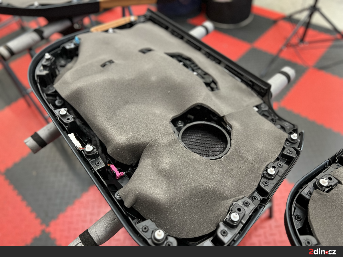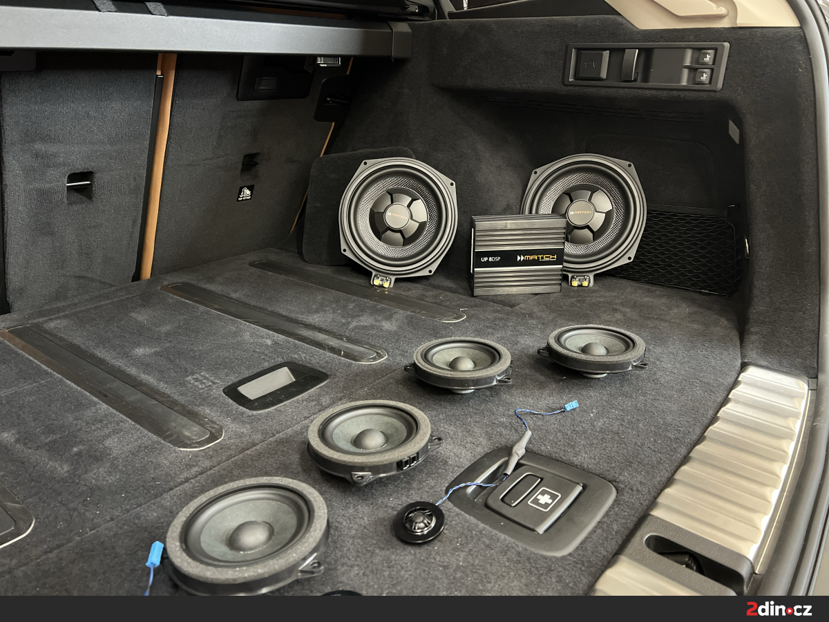 Pod přední sedadla byly instalovány speciální subwoofery Match UP W8BMW-S. Tyto výkonné woofery byly navrženy speciálně pro modely BMW a perfektně zapadají do originálních pozic bez nutnosti úprav. Jejich basová odezva je mimořádně hluboká a kontrolovaná, což ve spojení se zesilovačem s DSP procesorem dodává hudbě potřebnou hutnost a plnost. Díky důkladnému odhlučnění dveří si navíc můžete basové složky vychutnat naplno bez nežádoucích rezonancí.