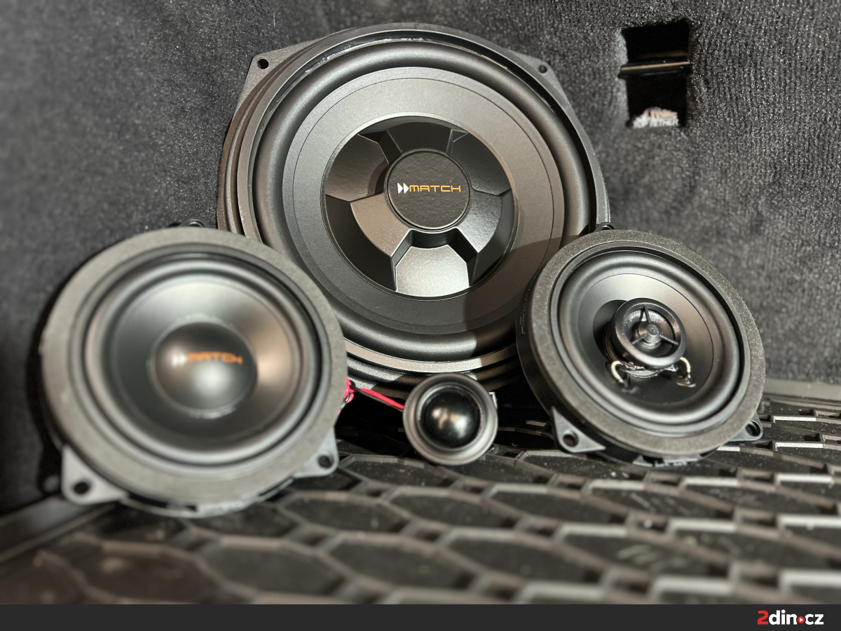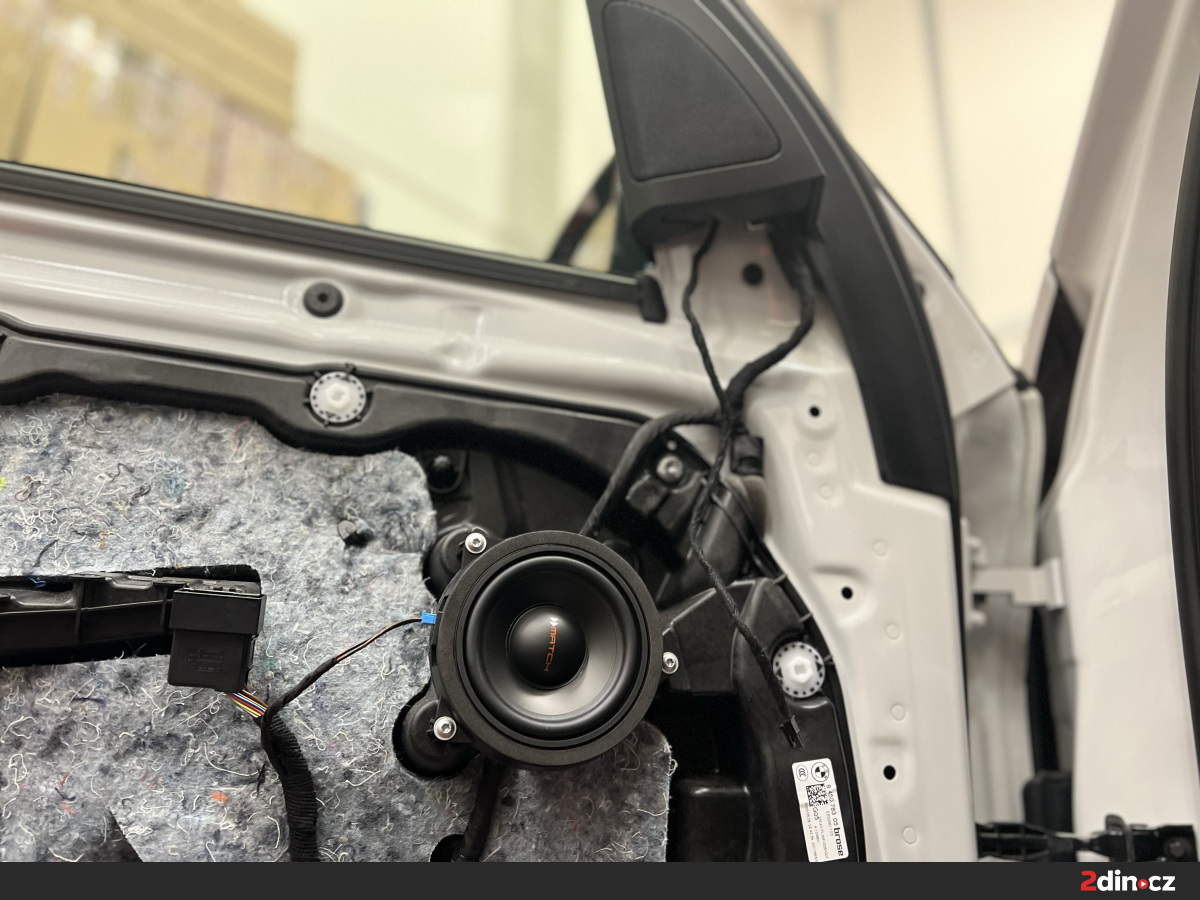 Pro zajištění čistého a detailního zvuku jsme do předních dveří instalovali komponentní reproduktory Match UP C42BMW-FRT.2, zatímco do těch zadních zamířily koaxiální reproduktory Match UP X4BMW-FRT.2. Oba typy jsou navrženy přímo pro modely BMW a umožňují bezproblémovou montáž na tovární pozice. Vyznačují se vysokou citlivostí, věrným podáním středů a příjemnými výškami, které nejsou agresivní ani unavující při delším poslechu. Reproduktory společně tvoří pevný základ pro novou zvukovou sestavu, přičemž díky zesilovači s DSP jsme je později vyladili tak, aby vznikla dokonalá zvuková scéna.