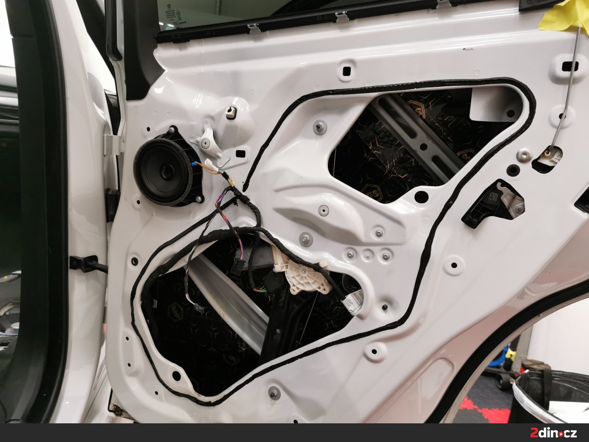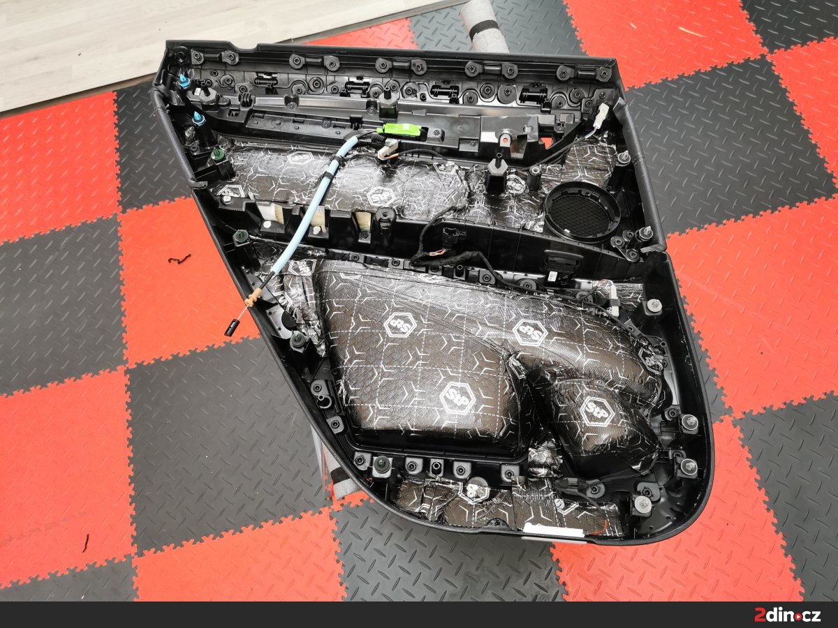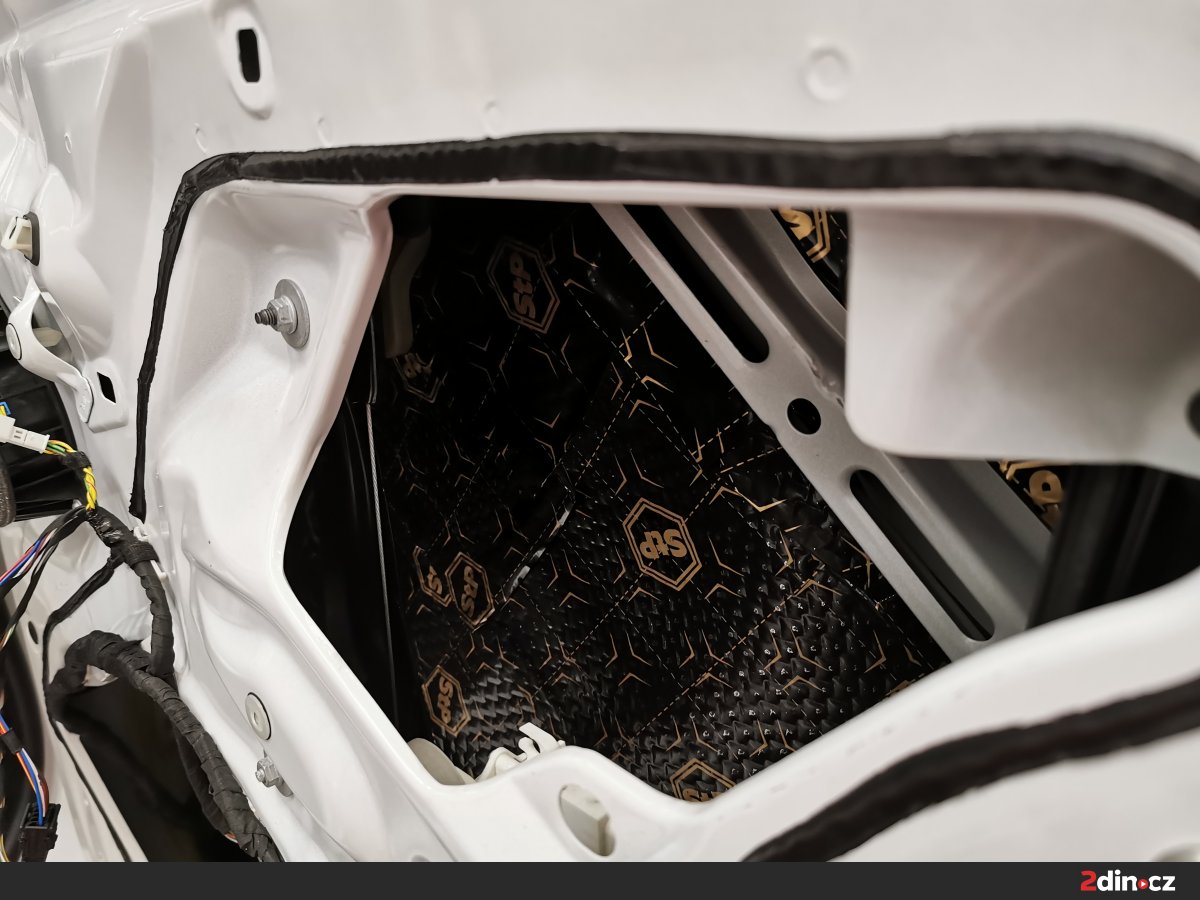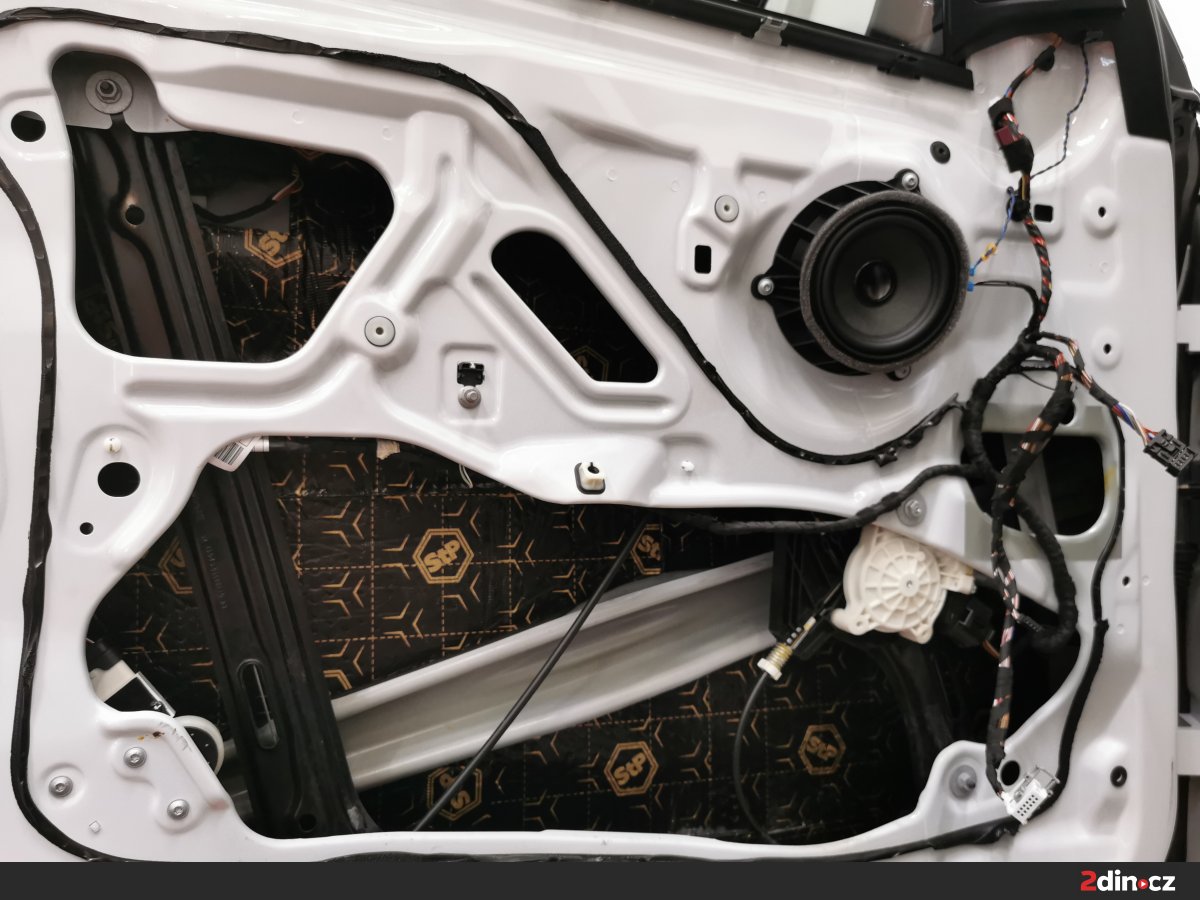 Dveře vozu byly upraveny ve třech vrstvách. Na kovové části byl aplikován antivibrační materiál STP Black Gold Camo, který účinně potlačuje rezonance a vibrace. Pro dodatečné zpevnění a zamezení přenosu hluku byl použit také STP Black Silver jako doplňková antivibrační vrstva. Na tapecírové části byla nanesena akustická pěna STP Biplast 10, která účinně pohlcuje vysokofrekvenční šum a odděluje kontaktní plochy plastů a kovu. Díky této kombinaci materiálů došlo ke znatelnému snížení vnějšího hluku a zlepšení akustiky uvnitř kabiny.