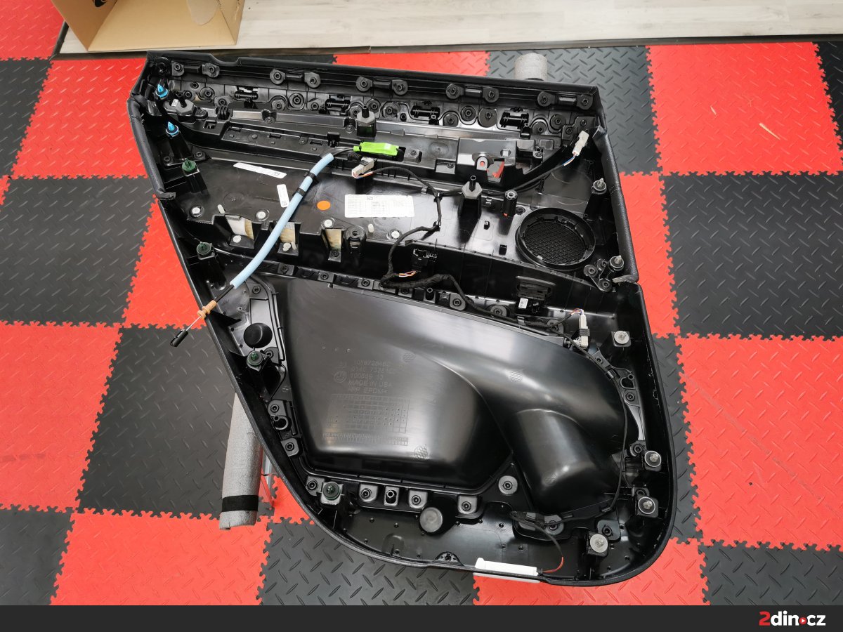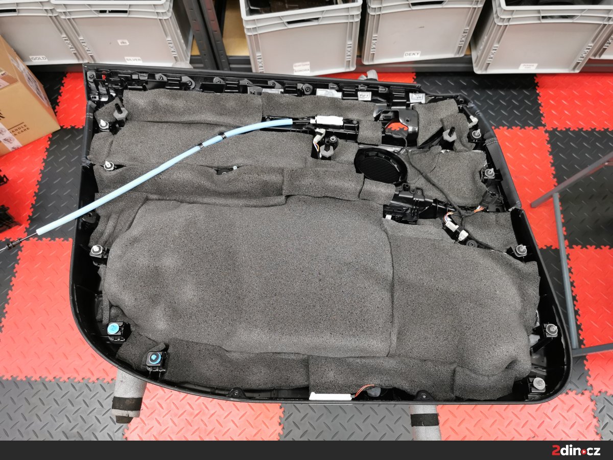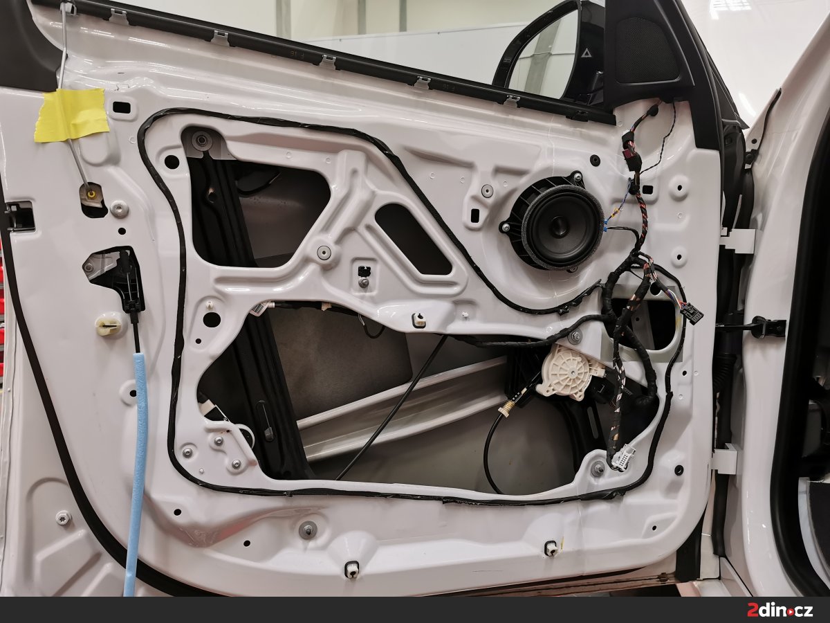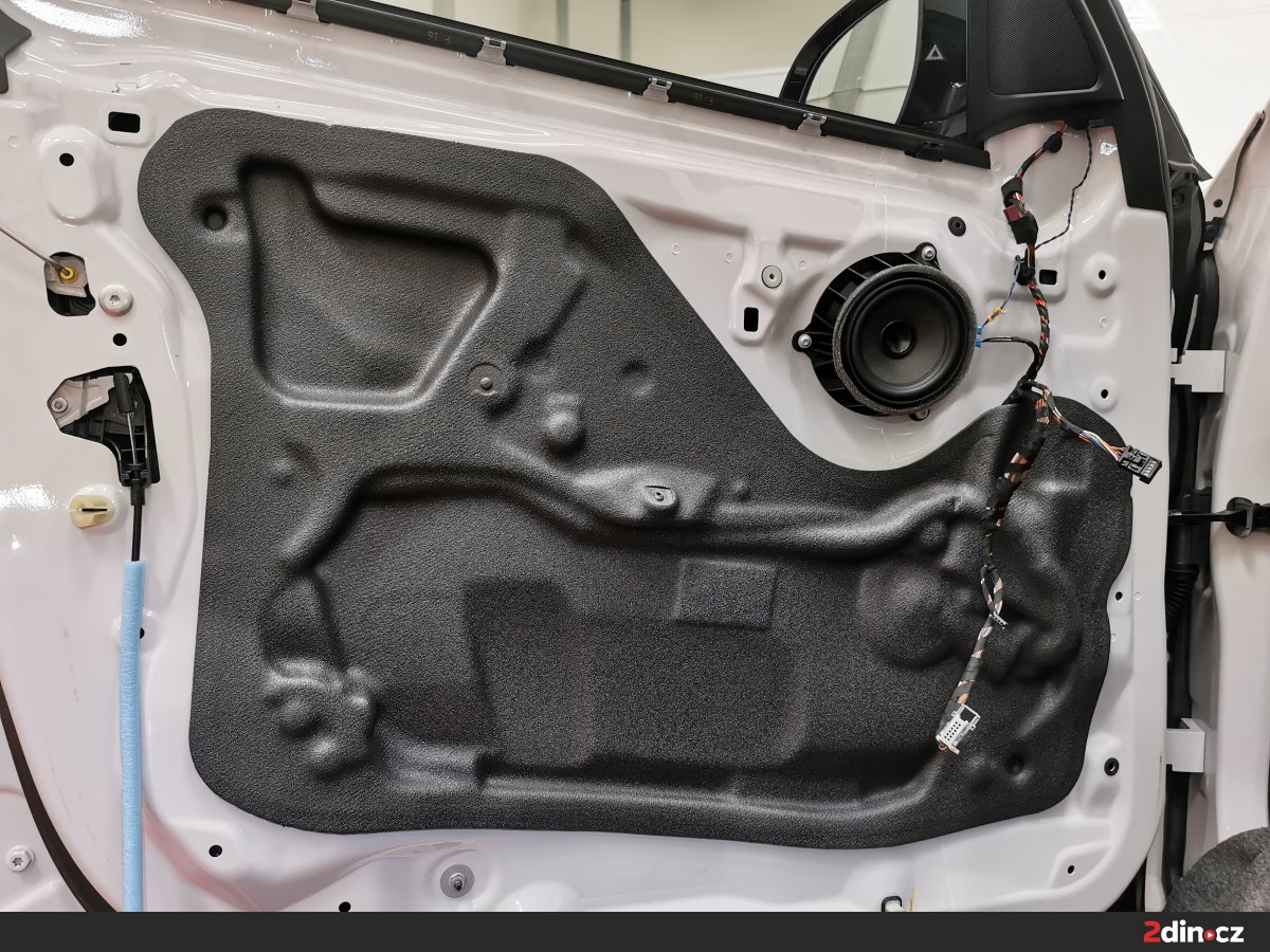 Dveře vozu byly upraveny ve třech vrstvách. Na kovové části byl aplikován antivibrační materiál STP Black Gold Camo, který účinně potlačuje rezonance a vibrace. Pro dodatečné zpevnění a zamezení přenosu hluku byl použit také STP Black Silver jako doplňková antivibrační vrstva. Na tapecírové části byla nanesena akustická pěna STP Biplast 10, která účinně pohlcuje vysokofrekvenční šum a odděluje kontaktní plochy plastů a kovu. Díky této kombinaci materiálů došlo ke znatelnému snížení vnějšího hluku a zlepšení akustiky uvnitř kabiny.