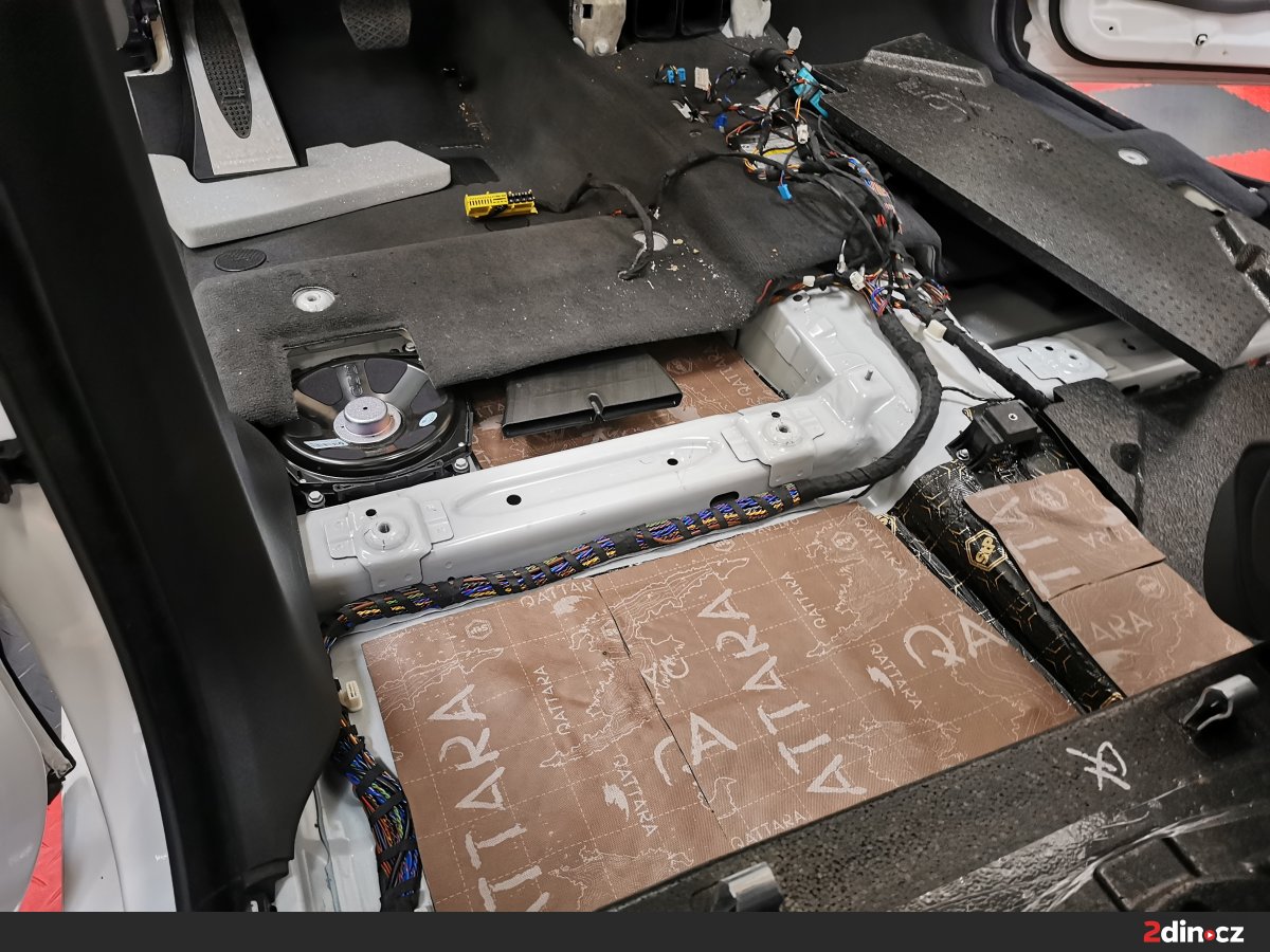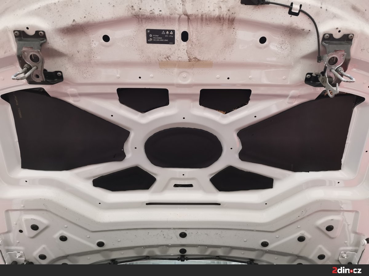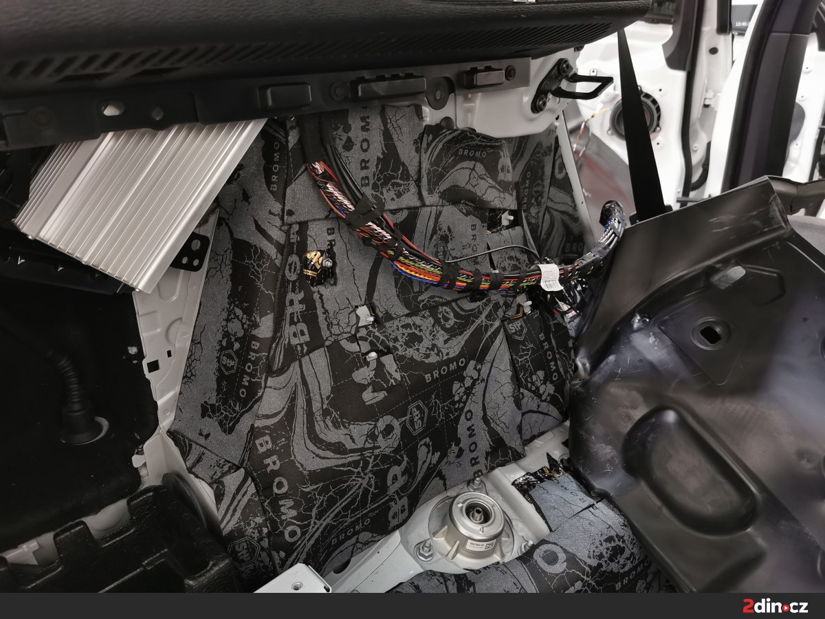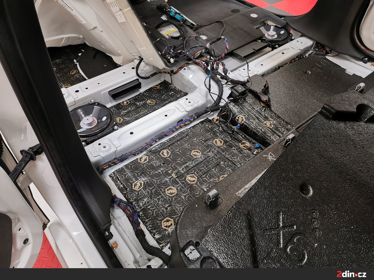 Podlaha BMW byla ošetřena systémem třívrstvého odhlučnění. Základ tvoří antivibrační vrstva STP Black Gold Camo, která výrazně zvyšuje tuhost podlahy a brání přenosu vibrací z podvozku. Druhou vrstvou je sendvičový materiál STP Bromo, který kombinuje zvukově izolační a pohltivou složku, čímž omezuje šíření nízkofrekvenčního hluku. Pro zvýšení tepelného komfortu byla navrch aplikována vrstva termoakustického materiálu Neoprene 10. Výsledkem je podlaha, která minimalizuje hluk od silnice a zároveň přispívá ke stabilní teplotě v interiéru.