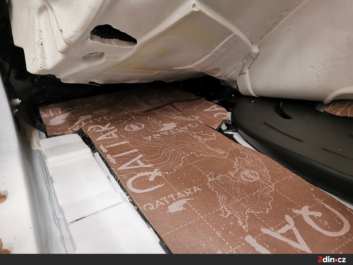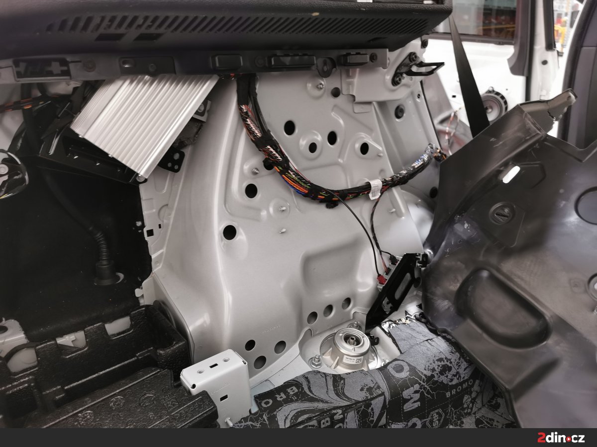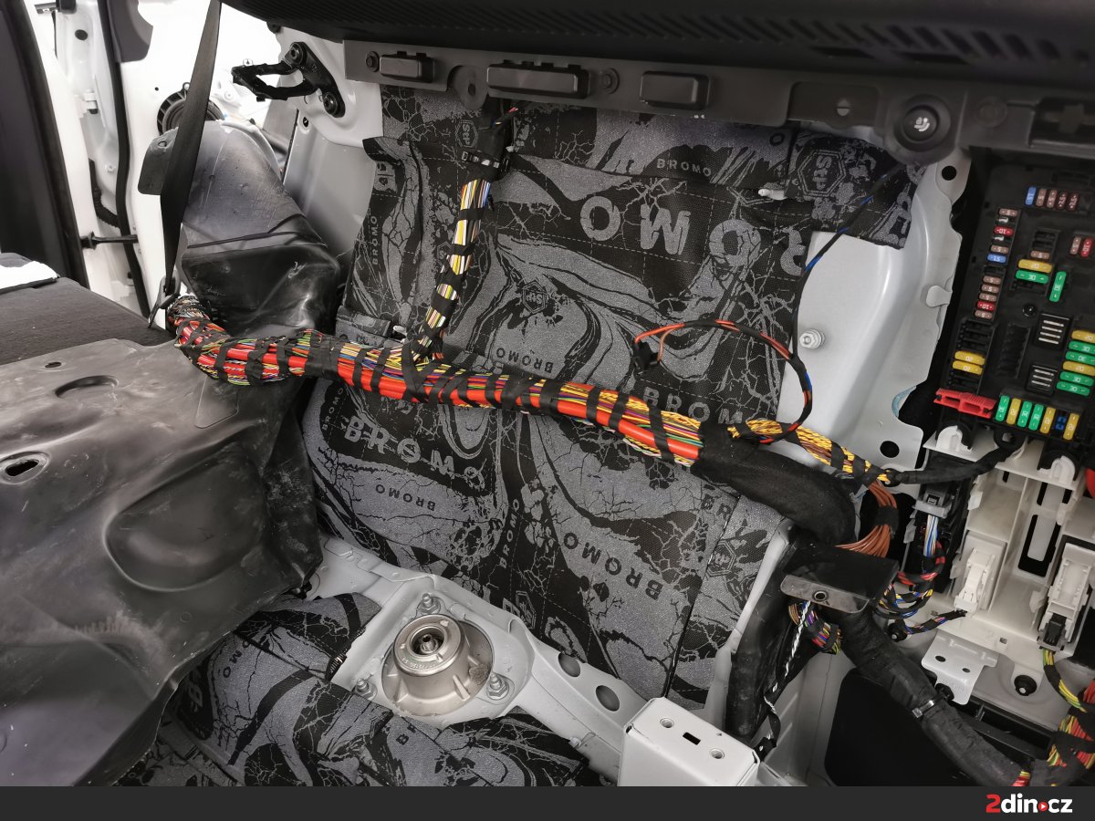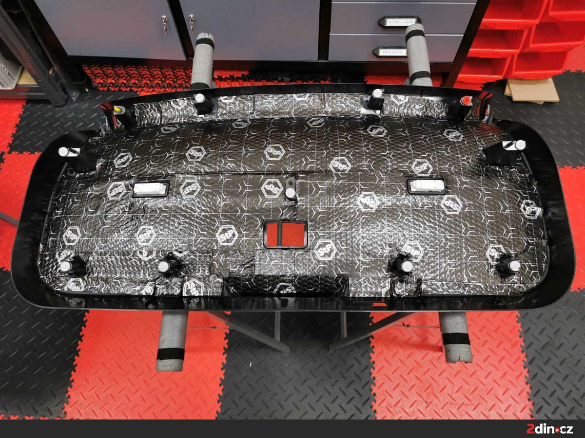Podlaha BMW byla ošetřena systémem třívrstvého odhlučnění. Základ tvoří antivibrační vrstva STP Black Gold Camo, která výrazně zvyšuje tuhost podlahy a brání přenosu vibrací z podvozku. Druhou vrstvou je sendvičový materiál STP Bromo, který kombinuje zvukově izolační a pohltivou složku, čímž omezuje šíření nízkofrekvenčního hluku. Pro zvýšení tepelného komfortu byla navrch aplikována vrstva termoakustického materiálu Neoprene 10. Výsledkem je podlaha, která minimalizuje hluk od silnice a zároveň přispívá ke stabilní teplotě v interiéru.