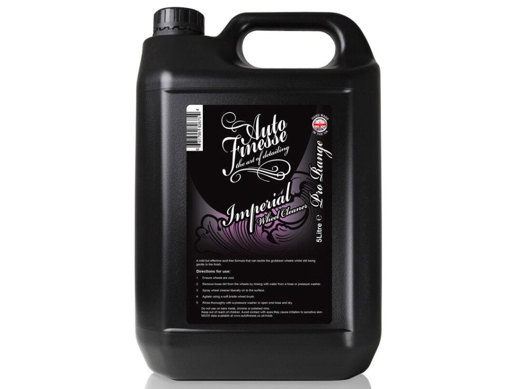 Dokonale pěnivý a nekyselý. V případě, že jsou litá kola vašeho auta silně znečištěna brzdovým prachem a autošampoon není schopen toto znečištění důkladně a bezpečně odstranit, je na řadě Imperial Wheel Cleaner. Maximálně bezpečný a účinný čistič kol a pneumatik je souznění čističe a odmašťovadla. Imperial je skvělým a hlavně bezpečným pomocníkem v kontaktním mytí. Dokonale a s lehkostí odstraní nahromaděný brzdný prach a silniční znečištění. Je extrémně pěnivý a díky tomu snadno vyčistí kola vašeho auta snadno a rychle. Čištění kol bude rázem hračka. Výrobky Auto Finesse jsou profesionální produkty, určené pro zkušené detailery a profesionální salony. Práce s Imperial je tak výjimečná, že ji zvládne i nadšený začátečník. Při vývoji Imperial se ukázalo, že je daleko schopnější a rychlejší než agresivní, kyselé čističe. Jeho výjimečně vybalancované pH je ideální i pro leštěná kola. Auto Finesse Imperial je zhuštěný přípravek v balení po 1 a 5 litrech. Je nutno přípravek vždy naředit do mixovací láhve a to v poměru 1 :2 až do poměru 1 : 10.