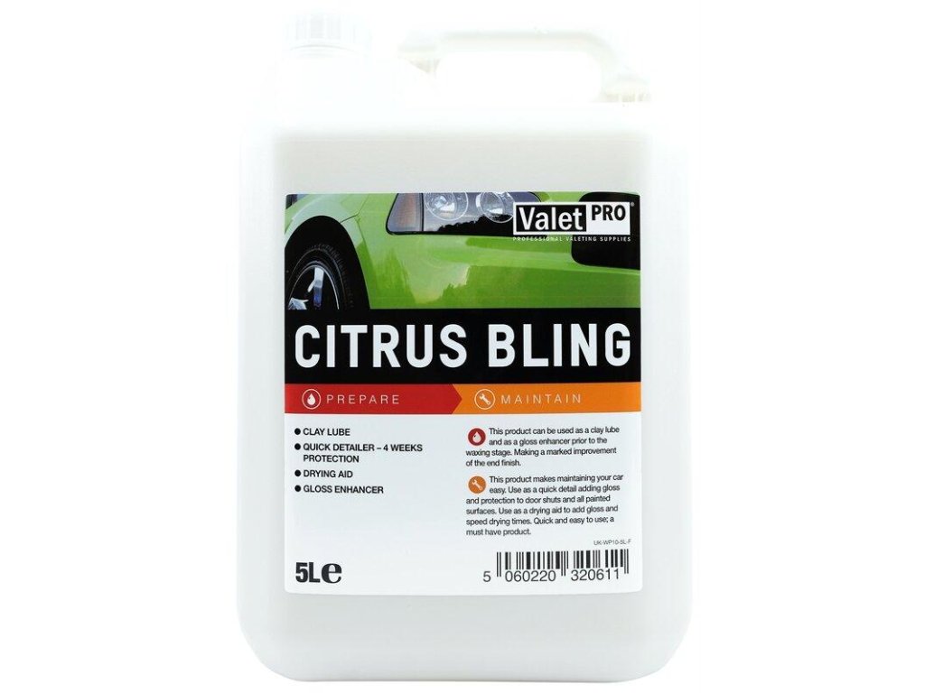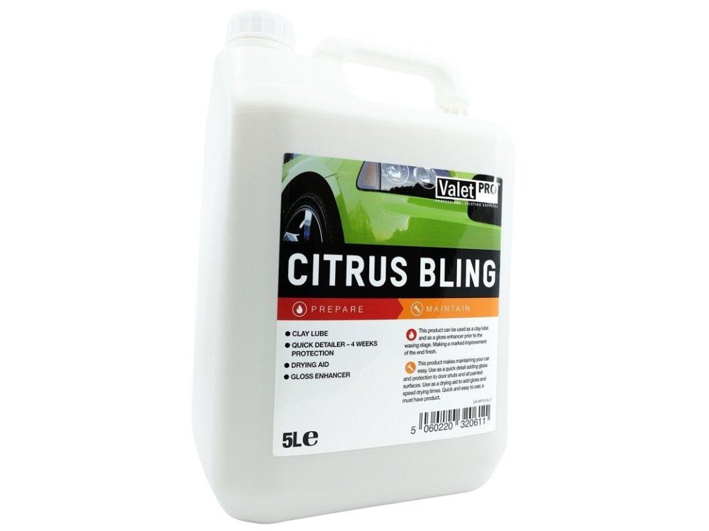 ValetPro Citrus Bling je detailer určený pro vylepšení lesku disků a laku, kterým navíc dodá ochrannou vrstvu. Stačí ho jen nastříkat a poté setřít. Díky obsahu silikonu a vosku dokáže vytvořit tenkou vrstvu mezi lakovaným povrchem a clayem – tím se minimalizuje riziko poškození povrchu vašeho automobilu.