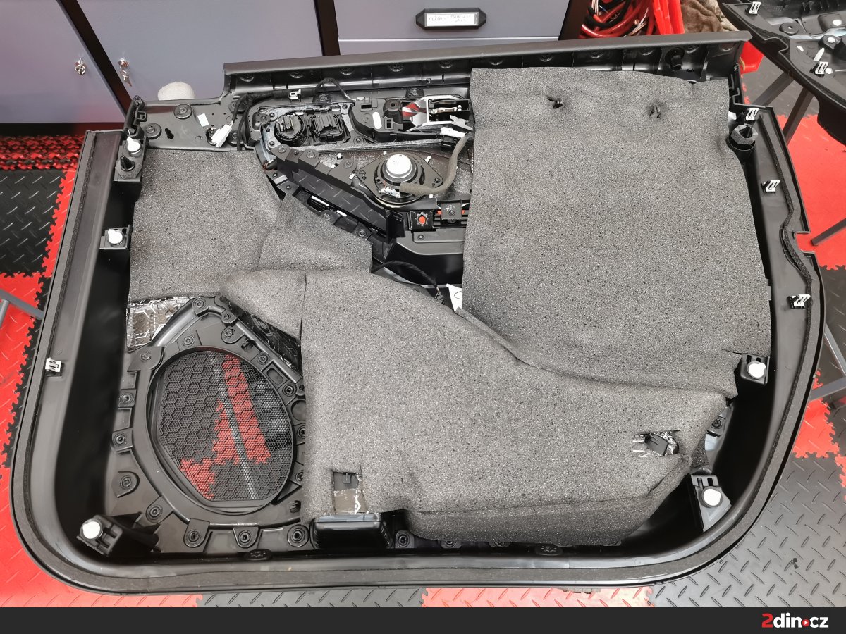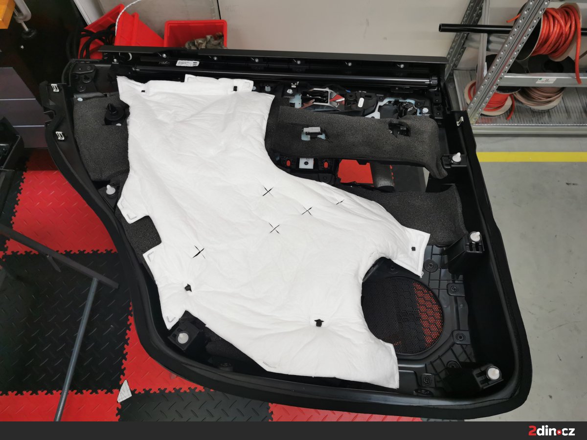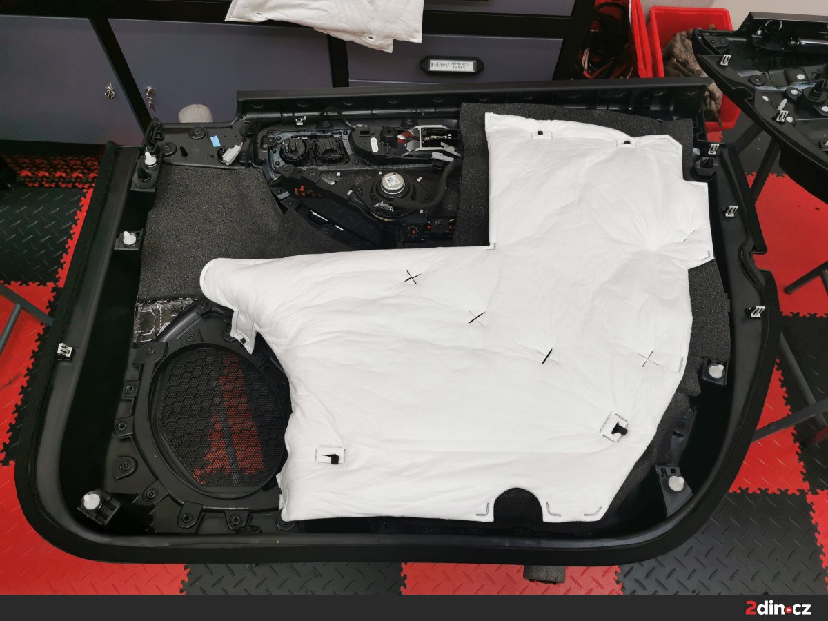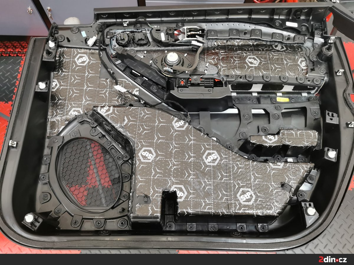 Dveře vozu byly odhlučněny kombinací antivibračních a akustických materiálů, aby bylo dosaženo maximální eliminace vibrací a hluku z vnějšího prostředí. Na vnitřní části plechů dveří byl aplikován antivibrační materiál STP Black Gold Camo, který výrazně zpevňuje konstrukci dveří a minimalizuje rezonance. Pro jemnější části a těžko přístupné zóny byl použit tenčí antivibrační materiál STP Black Silver. Následně byla na tapecírung nanesena akustická pěna STP Biplast 10, která výborně absorbuje vnější hluk a zároveň zabraňuje přenosu vibrací mezi plastovými a kovovými částmi dveří. Tím se vytvořilo efektivní akustické prostředí, které přispívá ke kvalitnějšímu ozvučení a tiššímu interiéru.