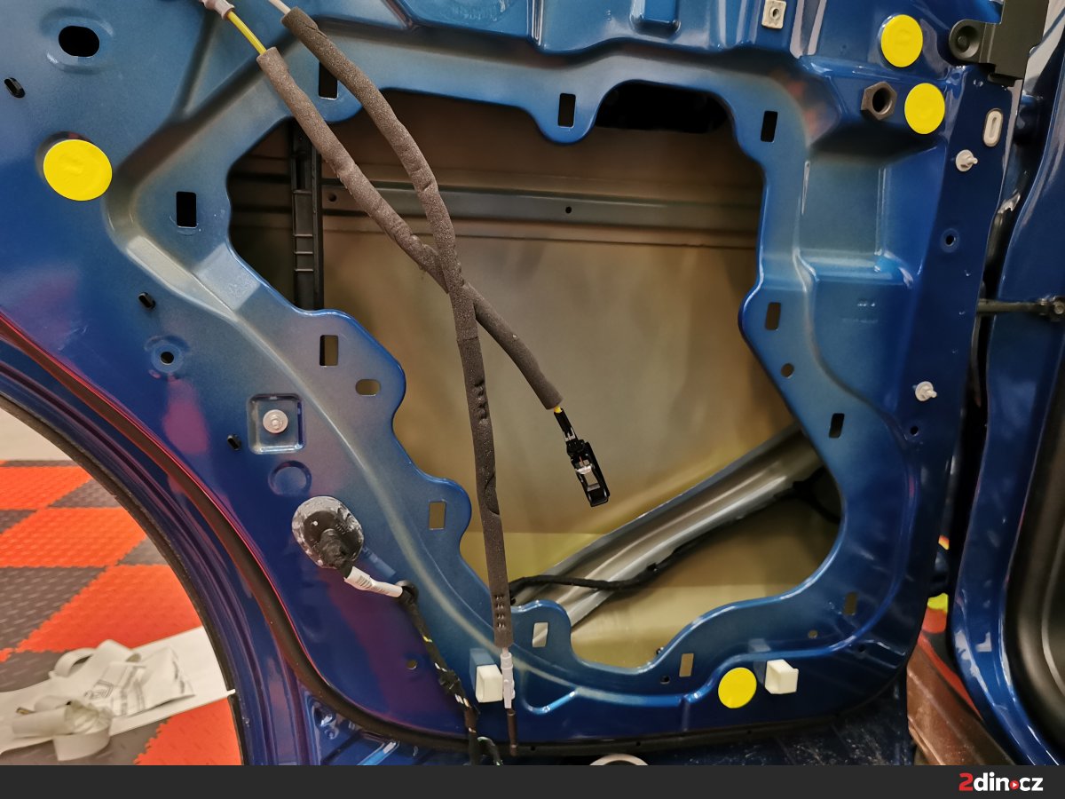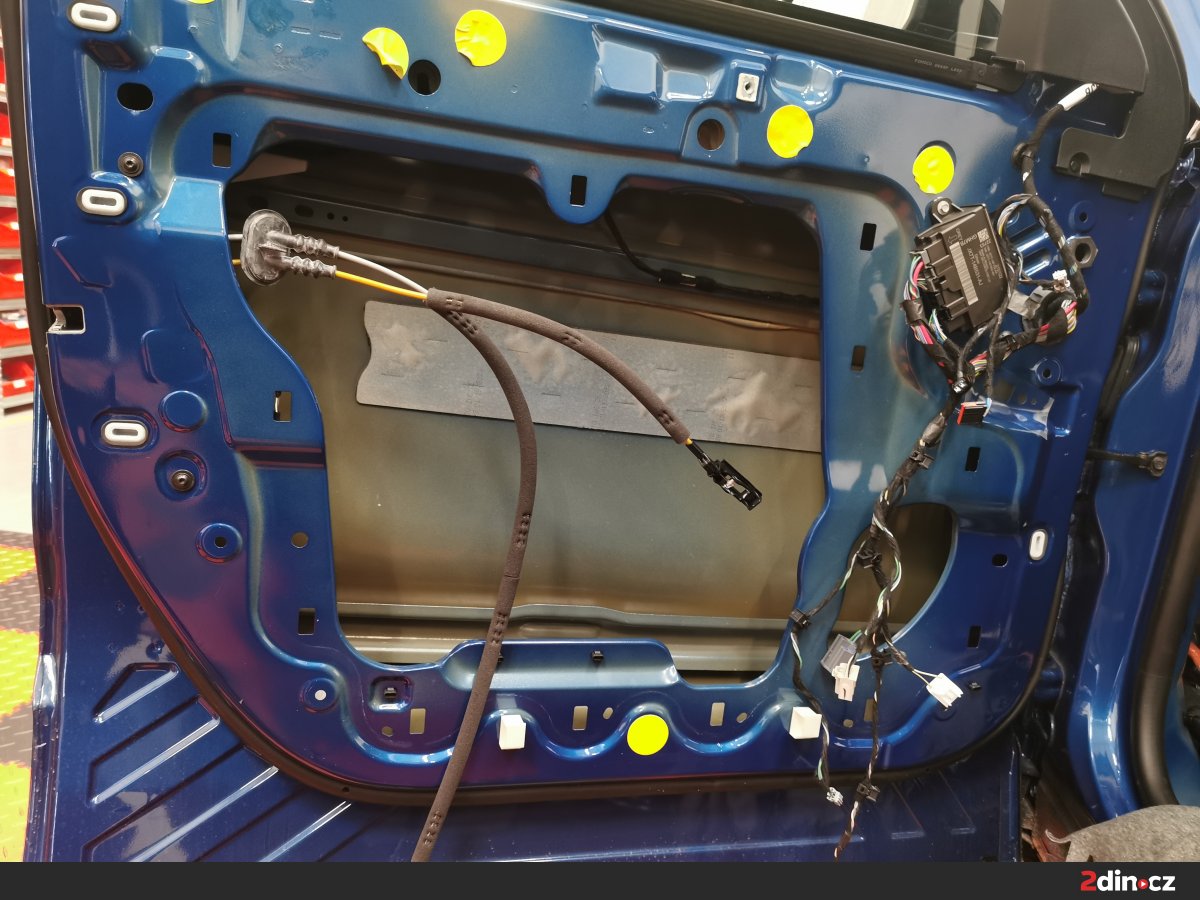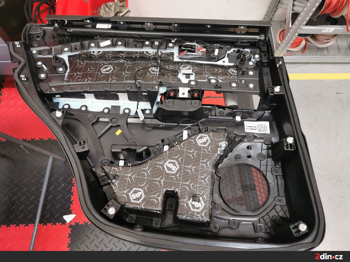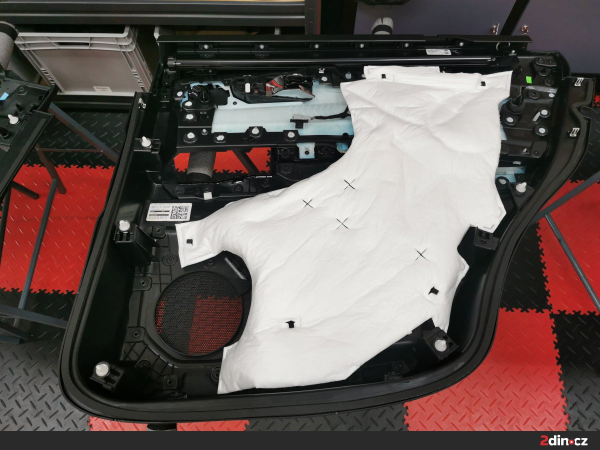 Dveře vozu byly odhlučněny kombinací antivibračních a akustických materiálů, aby bylo dosaženo maximální eliminace vibrací a hluku z vnějšího prostředí. Na vnitřní části plechů dveří byl aplikován antivibrační materiál STP Black Gold Camo, který výrazně zpevňuje konstrukci dveří a minimalizuje rezonance. Pro jemnější části a těžko přístupné zóny byl použit tenčí antivibrační materiál STP Black Silver. Následně byla na tapecírung nanesena akustická pěna STP Biplast 10, která výborně absorbuje vnější hluk a zároveň zabraňuje přenosu vibrací mezi plastovými a kovovými částmi dveří. Tím se vytvořilo efektivní akustické prostředí, které přispívá ke kvalitnějšímu ozvučení a tiššímu interiéru.