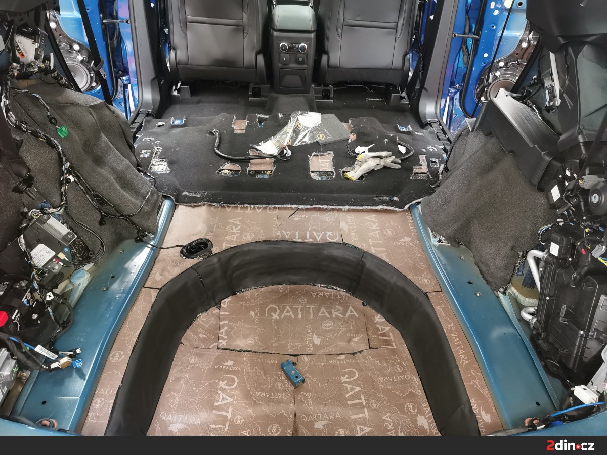 Podlaha Fordu Explorer byla ošetřena ve dvou vrstvách – nejprve byla plocha pokryta antivibračním materiálem STP Black Gold Camo, který zpevňuje konstrukci a zabraňuje šíření vibrací z podvozku do kabiny. Následně byl aplikován termoakustický materiál STP AeroFlex 3, jenž zároveň poskytuje protihlukovou a tepelnou izolaci. Tento typ materiálu je ideální právě pro exponované plochy, jako je podlaha, kde dochází k přenosu hluku od kol, silnice a náprav. Celkový výsledek přináší zásadní zlepšení komfortu a eliminuje nežádoucí nízkofrekvenční hluk, který je při dlouhých jízdách mimořádně únavný.