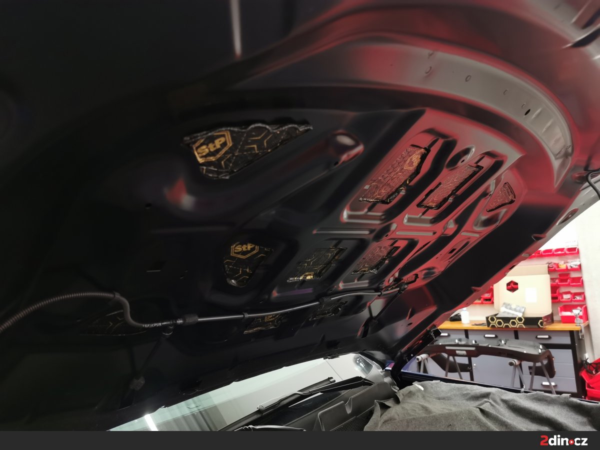 Kapota a mezimotorový prostor byly ošetřeny s důrazem na omezení hluku motoru a vibrací šířících se do kabiny. První vrstvou aplikovanou na vnitřní stranu kapoty byl opět osvědčený antivibrační materiál STP Black Silver, který zpevňuje plech a zabraňuje rezonancím. Následně byla použita silnější vrstva termoakustického materiálu STP AeroFlex 10, který vyniká odolností vůči teplotám a zároveň poskytuje vysokou úroveň zvukové izolace. Díky této kombinaci se výrazně snížil hluk motoru pronikající do kabiny, a to i při akceleraci nebo vyšší zátěži motoru.