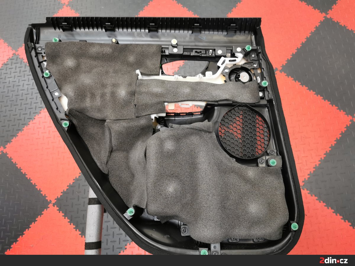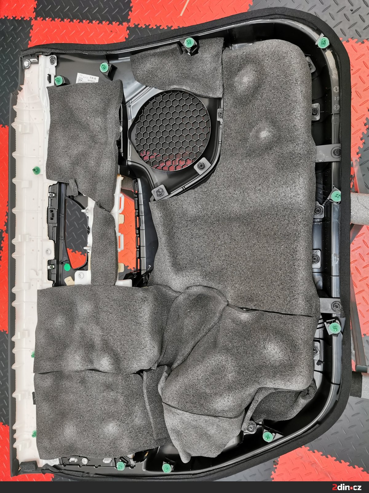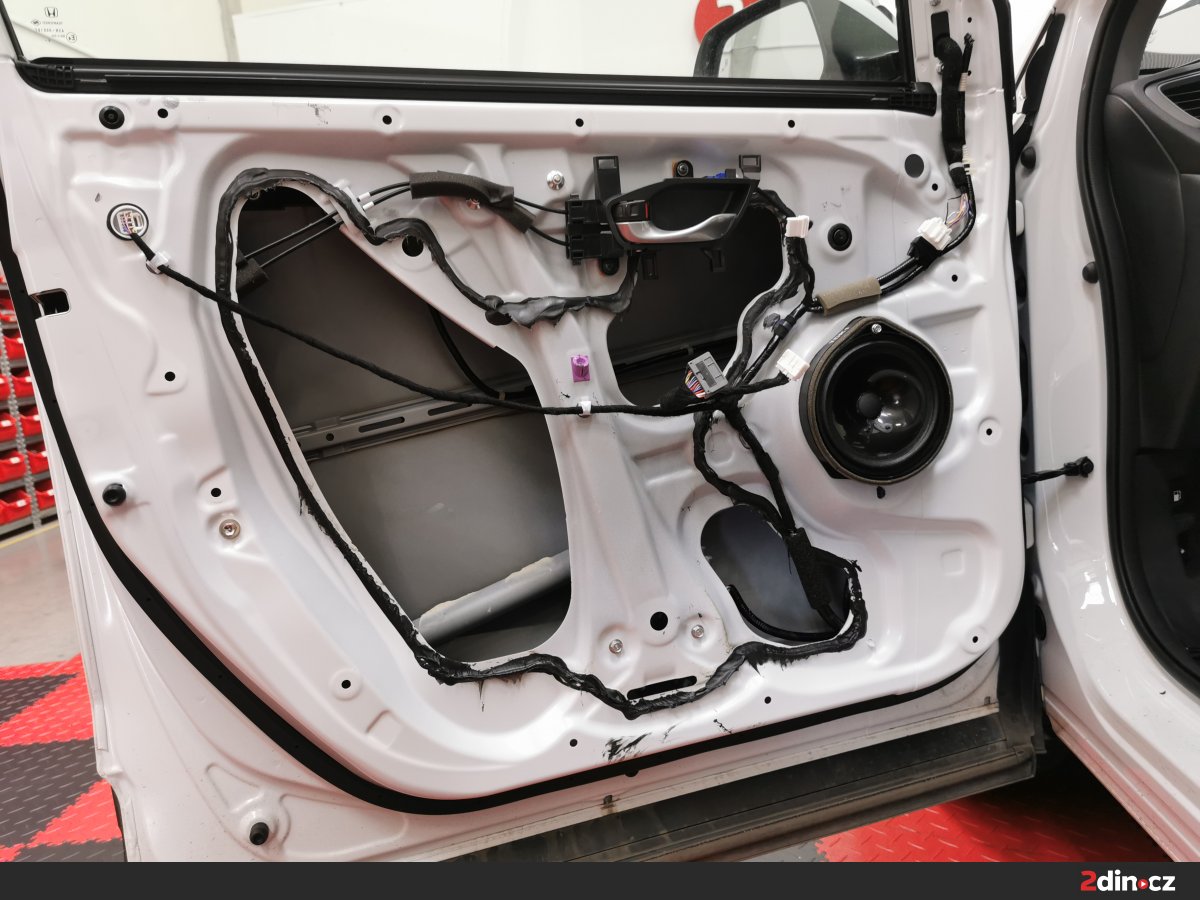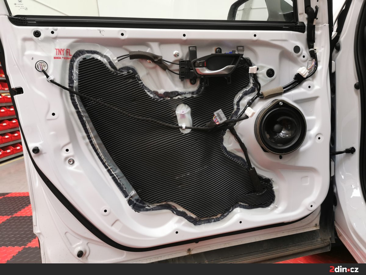 Dveře této Hondy byly z výroby odhlučněny jen minimálně, což se projevovalo jak přenosem hluku z okolí, tak i rezonancemi při vyšších rychlostech nebo při zavírání. Prvním krokem bylo zpevnění plechů pomocí antivibračního materiálu STP Black Silver, který eliminuje rezonance a zpevňuje konstrukci. Na něj byla aplikována vrstva akustického materiálu STP Biplast 10, jež tlumí vysokofrekvenční hluk a eliminuje pazvuky z plastových částí. Výsledkem této kombinace je nejen znatelné snížení hlučnosti, ale i výrazné zlepšení funkčnosti audiosystému – reproduktory nyní hrají čistěji díky lepší ozvučnici. Navíc došlo ke kompletnímu potlačení vrzání a vibrací, čímž se výrazně zvýšila celková kvalita prostředí interiéru.