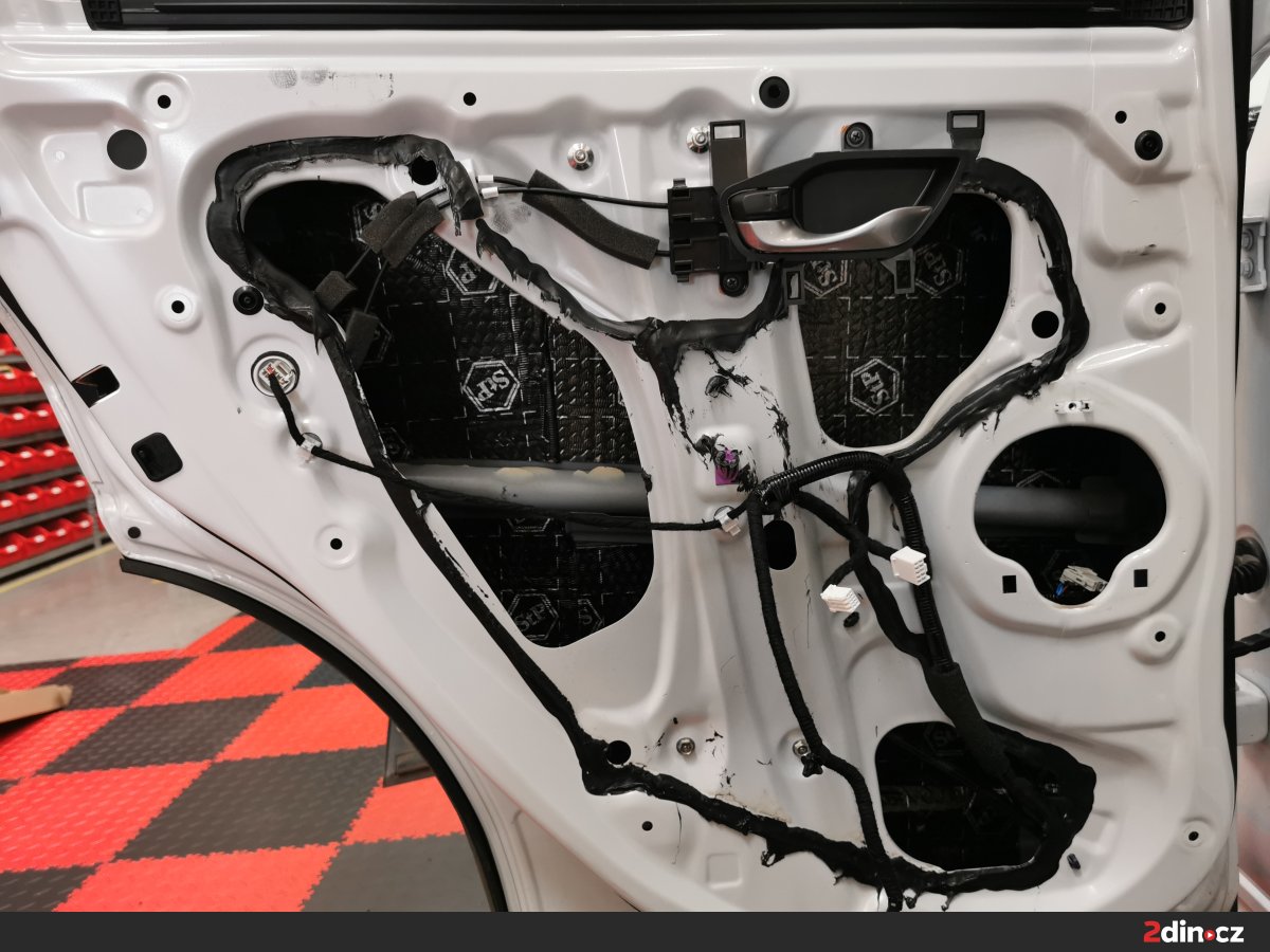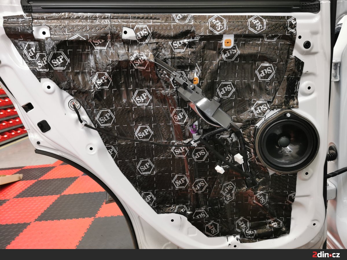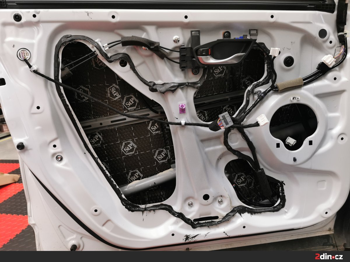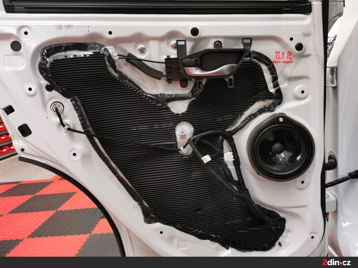 Dveře této Hondy byly z výroby odhlučněny jen minimálně, což se projevovalo jak přenosem hluku z okolí, tak i rezonancemi při vyšších rychlostech nebo při zavírání. Prvním krokem bylo zpevnění plechů pomocí antivibračního materiálu STP Black Silver, který eliminuje rezonance a zpevňuje konstrukci. Na něj byla aplikována vrstva akustického materiálu STP Biplast 10, jež tlumí vysokofrekvenční hluk a eliminuje pazvuky z plastových částí. Výsledkem této kombinace je nejen znatelné snížení hlučnosti, ale i výrazné zlepšení funkčnosti audiosystému – reproduktory nyní hrají čistěji díky lepší ozvučnici. Navíc došlo ke kompletnímu potlačení vrzání a vibrací, čímž se výrazně zvýšila celková kvalita prostředí interiéru.