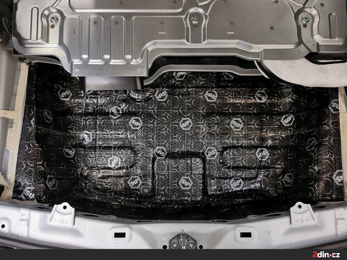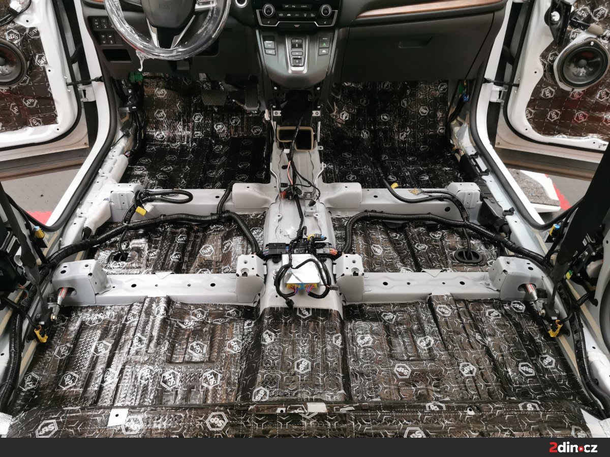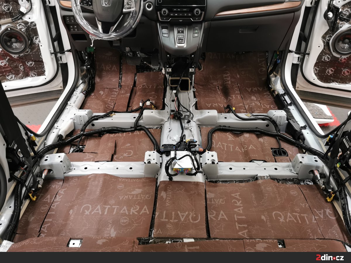 Podlaha představuje klíčovou oblast, kde dochází k přenosu valivého hluku od kol a vibrací od podvozku. Původní izolace byla u CR-V minimální, proto jsme zde použili dvě hlavní vrstvy. Nejprve STP Black Silver jako antivibrační základ pro potlačení rezonancí kovového plechu. Na tuto vrstvu byla aplikována kombinace protihlukového materiálu STP Qattara a termoakustického materiálu STP AeroFlex 6, která zajistila nejen pohlcení zbylého hluku, ale také stabilizaci teploty v interiéru. Celkový efekt přinesl znatelné zklidnění interiéru i při jízdách po horších silnicích, lepší akustiku prostoru a snížení nežádoucích vibrací, které dříve prostupovaly do kabiny.