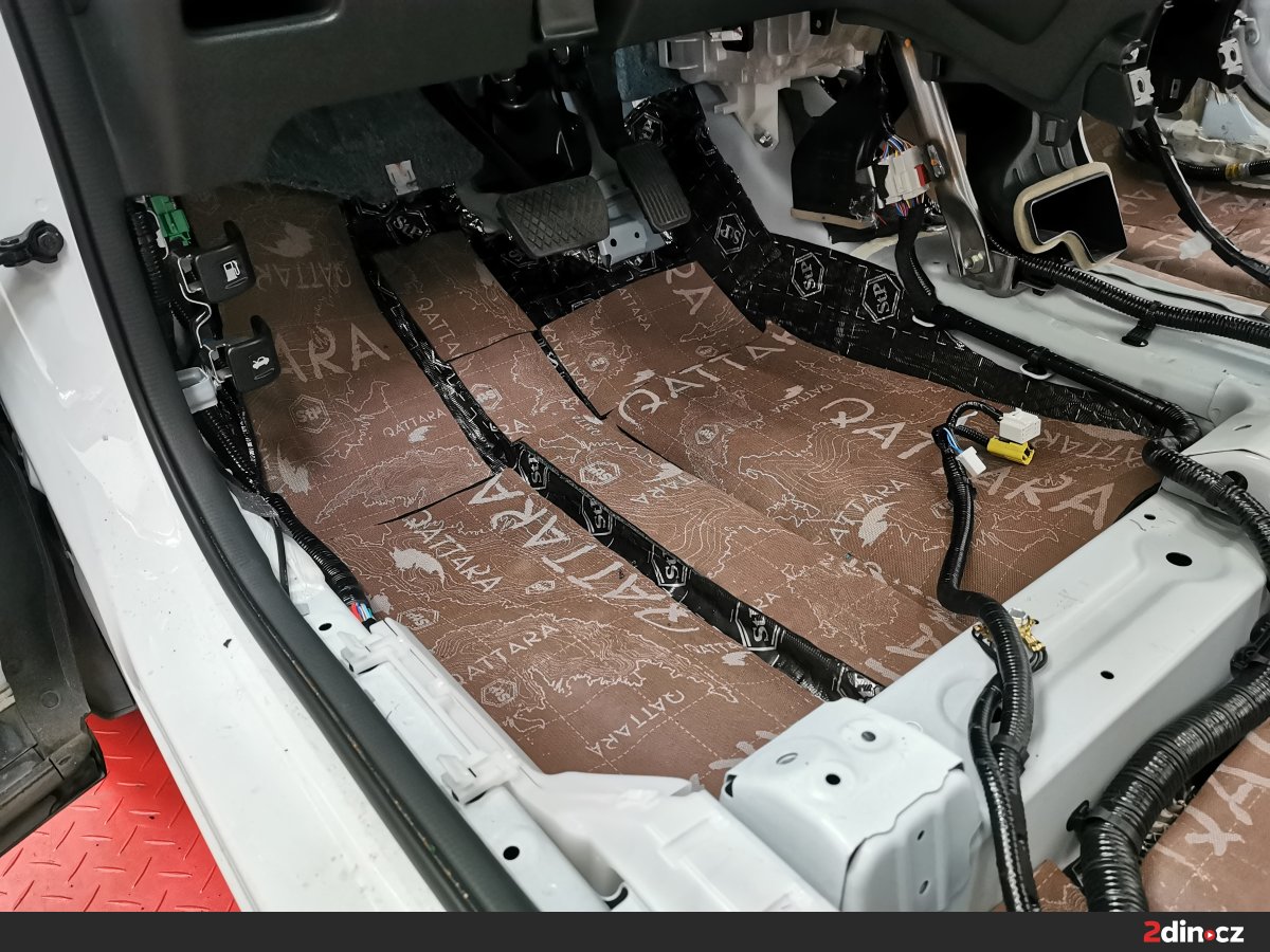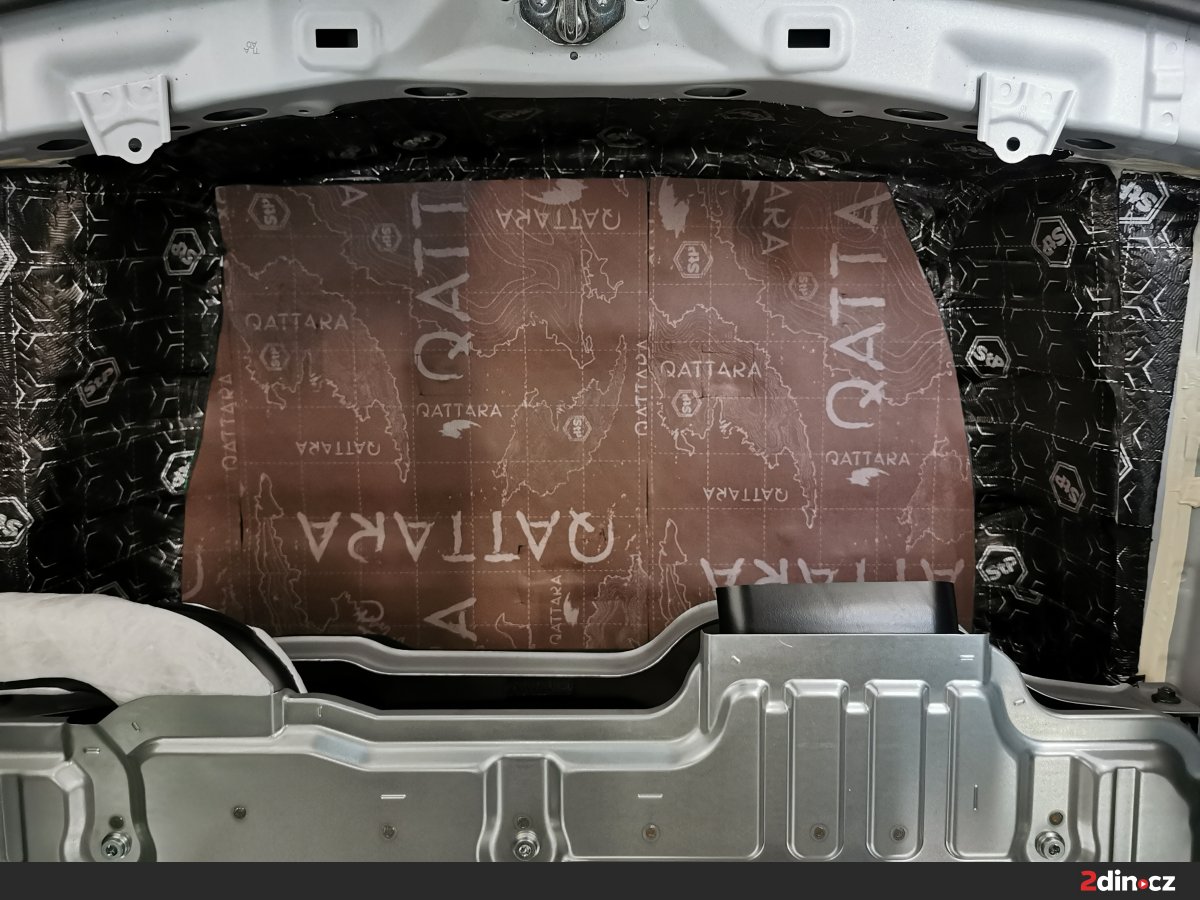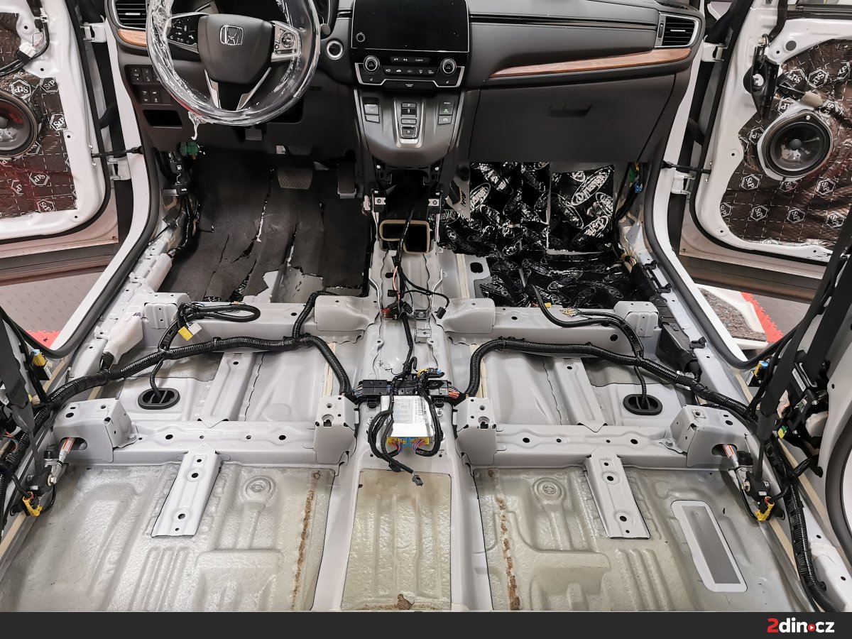 Podlaha představuje klíčovou oblast, kde dochází k přenosu valivého hluku od kol a vibrací od podvozku. Původní izolace byla u CR-V minimální, proto jsme zde použili dvě hlavní vrstvy. Nejprve STP Black Silver jako antivibrační základ pro potlačení rezonancí kovového plechu. Na tuto vrstvu byla aplikována kombinace protihlukového materiálu STP Qattara a termoakustického materiálu STP AeroFlex 6, která zajistila nejen pohlcení zbylého hluku, ale také stabilizaci teploty v interiéru. Celkový efekt přinesl znatelné zklidnění interiéru i při jízdách po horších silnicích, lepší akustiku prostoru a snížení nežádoucích vibrací, které dříve prostupovaly do kabiny.