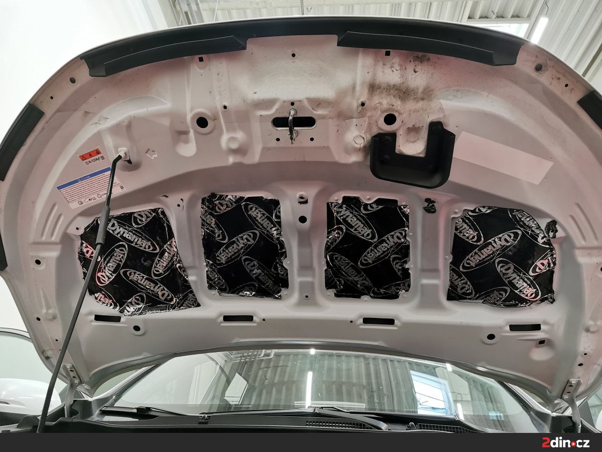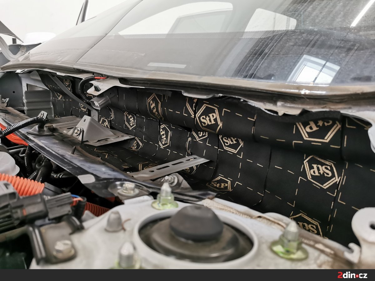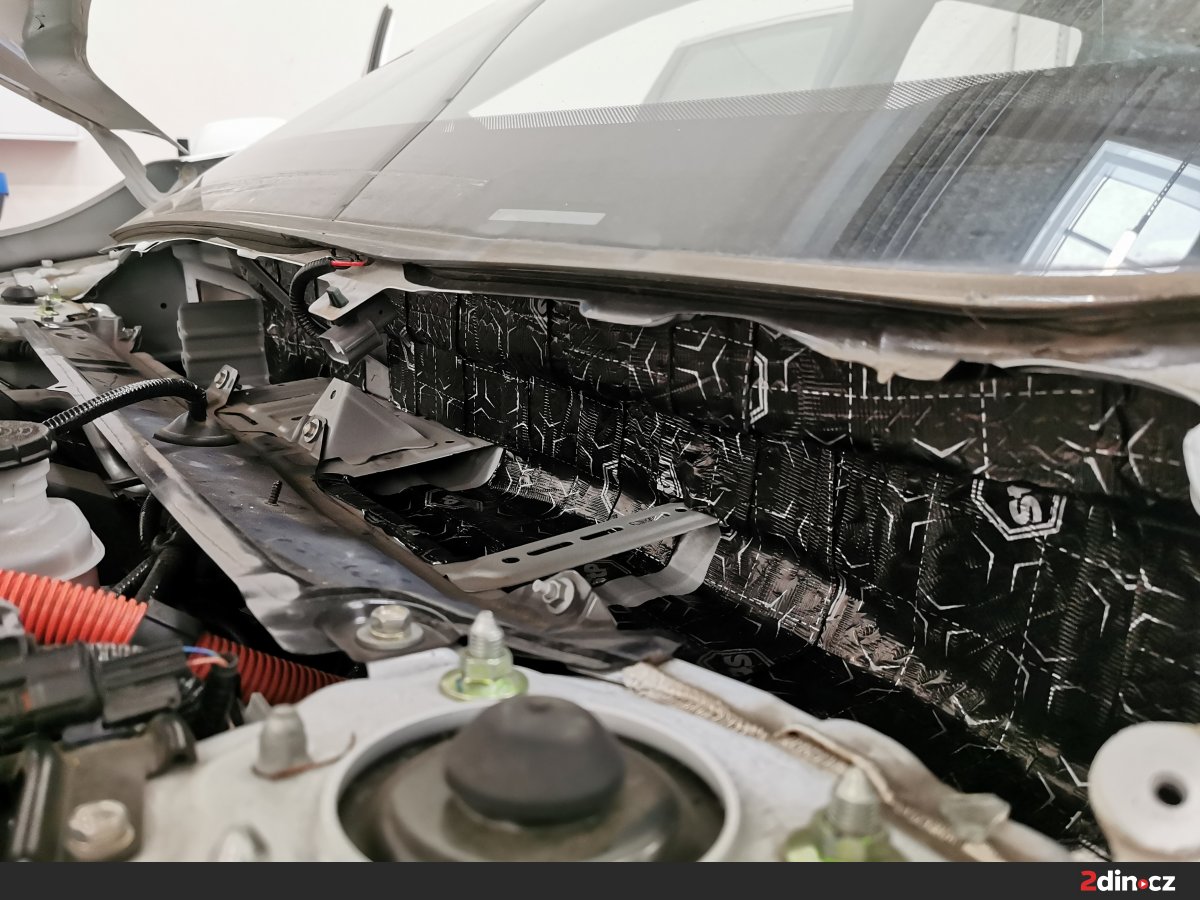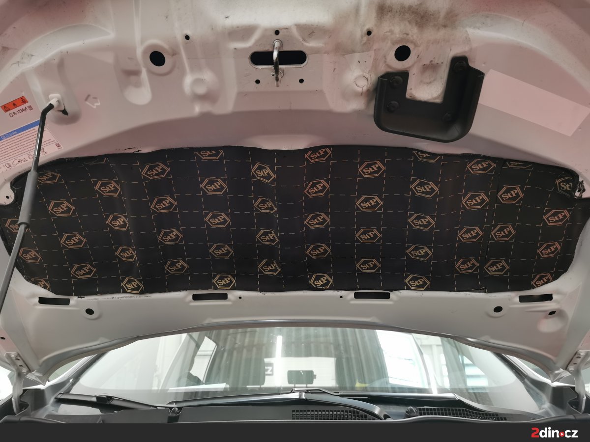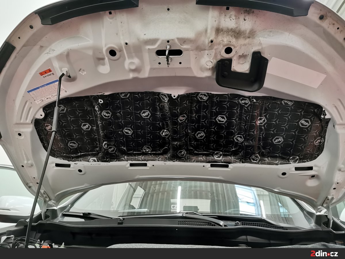 Prostor mezi kabinou a motorem je tradičně jedou z nejhlučnějších oblastí, a to platí i u Hondy CR-V. Nejprve jsme zde aplikovali antivibrační materiál STP Black Silver, který slouží jako základ pro potlačení vibrací z motorového lože a karoserie. Následně byl použit termoakustický materiál STP AeroFlex 6, který zamezuje šíření tepla a výrazně pohlcuje zvukové frekvence typické pro motorový chod. Na samotnou kapotu byla navíc aplikována kombinace materiálů, která pomáhá odrazit hluk směrem ven, čímž se snižuje míra jeho vnikání do kabiny. Výsledkem je tišší kabina při akceleraci i klidnějším volnoběhu a vyšší tepelný komfort.