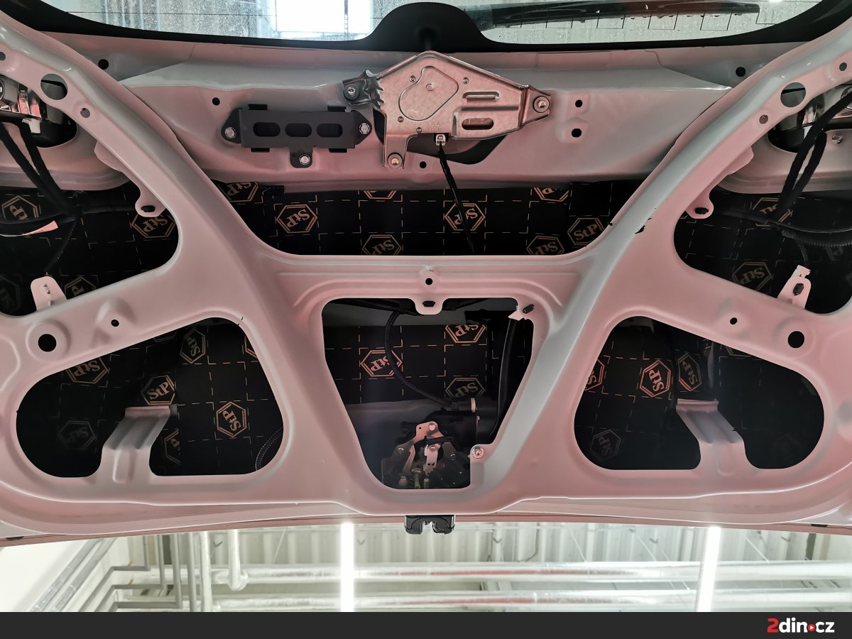 Prostor kufru u Hondy CR-V přenášel výrazné množství hluku, především od zadní nápravy a pneumatik. V rámci odhlučnění byla tato oblast řešena jako pokračování podlahy – základ tvoří STP Black Silver, který byl aplikován na kovové části dna a boků kufru. Následně byly použity vrstvy STP Sonora a STP Qattara, jejichž kombinace výborně absorbuje vibrace a zároveň izoluje zvukově i tepelně. Díky tomuto řešení se podařilo výrazně ztišit zadní část vozu, zamezit šíření hlubokých frekvencí do kabiny a vytvořit kompaktní, akusticky stabilní zavazadlový prostor, který nijak nenarušuje klidný dojem z jízdy.