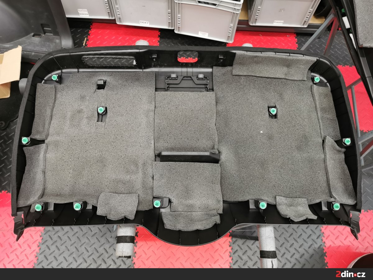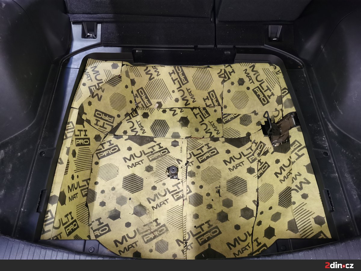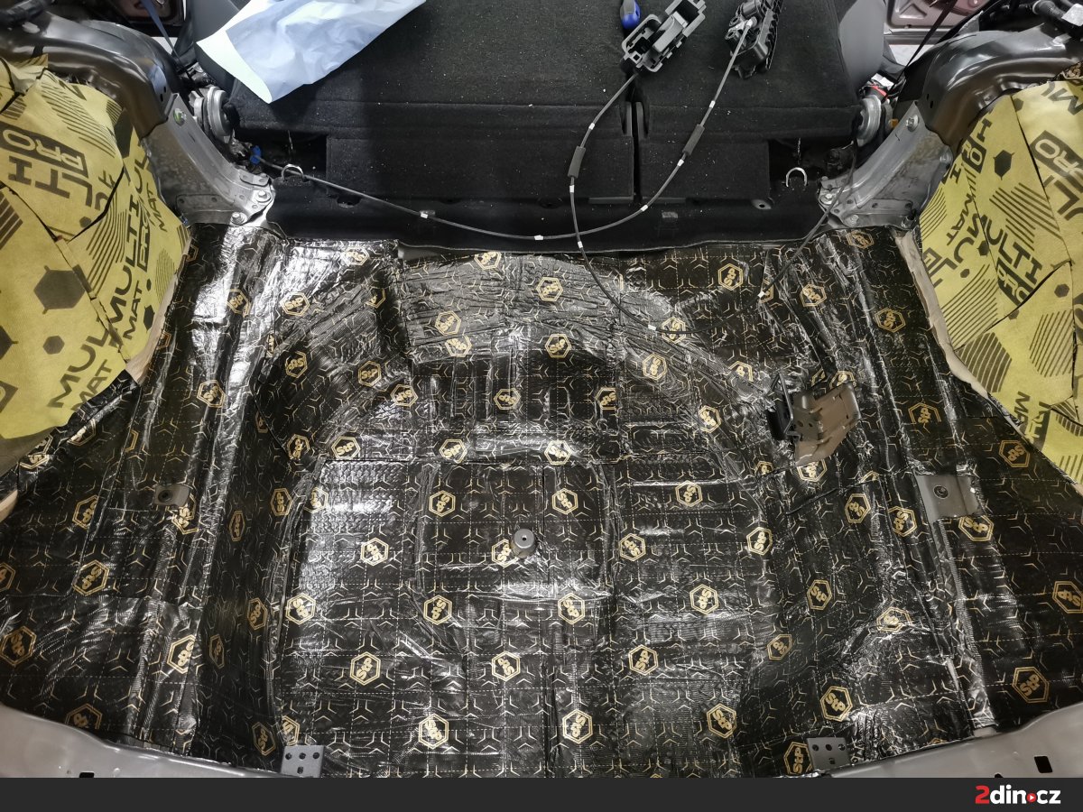 U kufru jsme postupovali stejně pečlivě jako u podlahy. Na plechové části byla aplikována antivibrační vrstva STP Black Gold Camo, která snížila rezonance. Následně byla použita kombinace CTK Multimat PRO a STP AeroFlex 3, které vytvářejí účinnou zvukovou a tepelnou bariéru. Díky této aplikaci se znatelně snížil hluk od výfuku, zadní nápravy a kol, což zajišťuje klidné prostředí i pro cestující na zadních sedadlech.