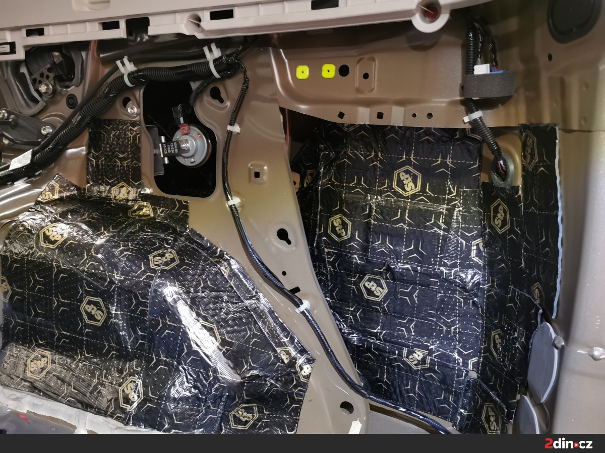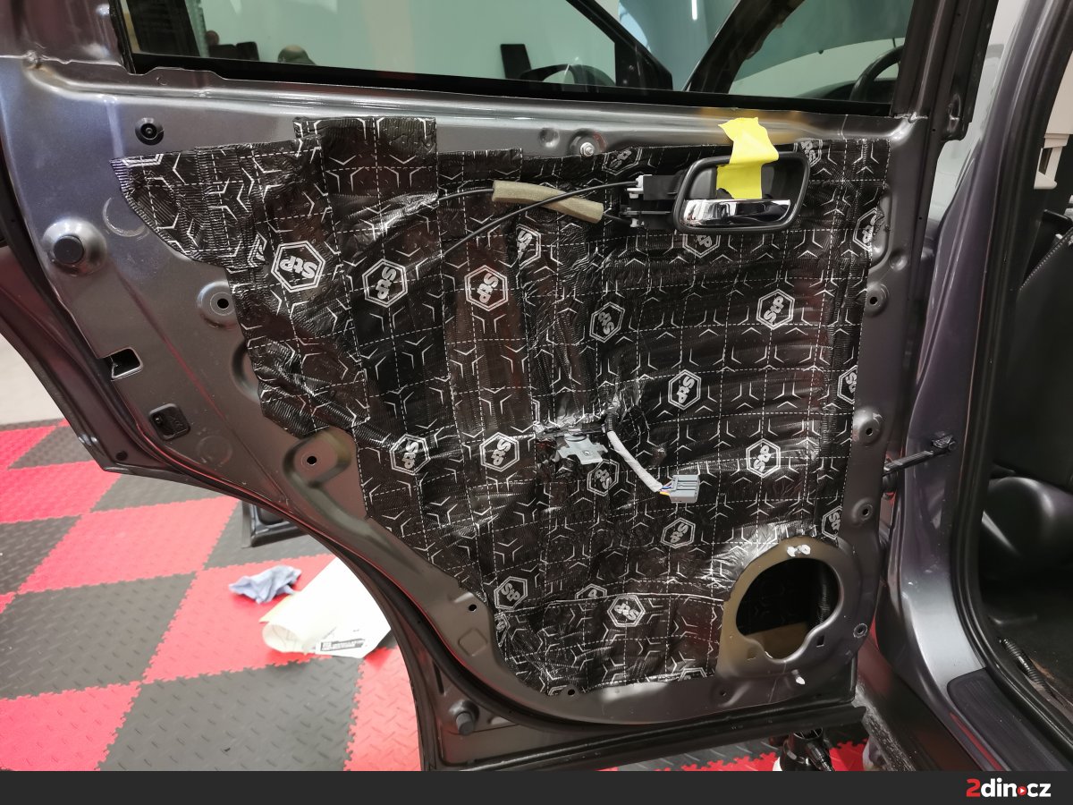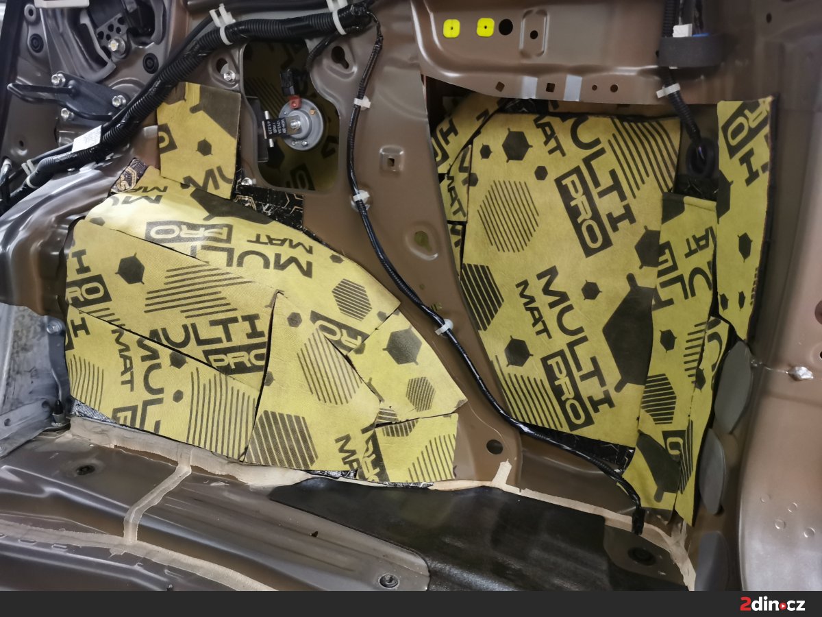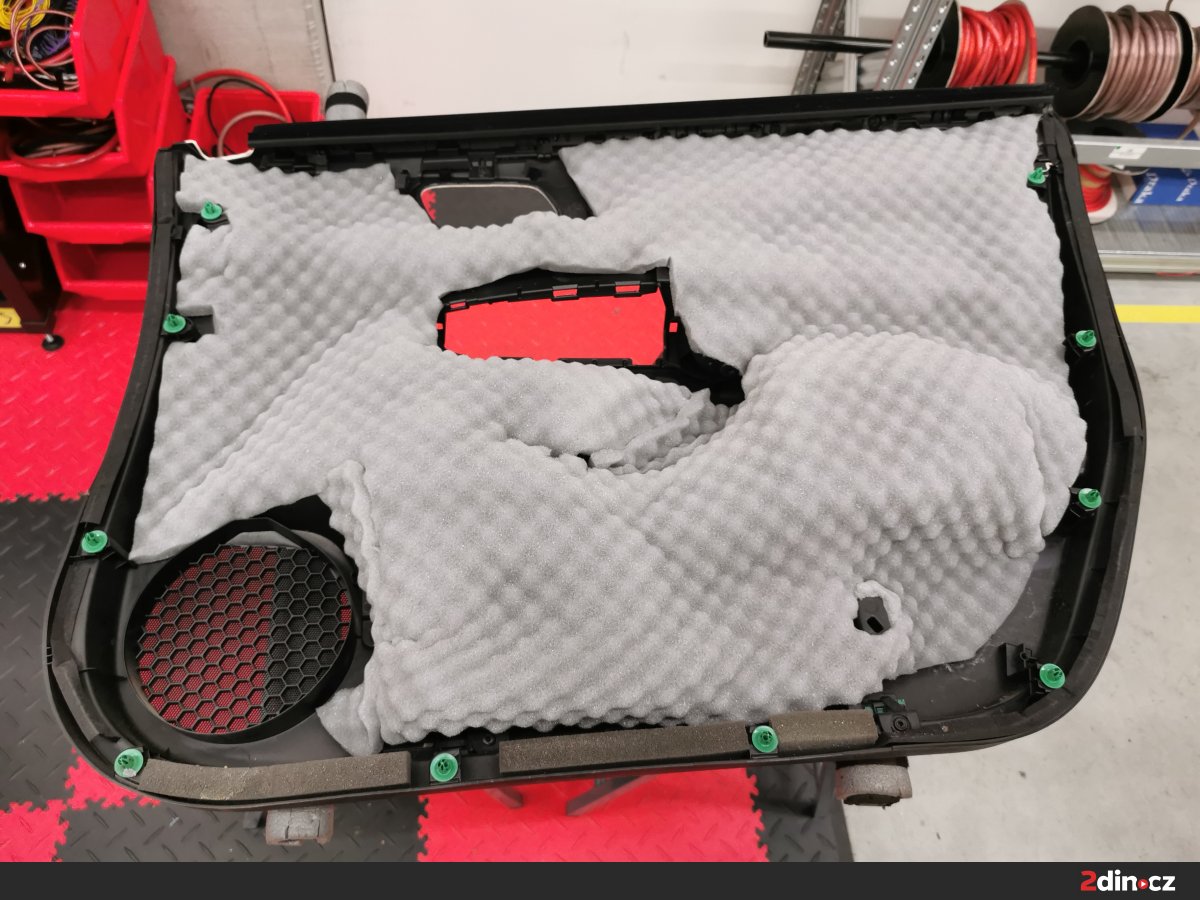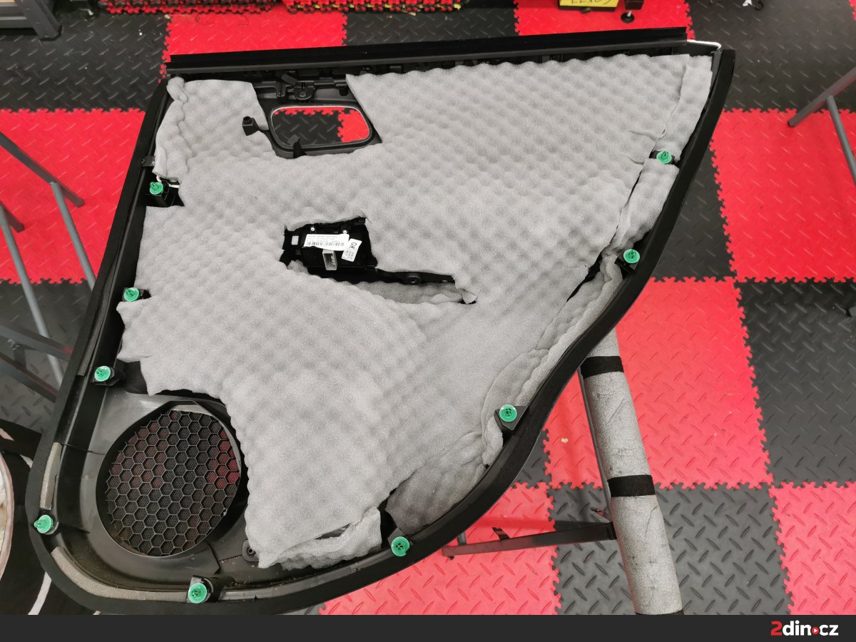 Dveře jsme odhlučnili jako už tradičně ve třech vrstvách. Plechové části byly ošetřeny kombinací antivibračních materiálů STP Black Gold Camo a STP Black Silver, které potlačují rezonance a strukturální vibrace. Vnitřní část dveří a tapecírunky byly doplněny o materiál STP Relief 15 Premium, který pohlcuje zbytkový hluk z venku a zároveň eliminuje vrzání a styky plastových částí. Díky této kombinaci je v interiéru znatelně tišší prostředí a lepší akustika, zatímco dveře samotné působí pevnějším, bytelnějším dojmem.