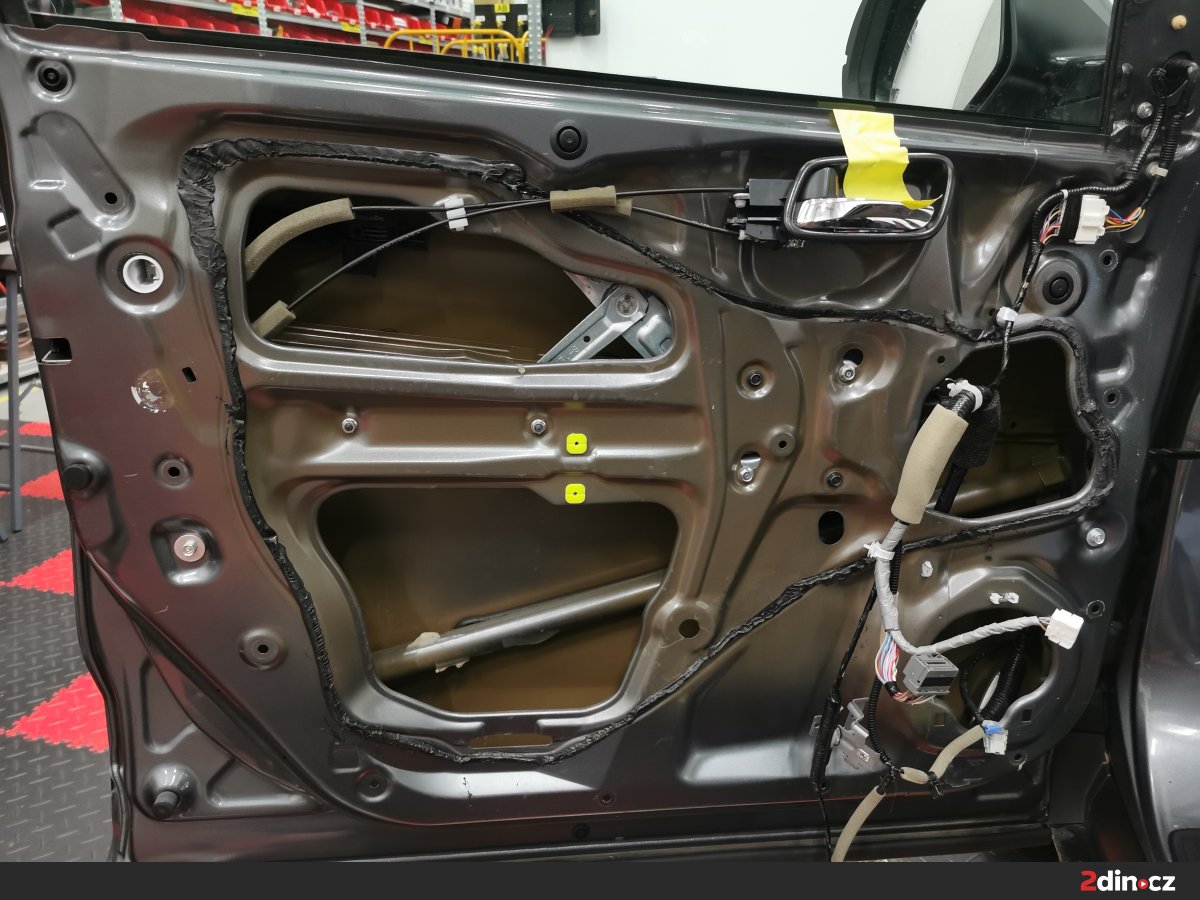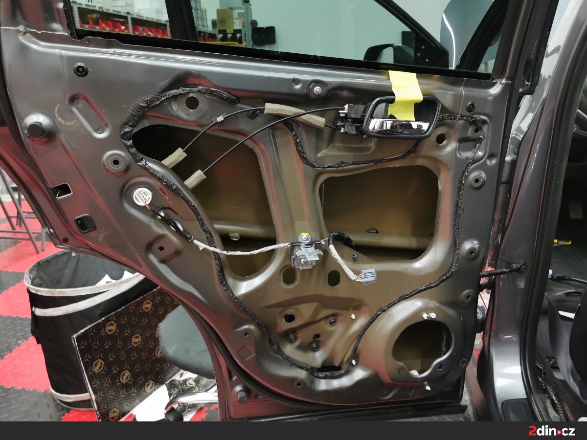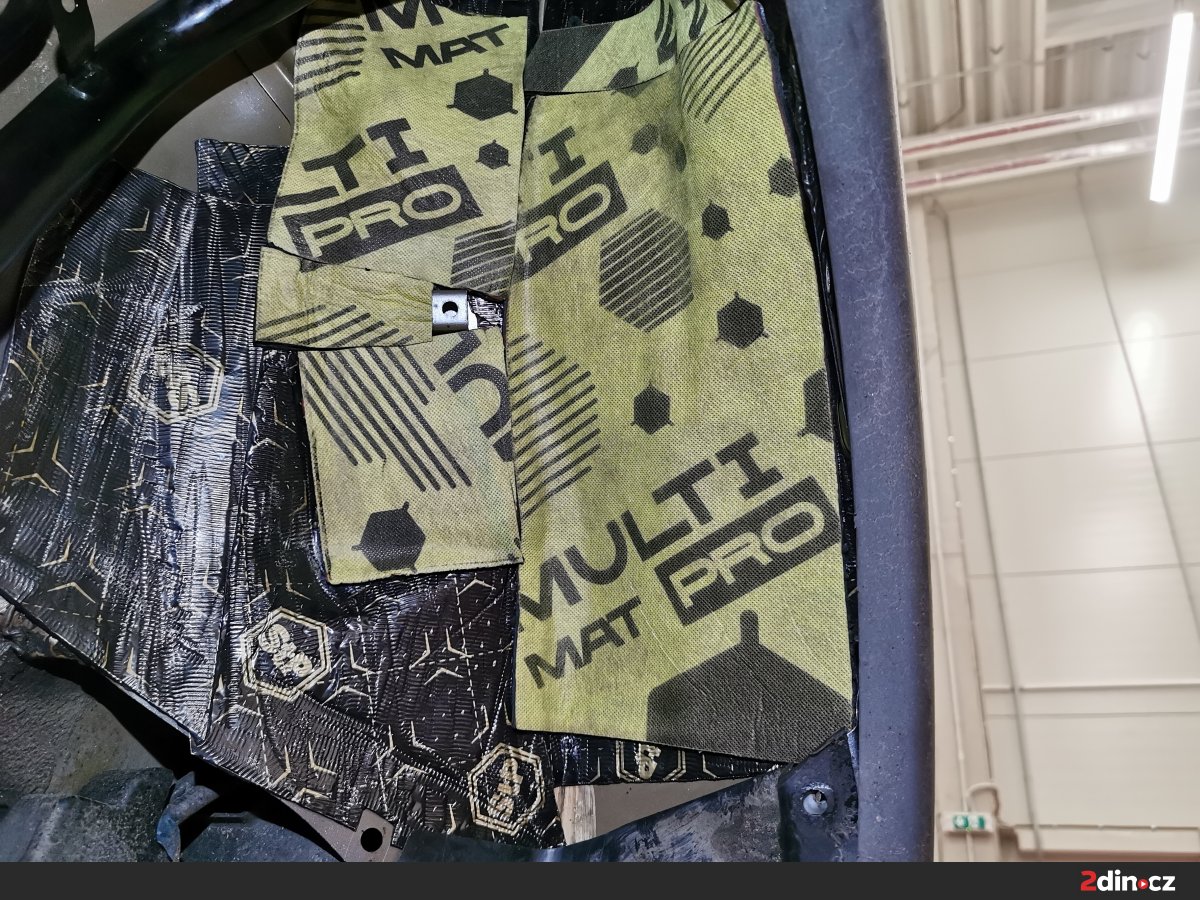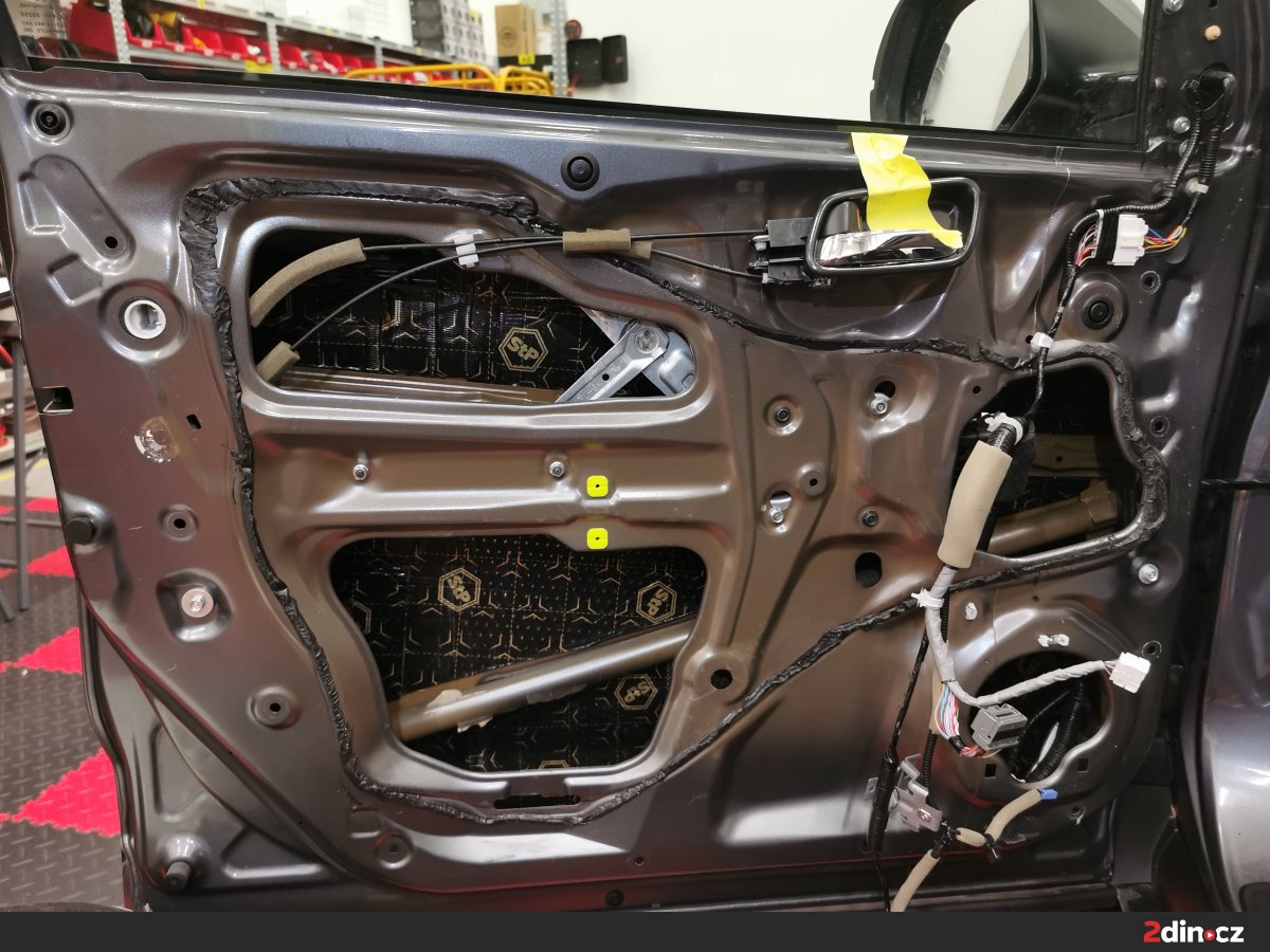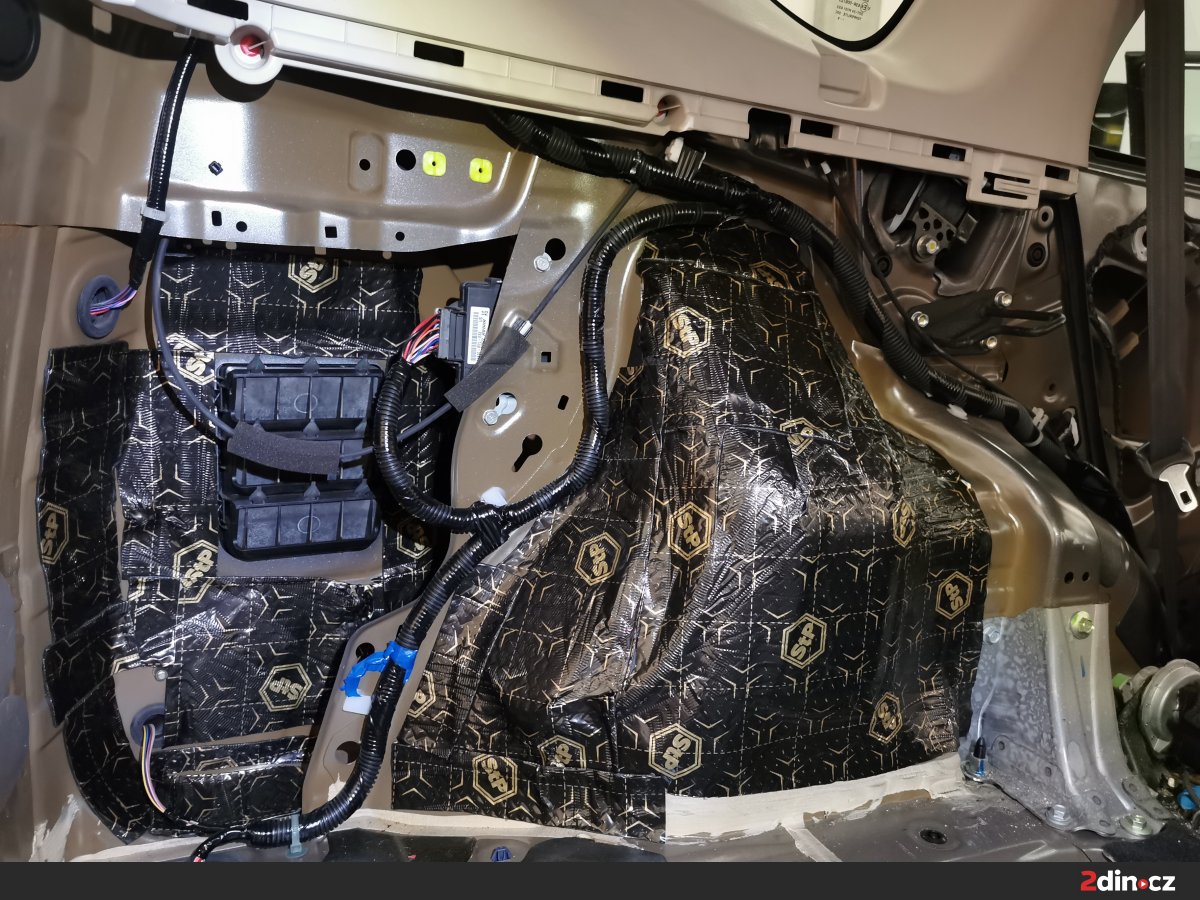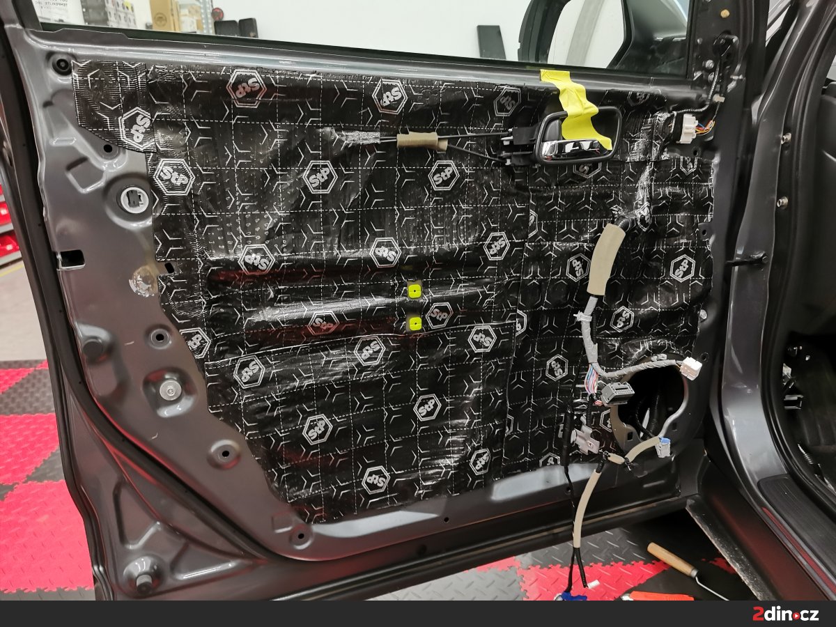 Dveře jsme odhlučnili jako už tradičně ve třech vrstvách. Plechové části byly ošetřeny kombinací antivibračních materiálů STP Black Gold Camo a STP Black Silver, které potlačují rezonance a strukturální vibrace. Vnitřní část dveří a tapecírunky byly doplněny o materiál STP Relief 15 Premium, který pohlcuje zbytkový hluk z venku a zároveň eliminuje vrzání a styky plastových částí. Díky této kombinaci je v interiéru znatelně tišší prostředí a lepší akustika, zatímco dveře samotné působí pevnějším, bytelnějším dojmem.