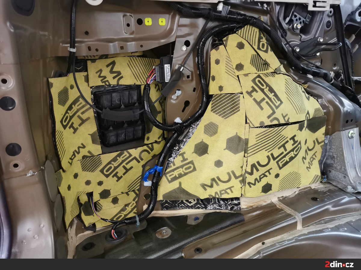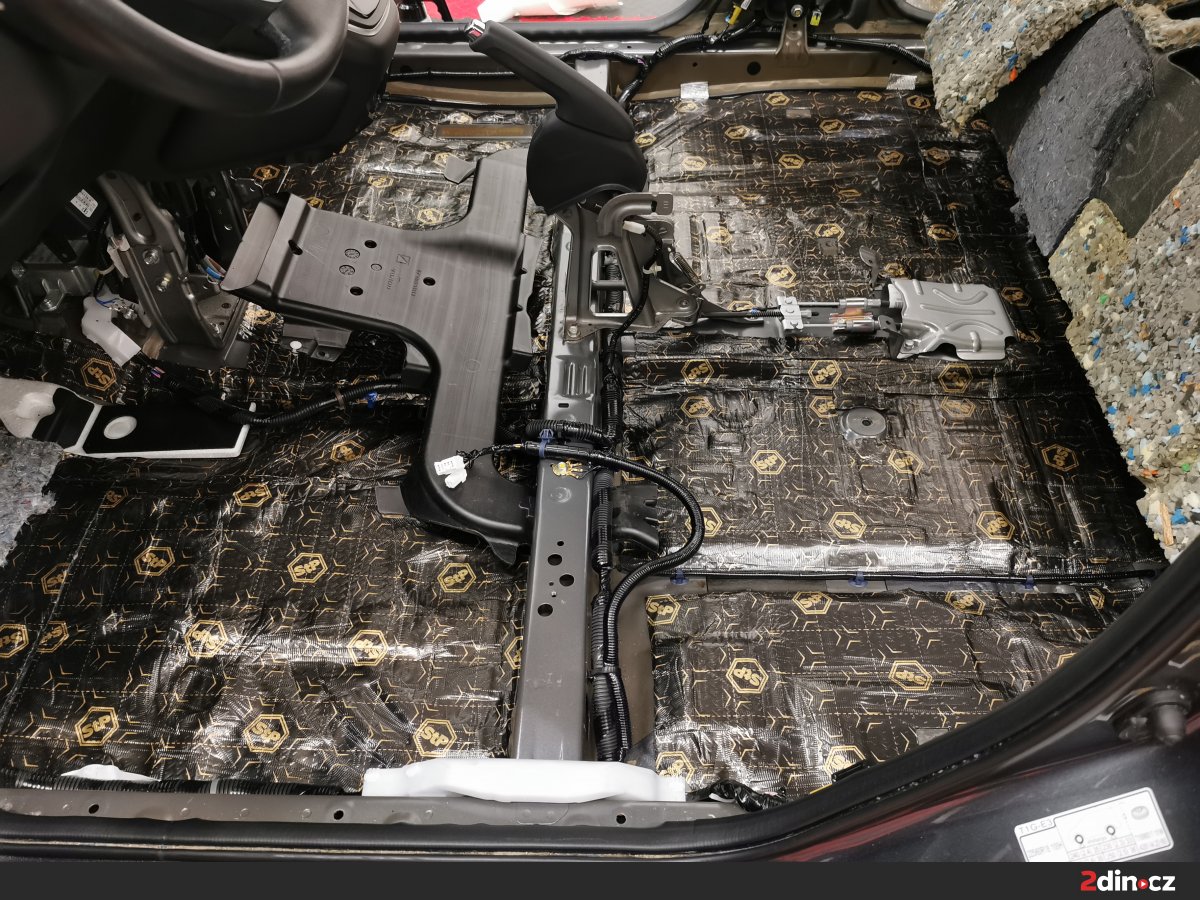 Podlaha tohoto SUV představuje rozměrný prostor, jímž by bez kvalitního odhlučnění prinikal do kabiny valivý hluk i vibrace. Nejprve byla aplikována antivibrační vrstva STP Black Gold Camo, která stabilizovala plechové panely. Na ni byla nalepena izolační vrstva CTK Multimat PRO, která pohlcuje hluboké a střední frekvence přicházející z podvozku. Závěrečná vrstva STP AeroFlex 3 pak poskytla tepelné i akustické uzavření celé sestavy. Výsledkem je pevná a tichá podlaha bez dunění a rušivých vlivů.