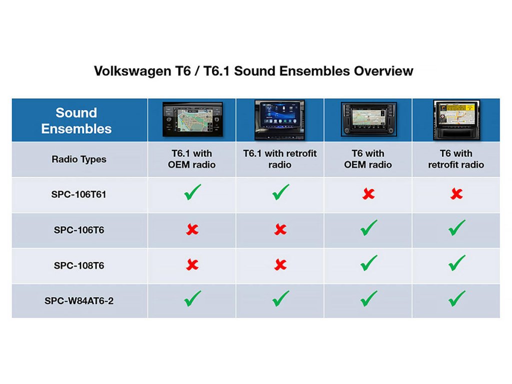 - Vylepšete svůj reproduktorový systém Alpine Adventure Audio pro Volkswagen T6.1 nebo T6 na Concert Ensemble pomocí nového 6kanálového DSP zesilovače SPC-W84AT6-2 PDA-S560 a systému subwooferu.