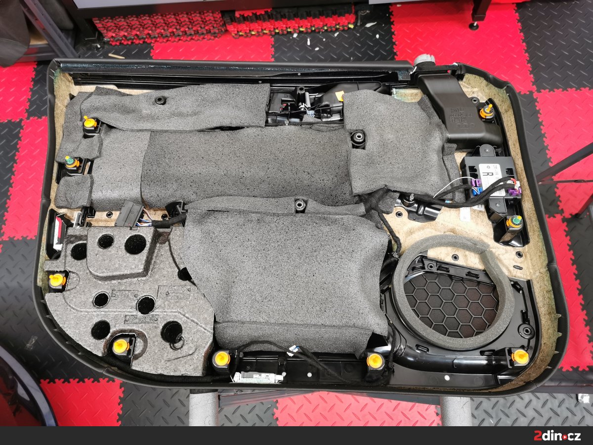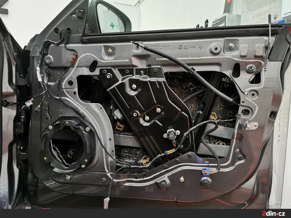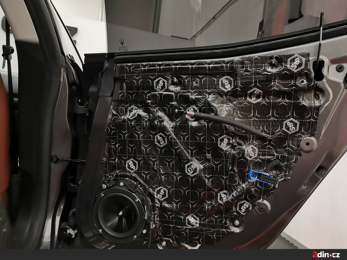 U tohoto Maserati jsme provedli důkladné odhlučnění všech čtyř dveří. Pro tento účel jsme použili kombinaci tří kvalitních materiálů, které se nám osvědčily i u náročnějších projektů. Antivibrační vrstvy STP Black Gold Camo a STP Black Silver byly aplikovány na vnější plechy dveří, aby se eliminovaly nežádoucí vibrace, rezonance a zpevnil se celkový základ pro reproduktory. Následně jsme použili akustickou pěnu STP Biplast 10, která zamezuje odrazům zvuku v dutinách a přispívá k celkovému ztišení interiéru. Tato kombinace zajišťuje nejen tišší jízdu, ale především lepší podmínky pro čistou reprodukci hudby.