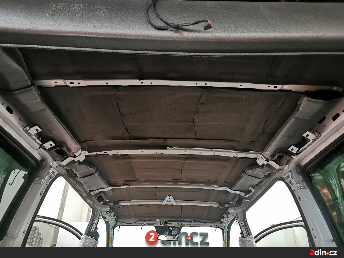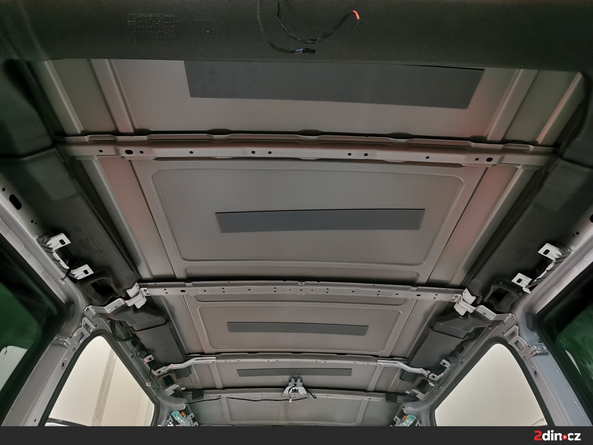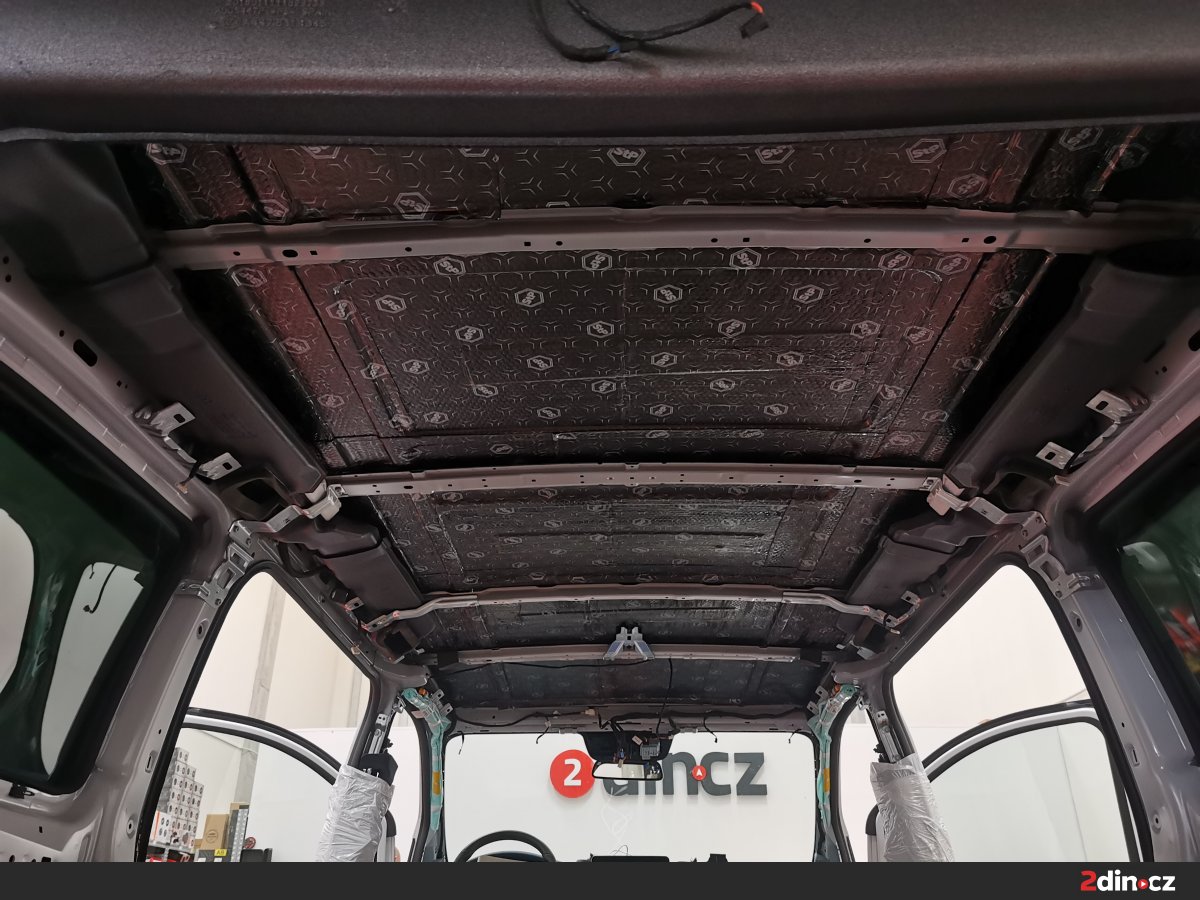 Strop vozidla, který patří mezi největší a zároveň nejtenčí rezonanční plochy, byl odhlučněn kombinací materiálů STP Black Gold Camo a STP Biplast 10. Antivibrační vrstva na kovové části výrazně snižuje rezonance způsobené aerodynamickým hlukem, zatímco akustická pěna na čalounění absorbuje vyšší frekvence a eliminuje přímý přenos hluku do kabiny. Výsledkem je podstatně tišší prostředí v kabině, a to i při vyšších rychlostech nebo silném dešti.