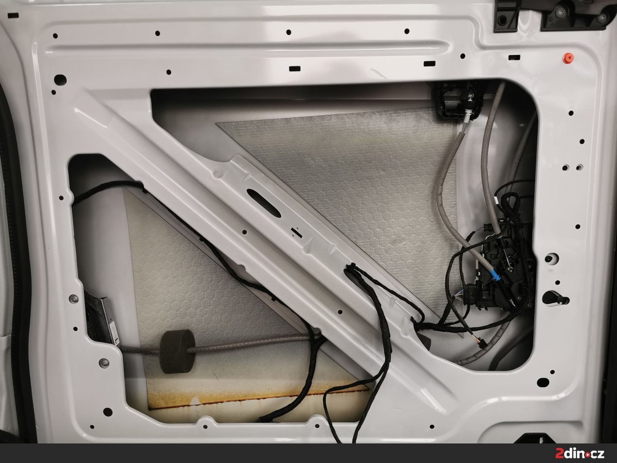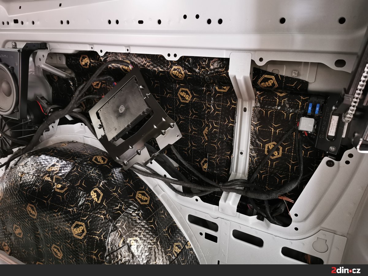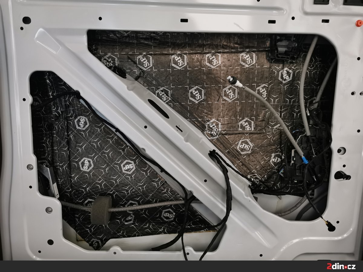 Dveře vozidla byly odhlučněny ve třech vrstvách. Na vnitřní i vnější plechy dveří byl aplikován antivibrační materiál STP Black Gold Camo a doplněn tenčí variantou STP Black Silver, která zpevňuje konstrukci dveří a eliminuje rezonance. Tyto vrstvy zároveň tvoří kvalitní ozvučnici pro reproduktory. Na tapec byla použita akustická pěna STP Biplast 10, která výborně pohlcuje hluk a zamezuje kontaktu plastových dílů s kovem. Celý systém doplňuje speciální páska, která zabraňuje vrzání a dotykům mezi částmi tapecíru a karoserie, čímž výrazně zvyšuje komfort při jízdě.