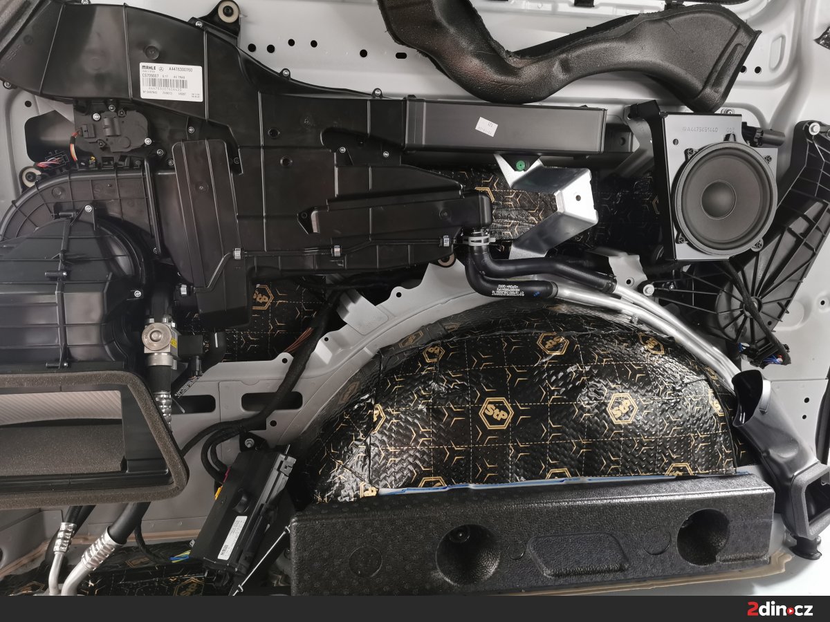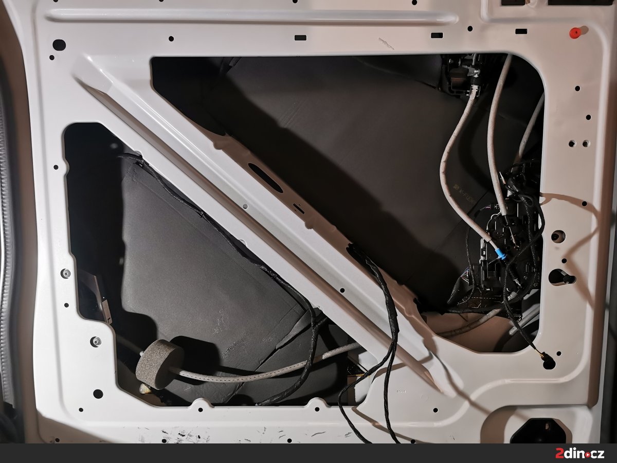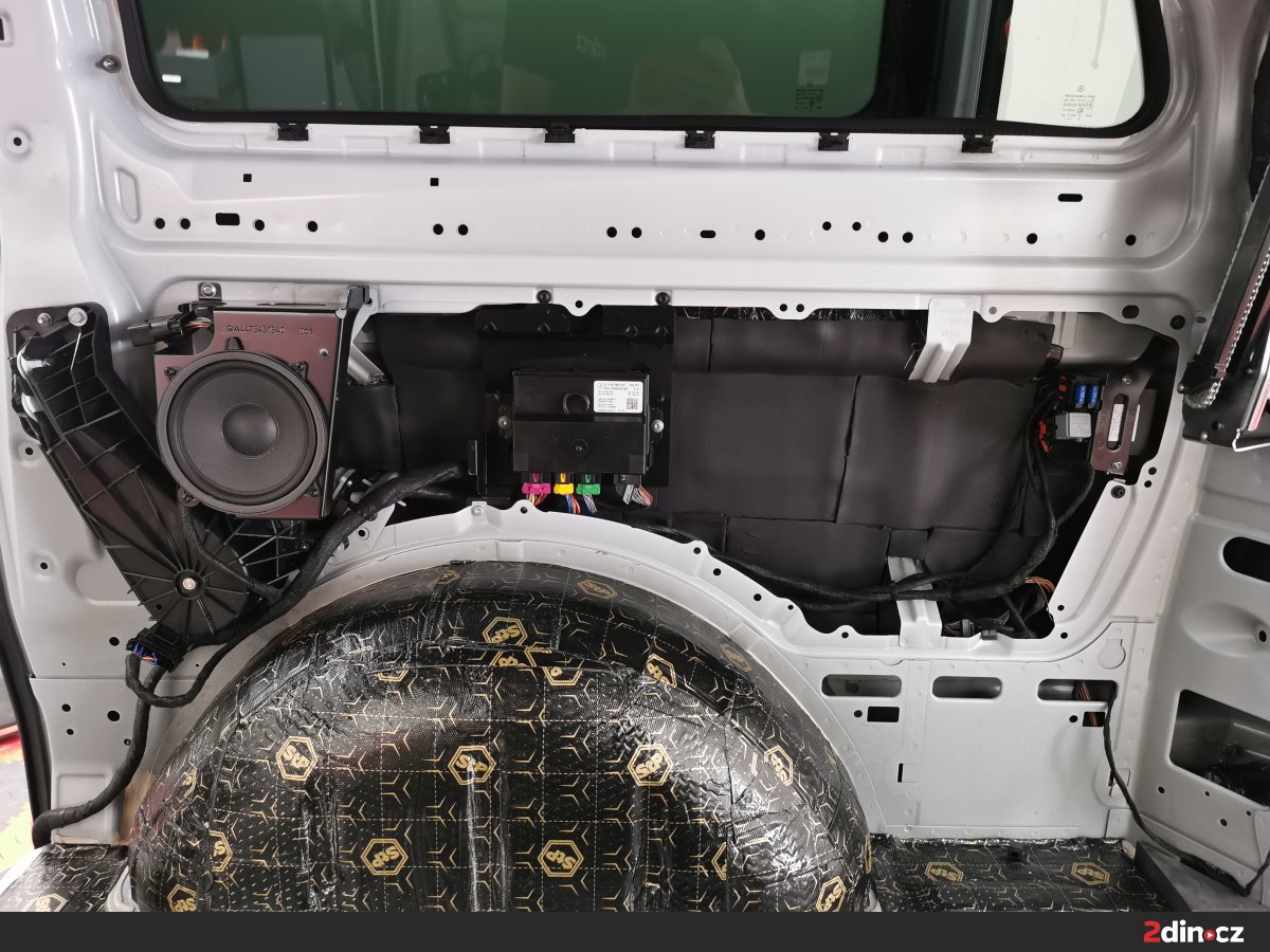 Dveře vozidla byly odhlučněny ve třech vrstvách. Na vnitřní i vnější plechy dveří byl aplikován antivibrační materiál STP Black Gold Camo a doplněn tenčí variantou STP Black Silver, která zpevňuje konstrukci dveří a eliminuje rezonance. Tyto vrstvy zároveň tvoří kvalitní ozvučnici pro reproduktory. Na tapec byla použita akustická pěna STP Biplast 10, která výborně pohlcuje hluk a zamezuje kontaktu plastových dílů s kovem. Celý systém doplňuje speciální páska, která zabraňuje vrzání a dotykům mezi částmi tapecíru a karoserie, čímž výrazně zvyšuje komfort při jízdě.