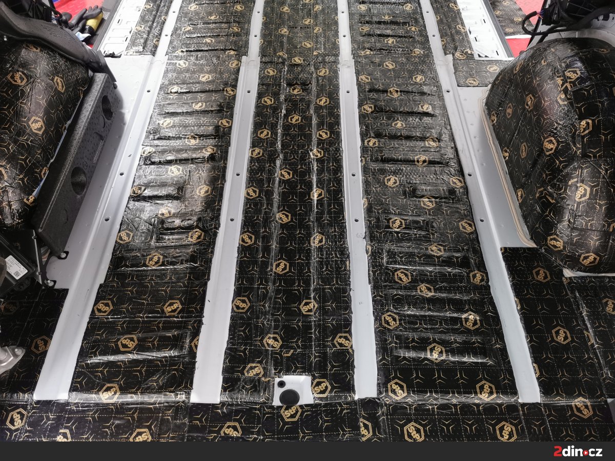 Podlaha Mercedesu EQV byla odhlučněna pomocí dvou klíčových vrstev. První, antivibrační vrstvu tvoří STP Black Gold Camo, která zásadně zvyšuje tuhost plechu a eliminuje přenos vibrací z podvozku. Druhá vrstva je tvořena termoakustickým materiálem Neoprene 3, který zajišťuje nejen pohlcení hluku, ale také zlepšuje tepelnou izolaci vozu. Díky těmto úpravám se výrazně snížila hladina hluku přicházející od silnice a jízdní komfort byl výrazně zvýšen, zejména při delších trasách.