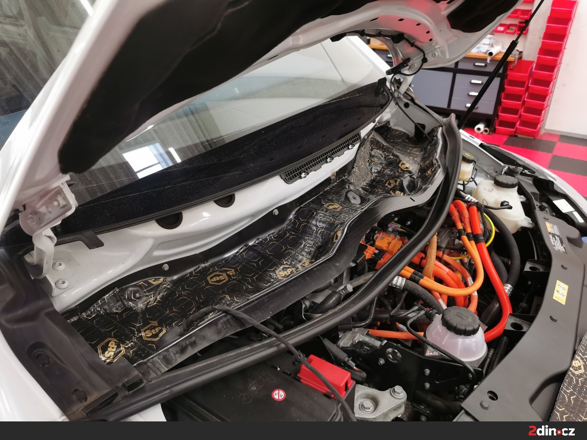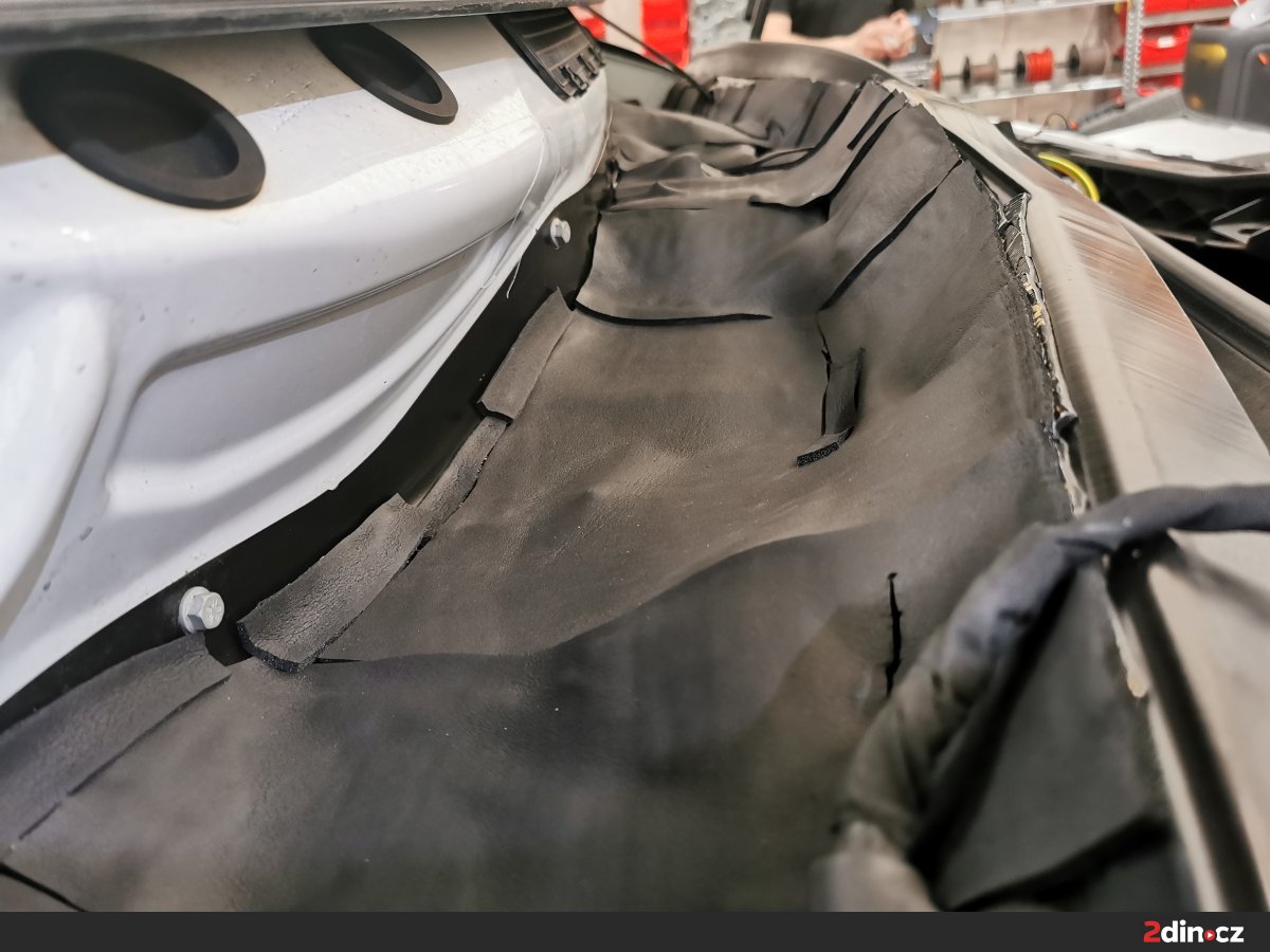 Mezimotorový prostor byl odhlučněn dvouvrstvou aplikací – nejprve pomocí STP Black Silver, která slouží jako lehčí antivibrační základ, a následně termoakustickým materiálem Neoprene 10, který výborně tlumí tepelné i zvukové emise z přední části vozu. Tato kombinace přispěla k výraznému snížení hluku pronikajícího do kabiny z oblasti čelního prostoru.