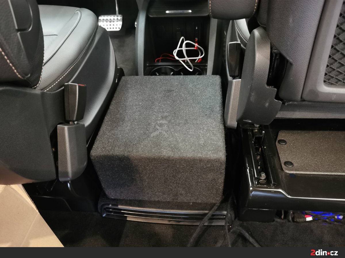 Kromě rozsáhlého odhlučnění prošel Mercedes EQV také upgradem audio sestavy. Do vozidla byl instalován subwoofer HELIX K 8E.2 v boxu a výkonný zesilovač ESX QM400.2, které posunuly zvukový zážitek na novou úroveň. Výsledkem je výrazně čistší, detailnější a objemnější zvuk napříč celým frekvenčním spektrem. Hudební přednes tak výrazně lépe odpovídá akusticky upravenému prostředí vozu. Celý systém byl doplněn o pár ultra-slim monitorů s Androidem o velikosti 14", čímž bylo uživatelské prostředí vozu obohaceno o multimediální komfort. Tyto monitory nejenže zpříjemňují dlouhé cesty spolujezdcům, ale zároveň slouží jako praktické multimediální centrum pro práci i zábavu na cestách.