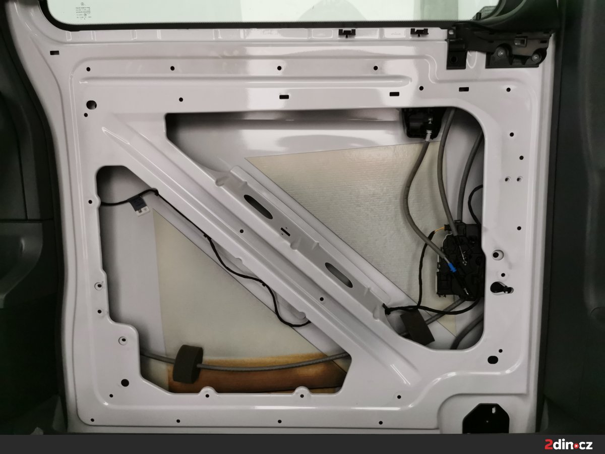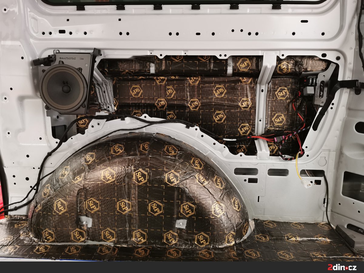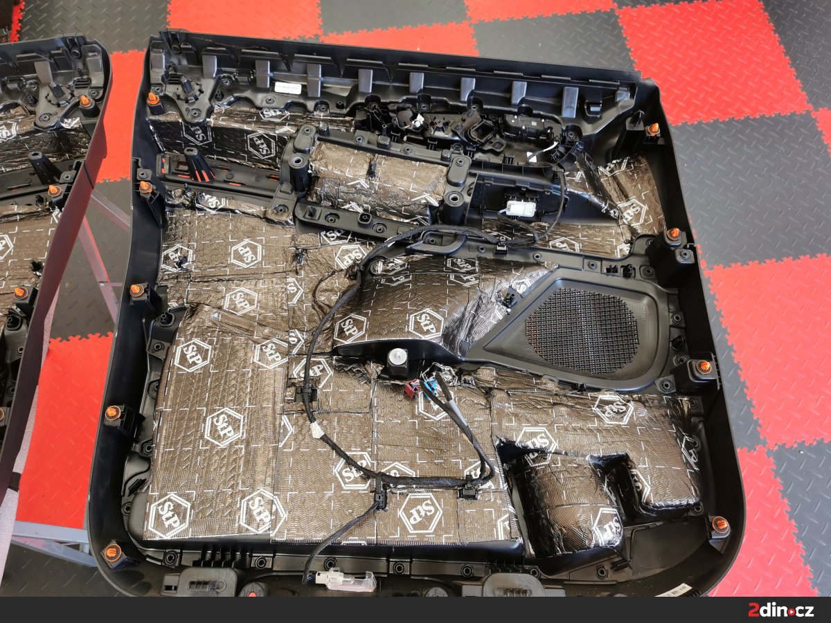 Dveře vozu Mercedes-Benz Vito byly odhlučněny ve více krocích. Nejprve jsme aplikovali antivibrační materiál STP Black Silver na vnější i vnitřní plechové části. Tento materiál výrazně snižuje rezonance, což je důležité nejen pro stíšení interiéru, ale i pro kvalitní přenos zvuku z reproduktorů. Následně byla do dveří vložena akustická pěna STP Biplast 10, která tlumí vyšší frekvence a brání přenosu hluku z okolního prostředí. Okraje tapecírungů byly navíc opatřeny antivrzací úpravou pro eliminaci plastových pazvuků. Tato úprava navíc podpořila celkový efekt výměny reproduktorového systému, který nyní nabízí výrazně kvalitnější poslechový zážitek díky vytvoření stabilní ozvučnice.