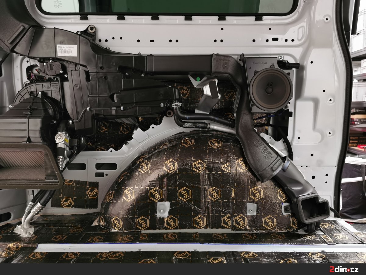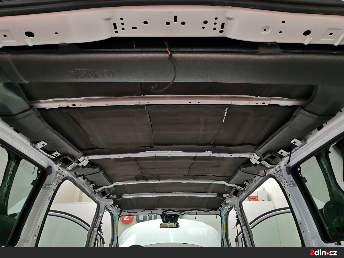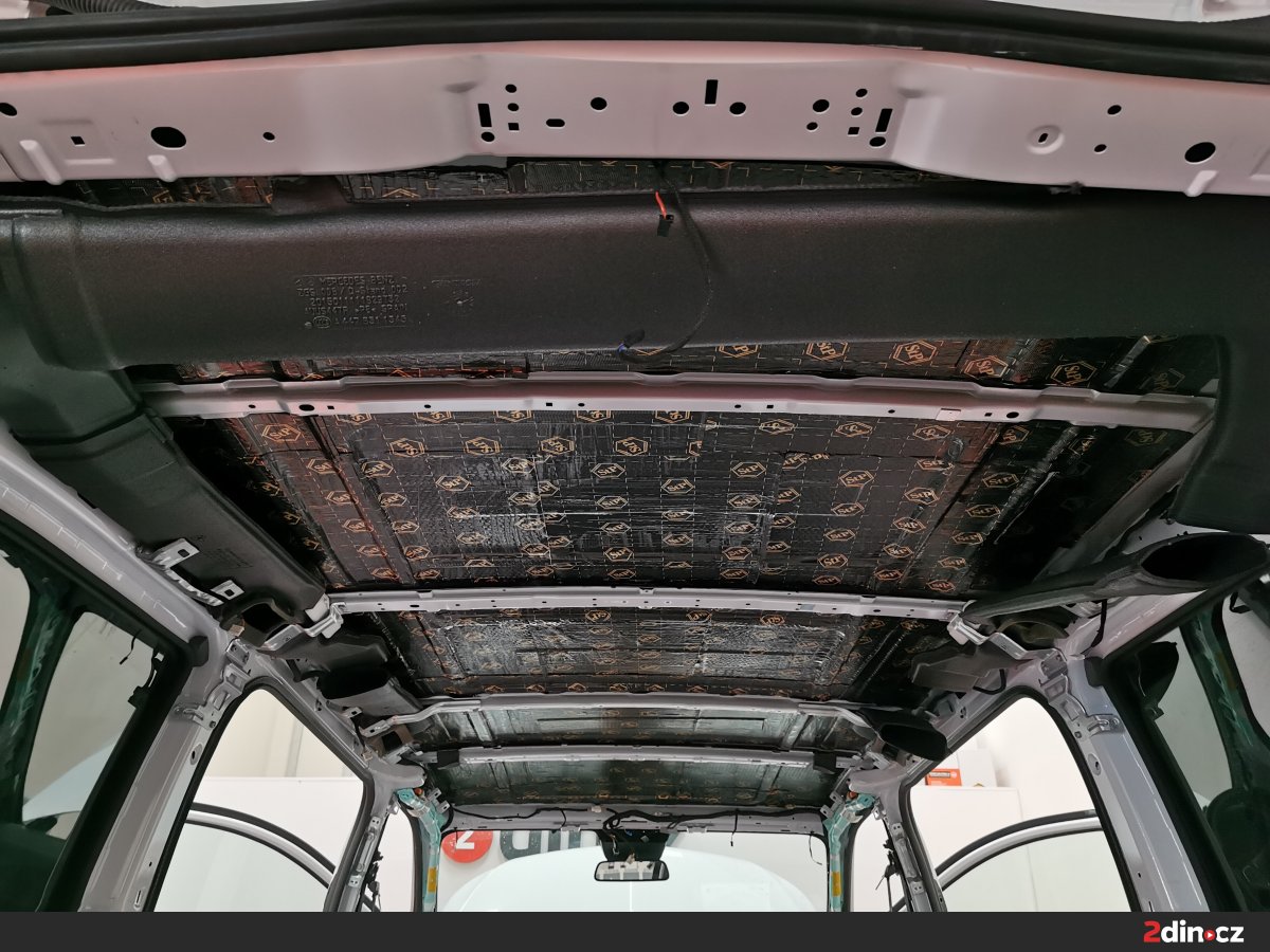 Strop vozu, často přehlížená oblast, je jednou z největších rezonančních ploch vůbec. V rámci instalace byl nejprve aplikován antivibrační materiál STP Black Gold Camo, jehož vyšší tloušťka a hmotnost výrazně snižují šíření vibrací a aerodynamického hluku. Na tuto vrstvu byla přidána akustická pěna STP Biplast 10, která pomáhá pohlcovat hluk deště, větru a vnější ruchy. Výsledkem je tišší a stabilnější akustické prostředí v kabině, zejména při jízdách po dálnici nebo v silném větru. Stropní odhlučnění tak výrazně přispělo ke komfortu a odstranilo efekt „plechového bubnu“, který je typický u neizolovaných dodávek.