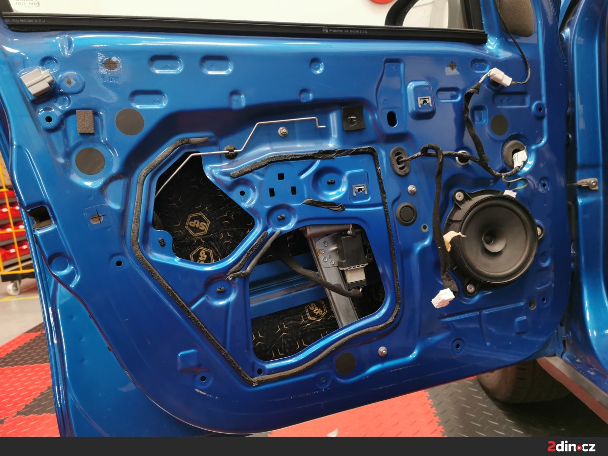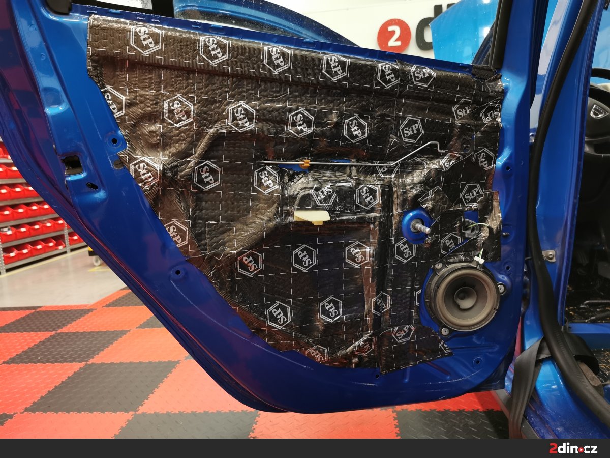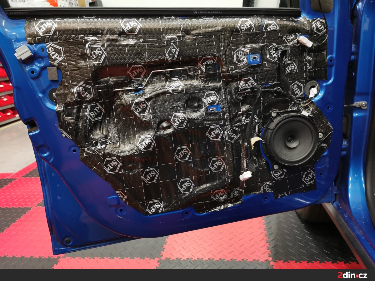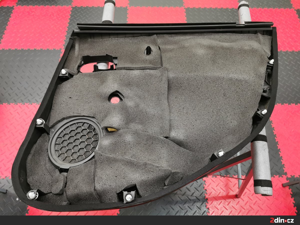 Dveře byly odhlučněny komplexním systémem tří vrstev. Prvním krokem bylo použití STP Black Gold Camo na vnější plech, kde tento materiál zpevňuje konstrukci a eliminuje rezonance. Na vnitřní plech byl aplikován STP Black Silver, který je tenčí, ale velmi účinný na menších plochách. Výplň dveří byla ošetřena akustickou pěnou STP Biplast 10, která pohlcuje zvuk zvenčí a zabraňuje kontaktu mezi plastovými a kovovými díly. Výsledkem je tišší a pevnější dveřní konstrukce, která nevrže a funguje jako vhodná ozvučnice pro reproduktory.