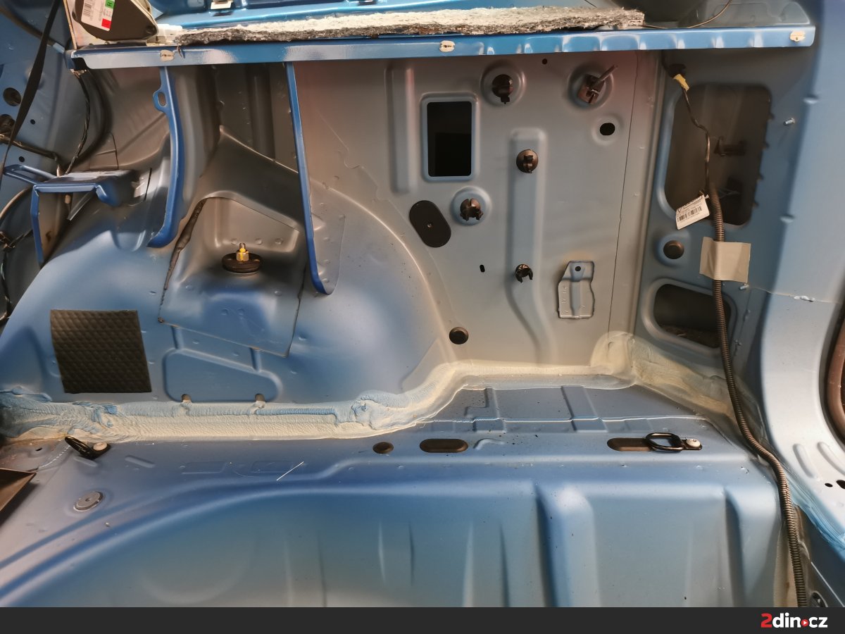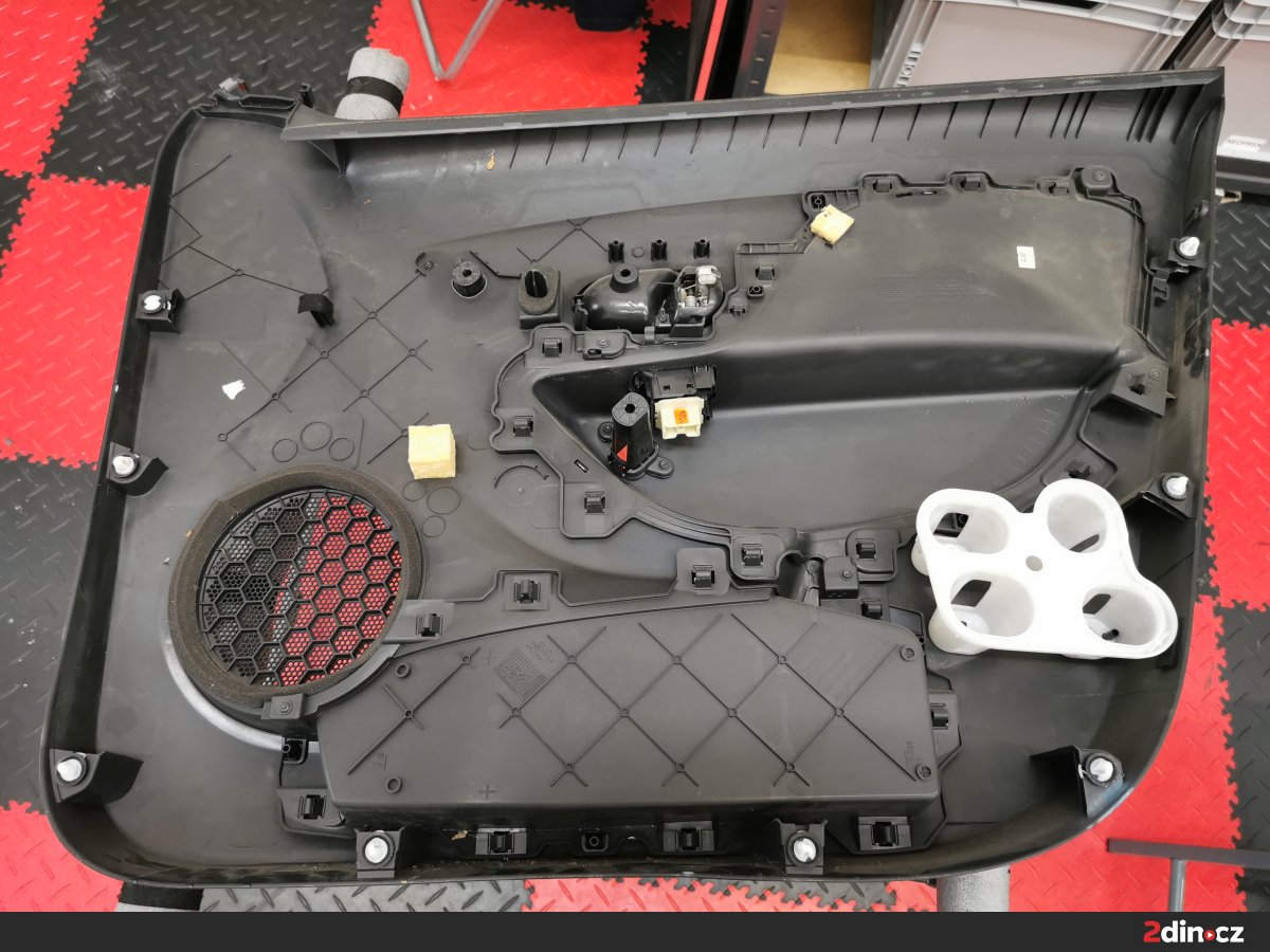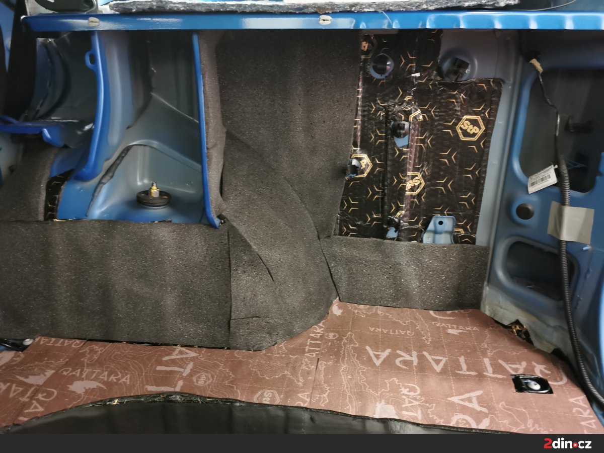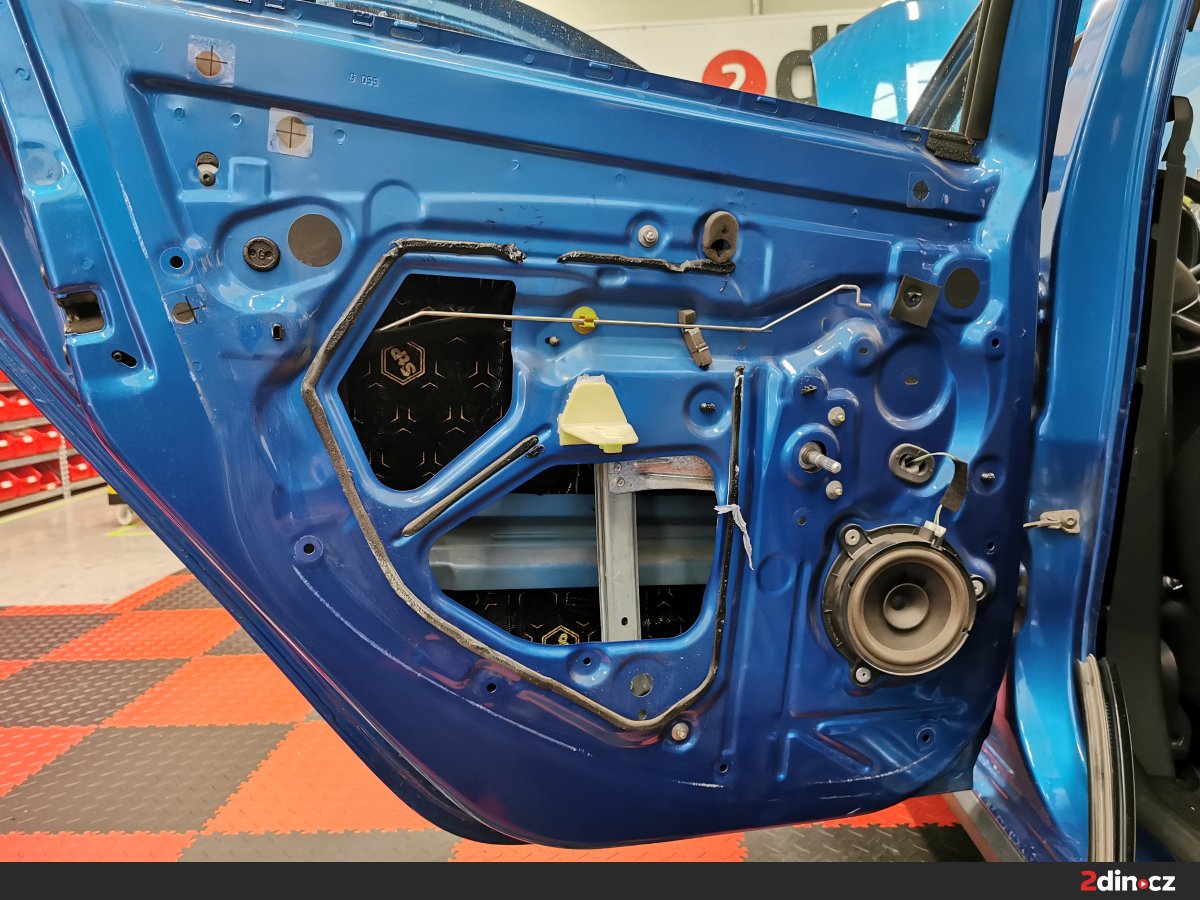 Dveře byly odhlučněny komplexním systémem tří vrstev. Prvním krokem bylo použití STP Black Gold Camo na vnější plech, kde tento materiál zpevňuje konstrukci a eliminuje rezonance. Na vnitřní plech byl aplikován STP Black Silver, který je tenčí, ale velmi účinný na menších plochách. Výplň dveří byla ošetřena akustickou pěnou STP Biplast 10, která pohlcuje zvuk zvenčí a zabraňuje kontaktu mezi plastovými a kovovými díly. Výsledkem je tišší a pevnější dveřní konstrukce, která nevrže a funguje jako vhodná ozvučnice pro reproduktory.