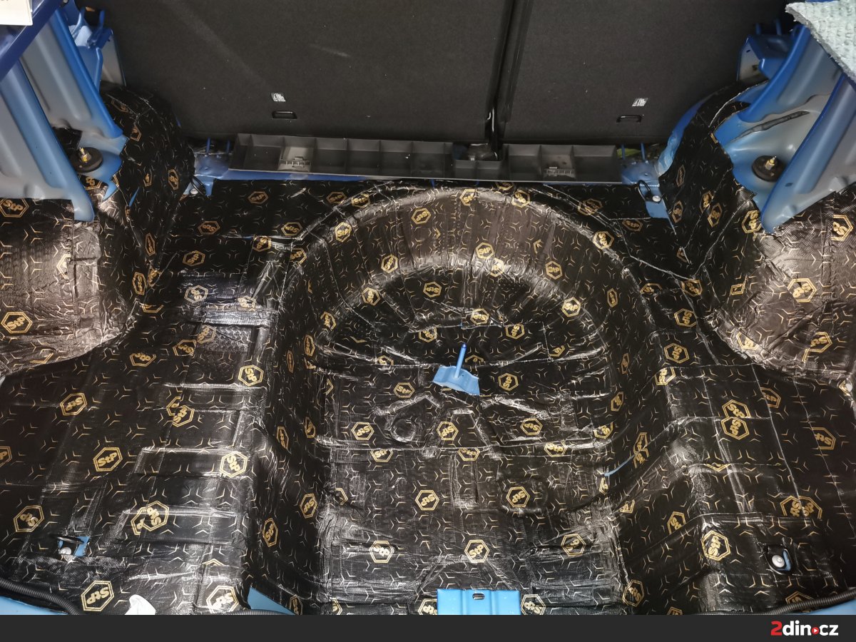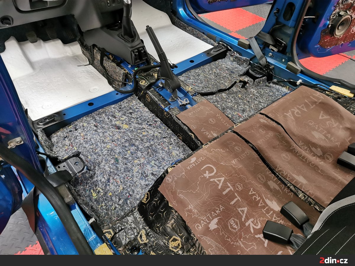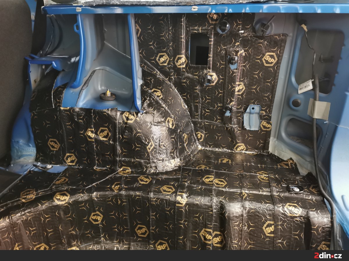 Podlaha vozu byla ošetřena ve třech vrstvách. Základem je antivibrační vrstva STP Black Gold Camo, která omezuje přenos vibrací a rezonancí z podvozku. Na tuto vrstvu byla aplikována protihluková membrána STP Qattara, která díky své hustotě zamezuje šíření hlubokých frekvencí. Poslední vrstvu tvoří termoakustický materiál Neoprene 3, jenž přispívá jak k tepelné izolaci, tak k tlumení zbytkového hluku. Výsledkem je znatelně tišší a teplotně stabilnější kabina, zejména při delších cestách.