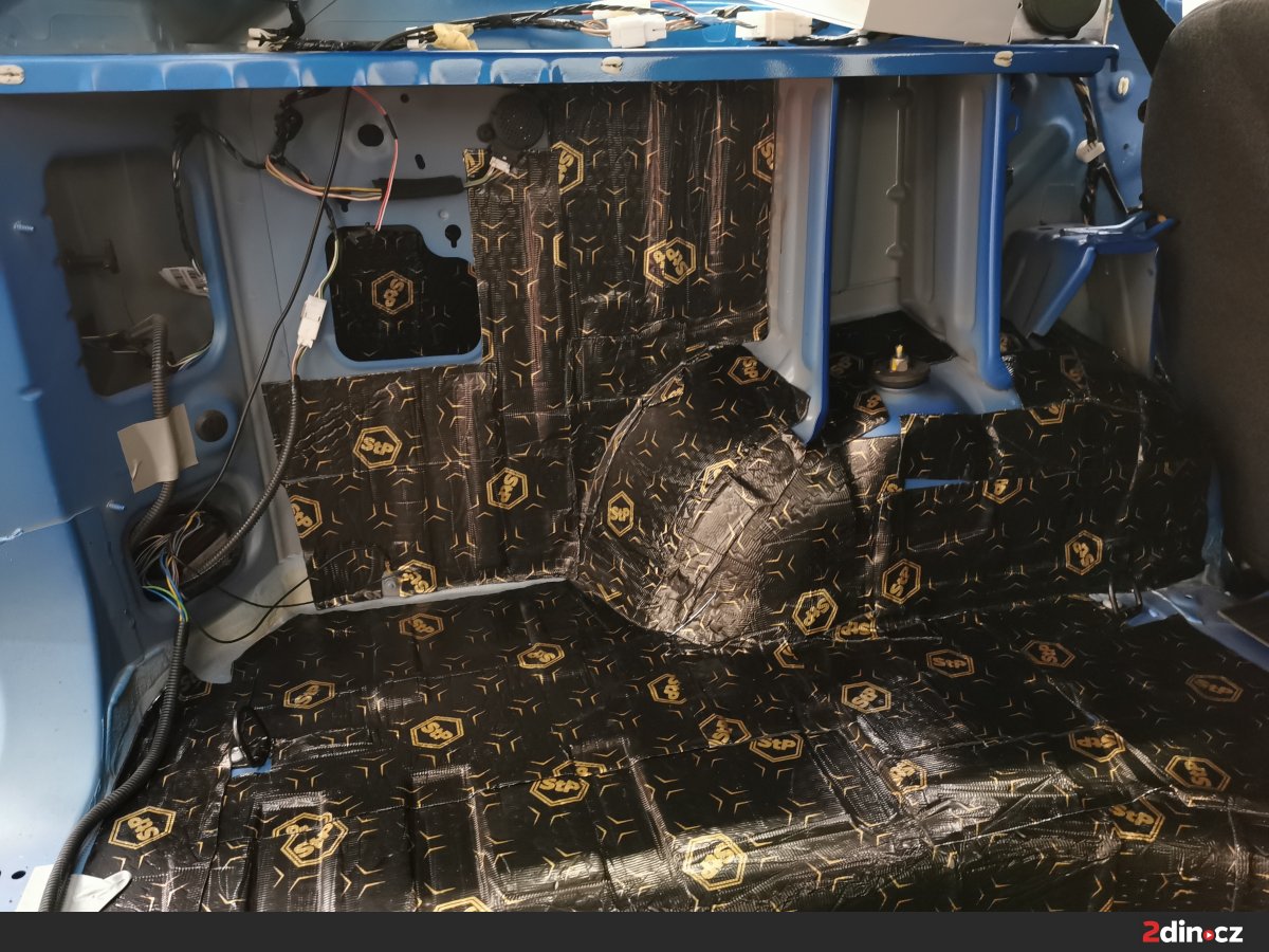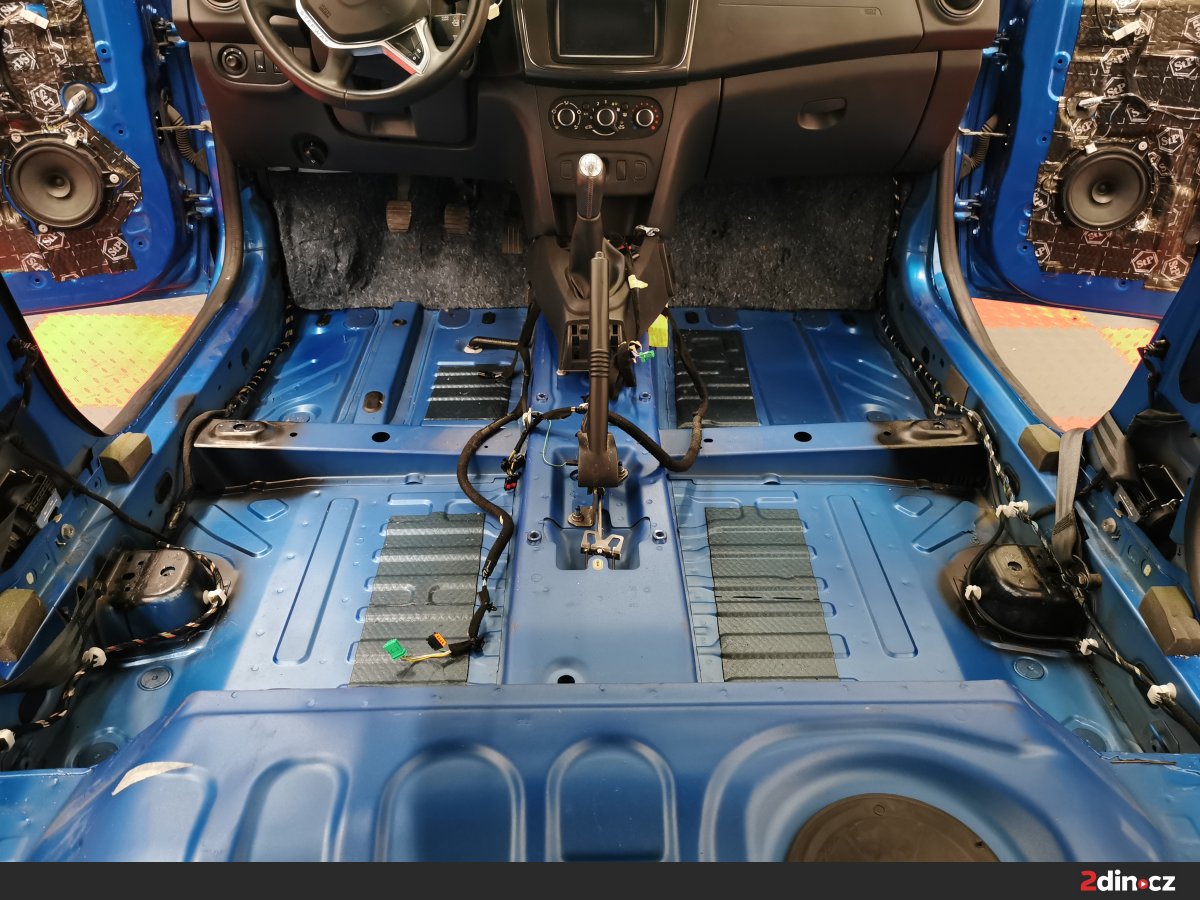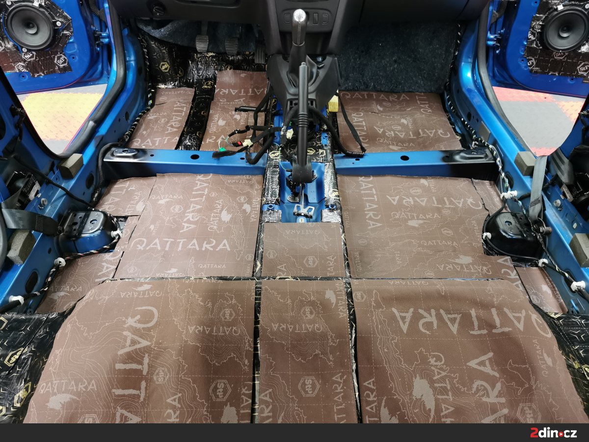 Podlaha vozu byla ošetřena ve třech vrstvách. Základem je antivibrační vrstva STP Black Gold Camo, která omezuje přenos vibrací a rezonancí z podvozku. Na tuto vrstvu byla aplikována protihluková membrána STP Qattara, která díky své hustotě zamezuje šíření hlubokých frekvencí. Poslední vrstvu tvoří termoakustický materiál Neoprene 3, jenž přispívá jak k tepelné izolaci, tak k tlumení zbytkového hluku. Výsledkem je znatelně tišší a teplotně stabilnější kabina, zejména při delších cestách.