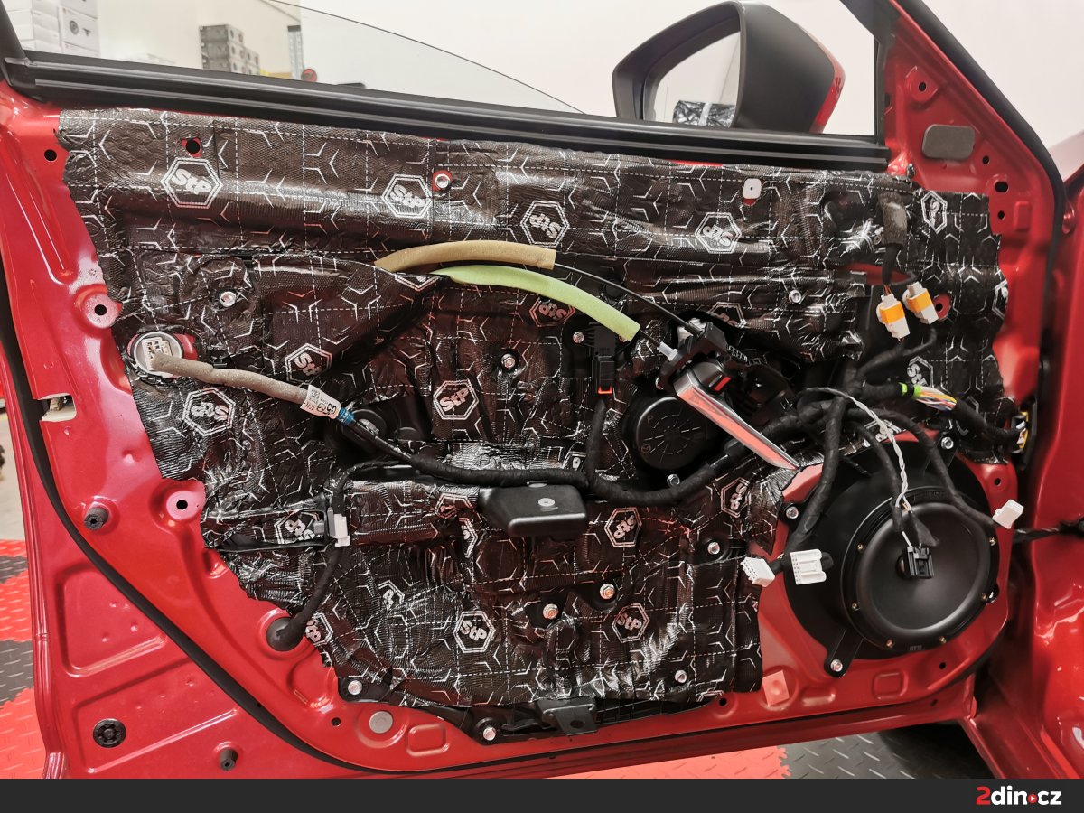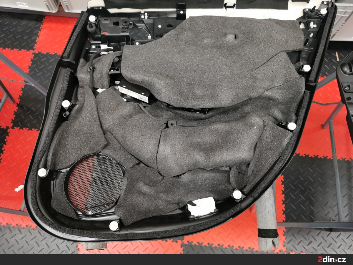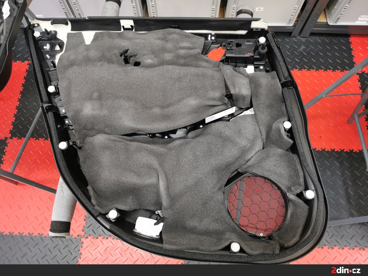 Práce začala demontáží tapecírunku dveří, důkladným vyčištěním a odmaštěním plechu a následně aplikací několika vrstev odhlučňovacích materiálů. Na vnější plech zamířil antivibrační materiál, který účinně eliminuje rezonance a zároveň zpevňuje konstrukci. Na ten jsme nalepili sendvičový materiál, který se sám o sobě skládá ze třech různých vrstev. Na vnitřní plech šla další vrstva antivibračního materiálu, abychom zvýšili účinnost celého řešení a současně vytvořili kvalitní ozvučnici pro nové reproduktory. Nakonec šla akustická pěna na tapec, která tlumí jiný – vyšší – rozsah frekvencí a snižuje míru hluku v interiéru.