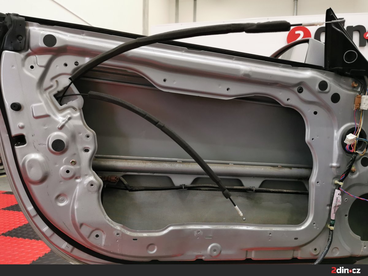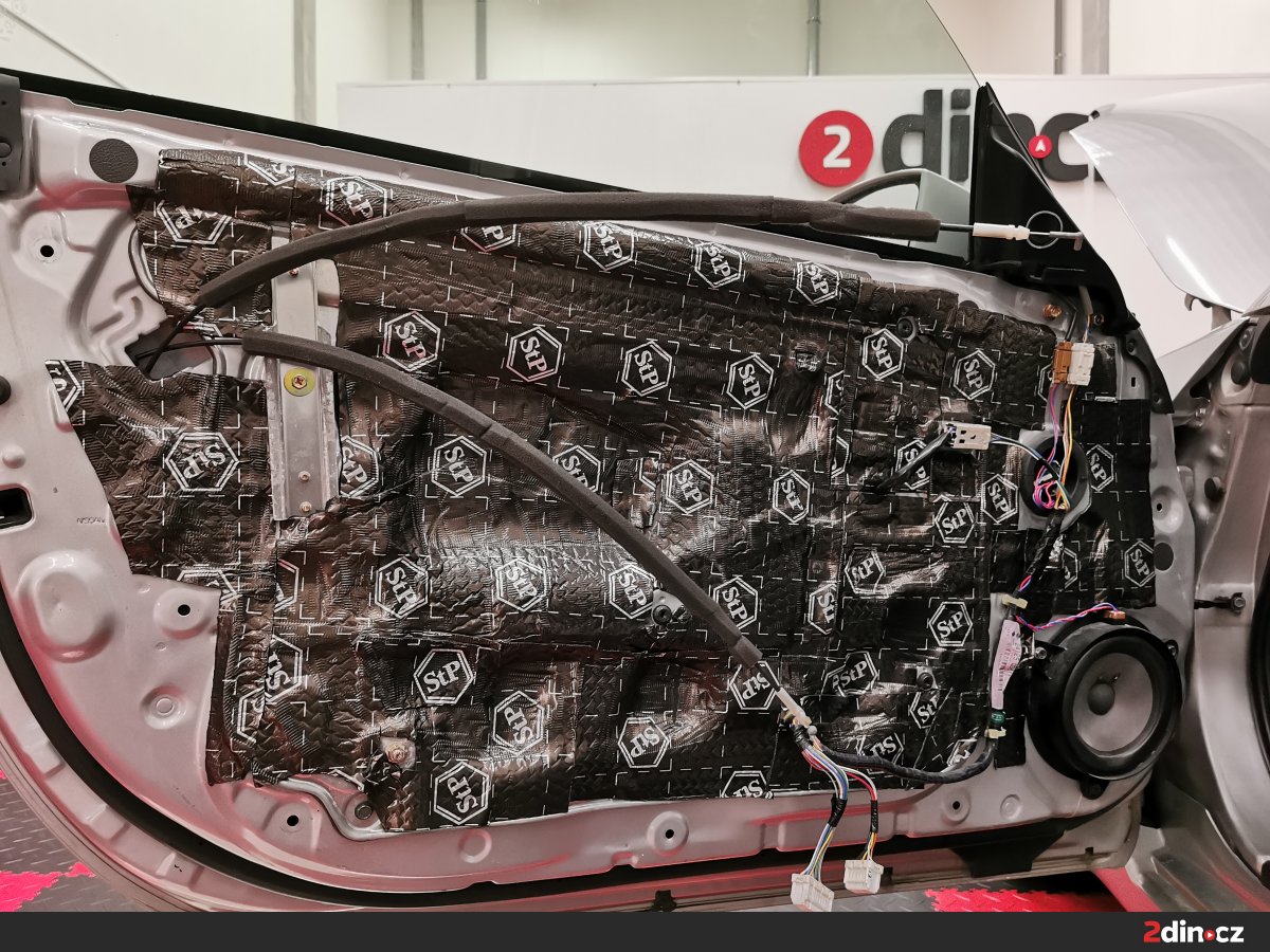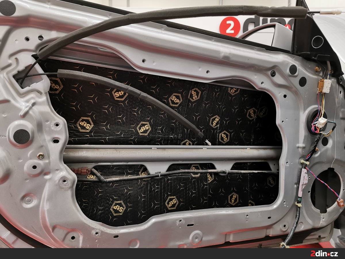 Dveře byly jednou z klíčových oblastí, na které jsme se v rámci montáže zaměřili. Aplikovali jsme silnou vrstvu antivibračního materiálu STP Black Gold Camo na vnější plech dveří, který výrazně omezuje rezonance kovových částí a zvyšuje jejich tuhost. Vnitřní plech dveří jsme polepili tenčím antivibračním materiálem STP Black Silver, který pomáhá vytvořit akustickou ozvučnici pro reproduktory a zlepšuje tak kvalitu poslechu hudby. Na tapecírung byla nanesena vrstva akustického materiálu STP Biplast 10, která zajišťuje pohlcení hluku přicházejícího z vnějšího prostředí a eliminuje nežádoucí vibrace plastových dílů.
