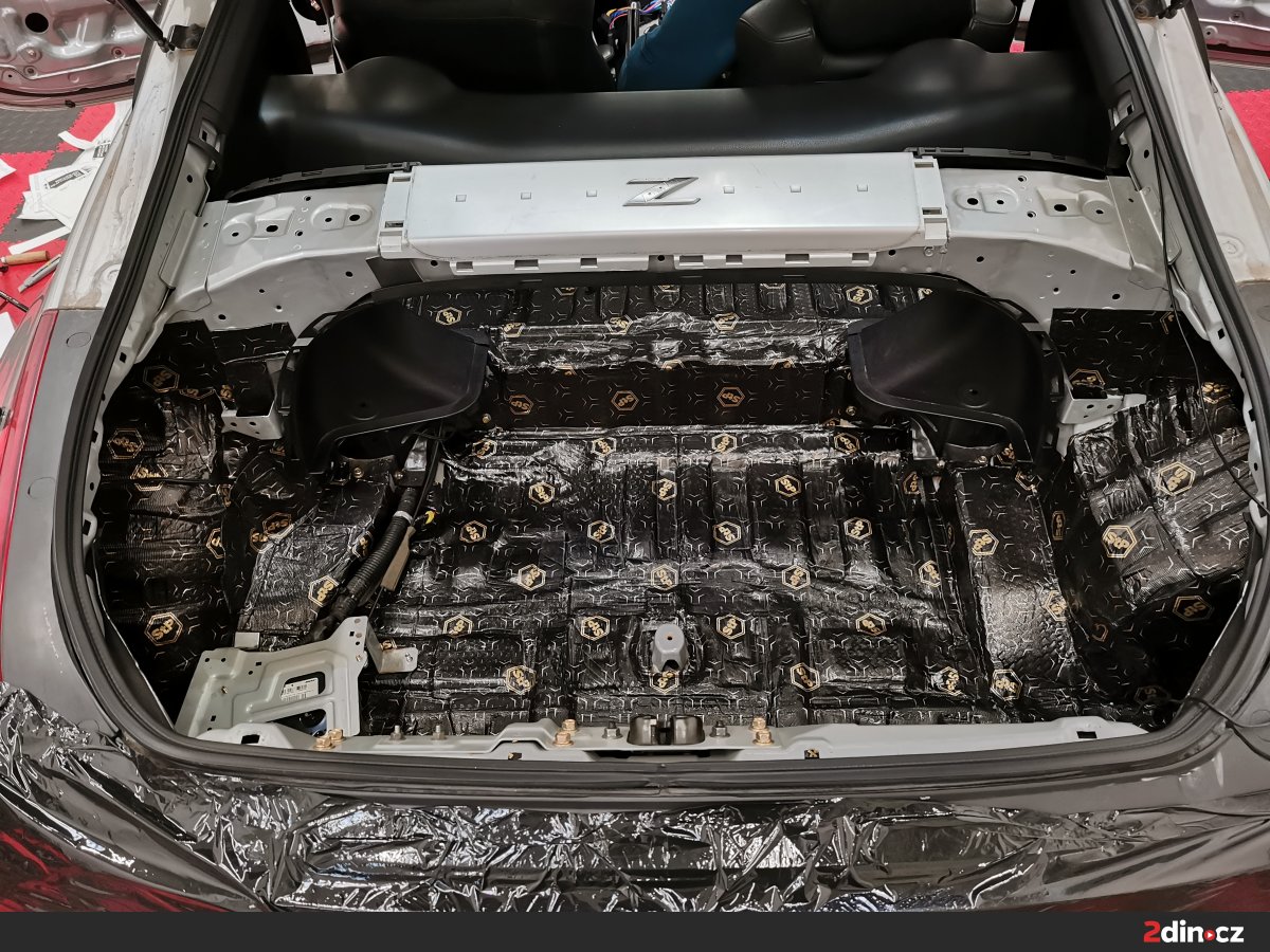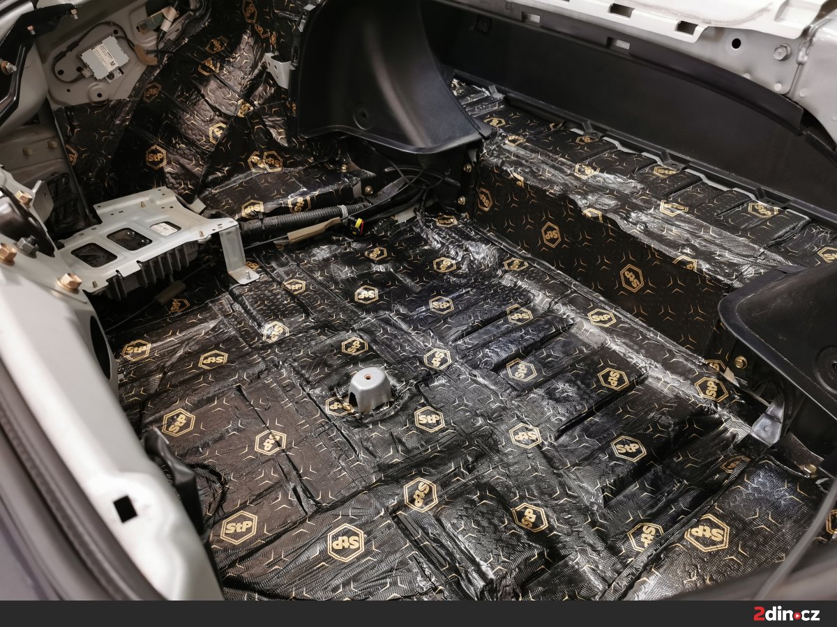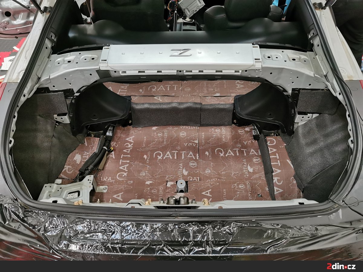 Kufr je další problematickou oblastí u vozu Nissan 350Z, neboť se nachází v těsné blízkosti výfukového systému a zadní nápravy, odkud se šíří značné množství hluku. Pro dosažení maximálního účinku jsme opět použili kombinaci více materiálů. První vrstvu tvořil osvědčený antivibrační materiál STP Black Gold Camo, který výrazně snižuje rezonanci kovových ploch. Druhou vrstvu tvořil protihlukový materiál STP Qattara, jenž svým složením zabraňuje průniku hluku do kabiny a zároveň má tepelně izolační účinky. Pro ještě vyšší účinnost byl použit akustický materiál STP Biplast 10, který uzavírá celek a výrazně pohlcuje zbytkové frekvence.