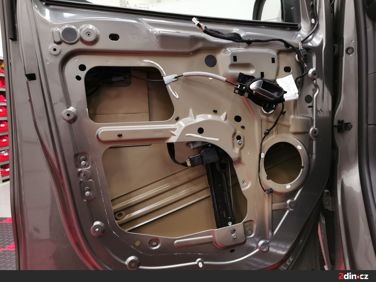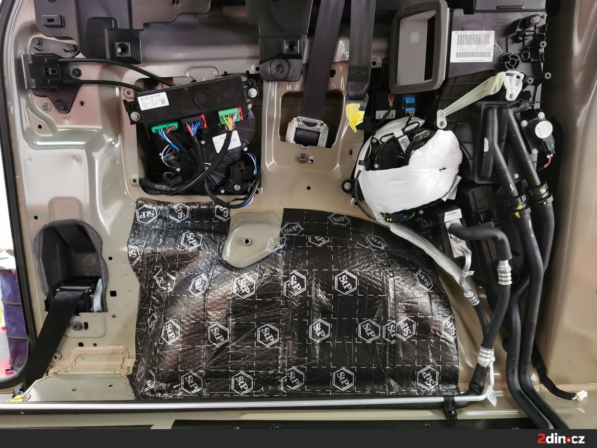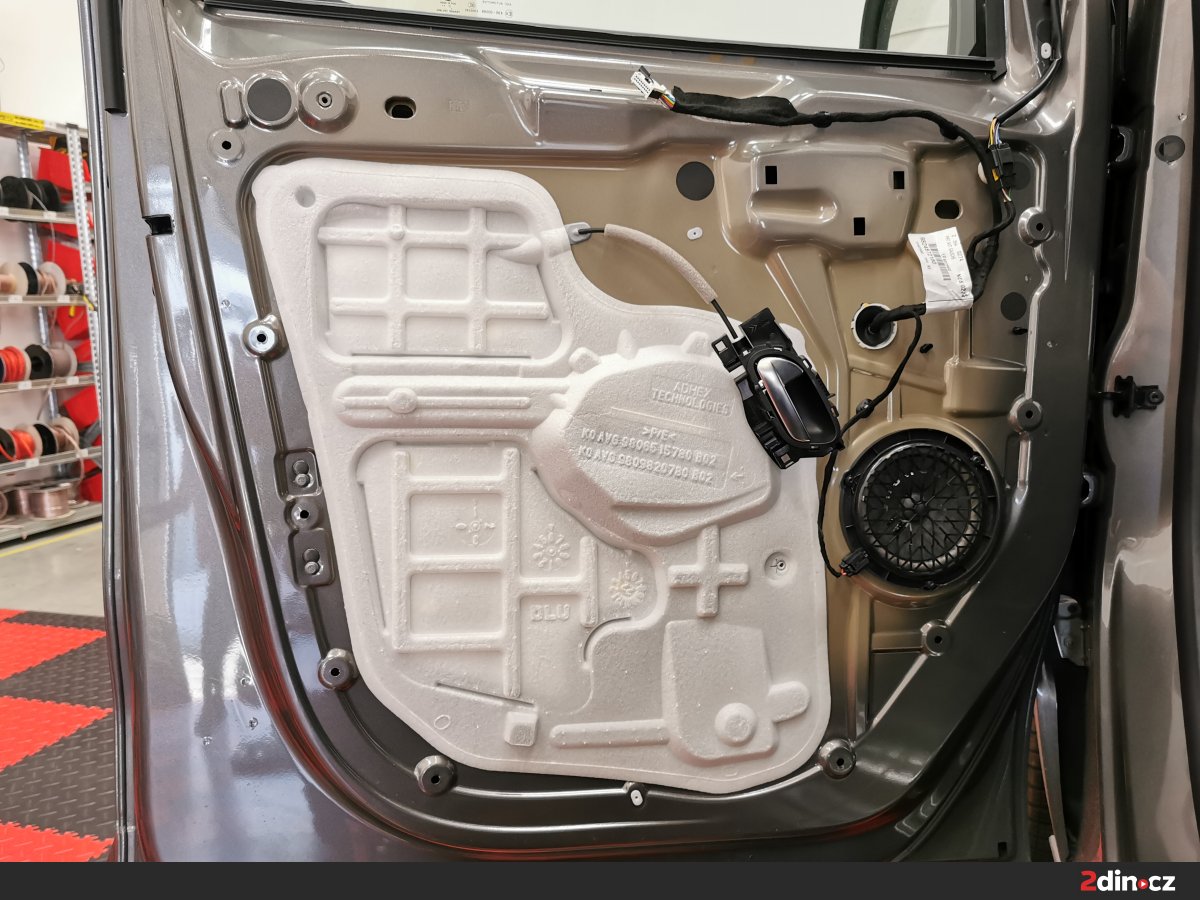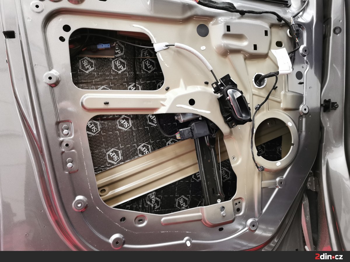 Přední i zadní dveře byly ošetřeny několika vrstvami materiálu. Prvním krokem byla aplikace antivibračního materiálu STP Black Silver na vnitřní i vnější plechy dveří. Tento materiál snižuje rezonance a zpevňuje samotnou konstrukci, čímž brání přenosu vibrací z vnějšího prostředí. Následně byla přidána vrstva akustického materiálu STP Biplast 10, která výrazně tlumí vysokofrekvenční hluky pronikající do interiéru. Díky tomuto řešení dochází k redukci aerodynamického šumu, k eliminaci pazvuků z plastových dílů a ke zlepšení celkové akustiky dveřního prostoru. Výsledkem je nejen tišší prostředí, ale i výrazně lepší projev audiosystému, který těží z kvalitnější ozvučnice vytvořené pevnou a odhlučněnou konstrukcí.