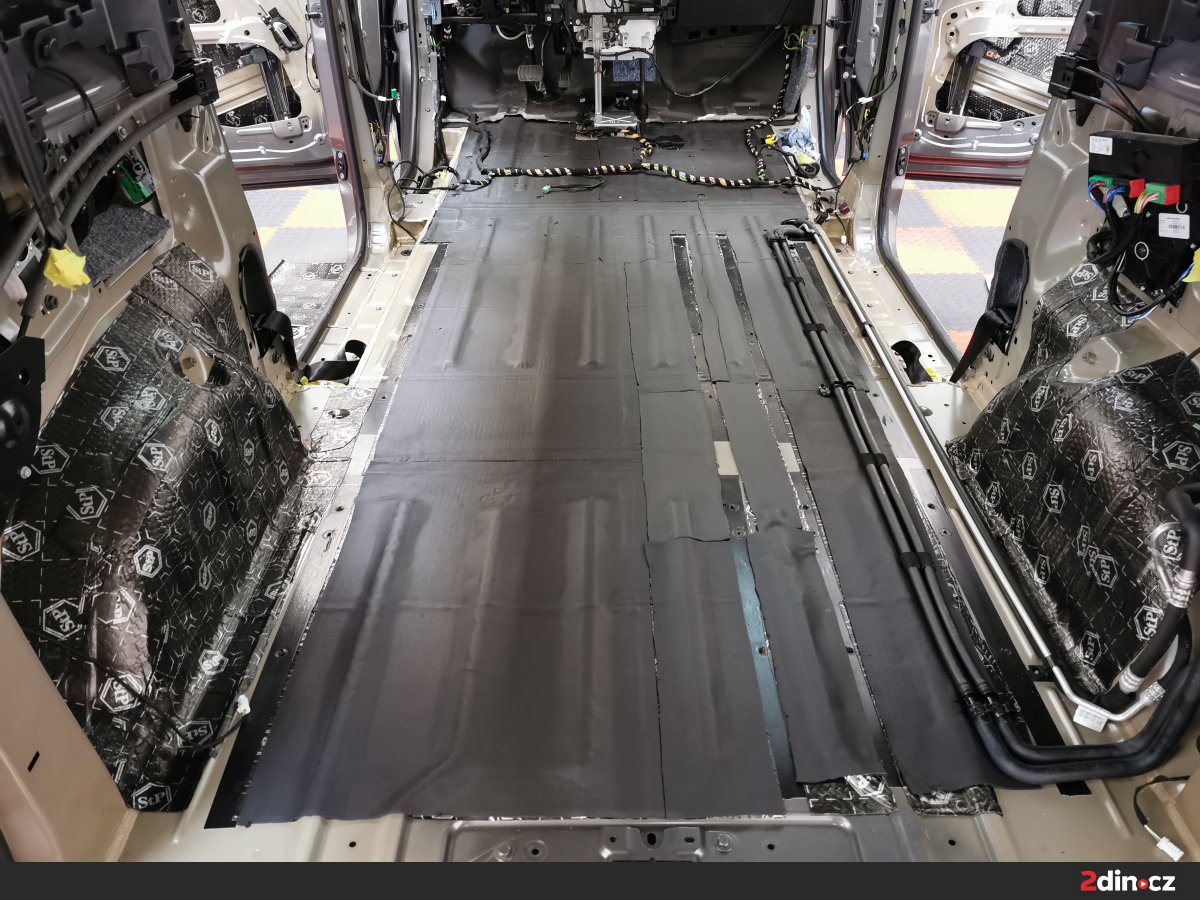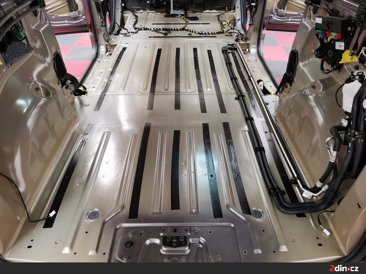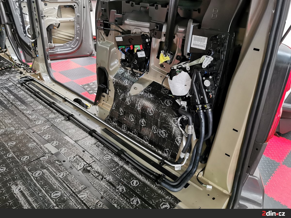 Podlaha je jednou z nejrozsáhlejších ploch vozu a zároveň jedním z hlavních zdrojů hluku, který se do interiéru přenáší od valivého odporu kol, vibrací náprav a rezonancí tenkého plechu. Nejprve byl aplikován antivibrační materiál STP Black Silver, který podlahu výrazně zpevnil a minimalizoval přenos vibrací. Na něj byla nalepena vrstva termoakustického materiálu Neoprene 3, který díky své struktuře nejen pohlcuje zvuk, ale zároveň přispívá k tepelné izolaci. Toto dvouvrstvé řešení je ideální pro prostory, kde je omezená výška a je potřeba zachovat původní usazení podlahových dílů bez deformací. Výsledkem je znatelné snížení hluku v kabině a příjemnější prostředí pro dlouhé jízdy.