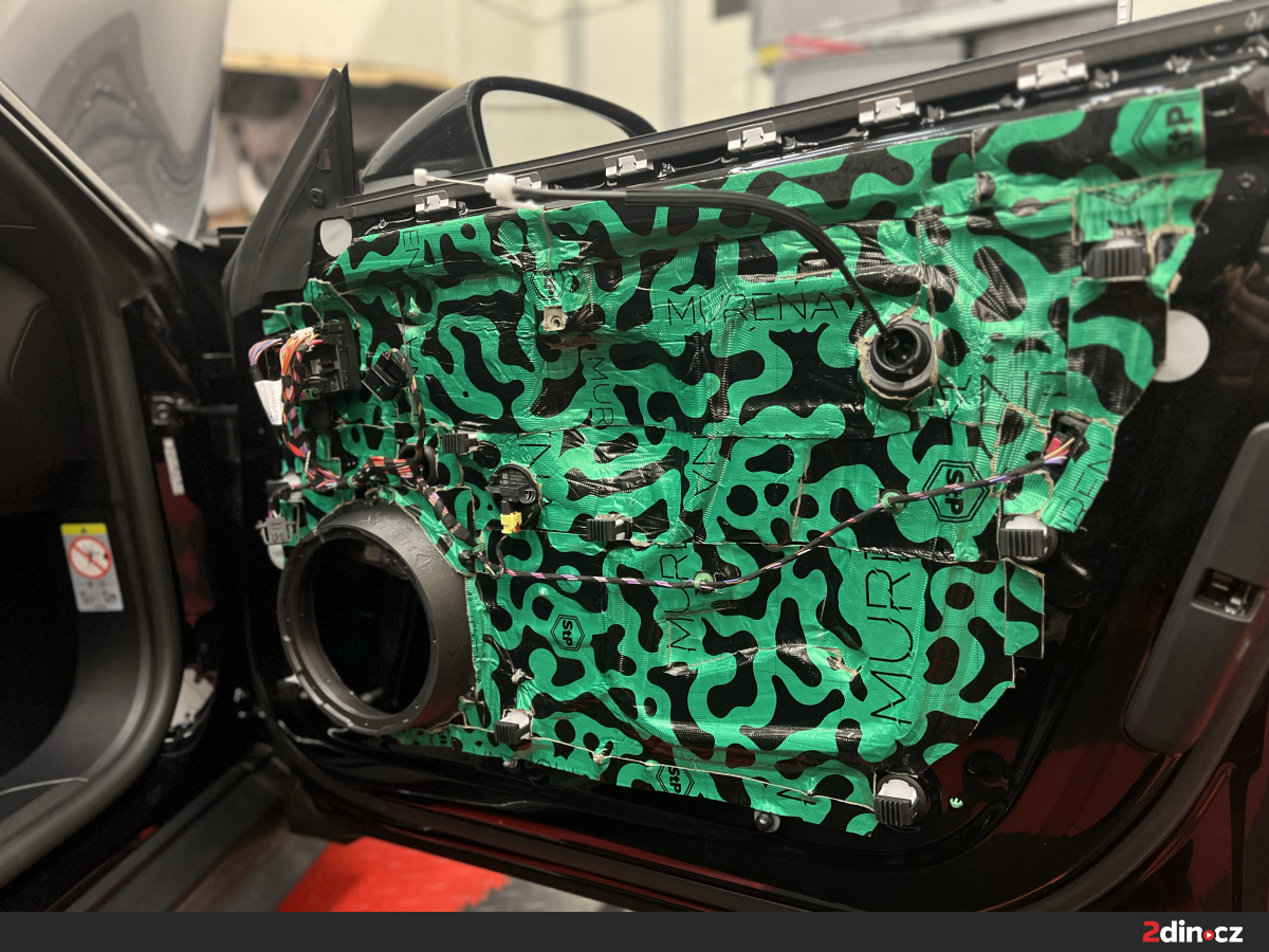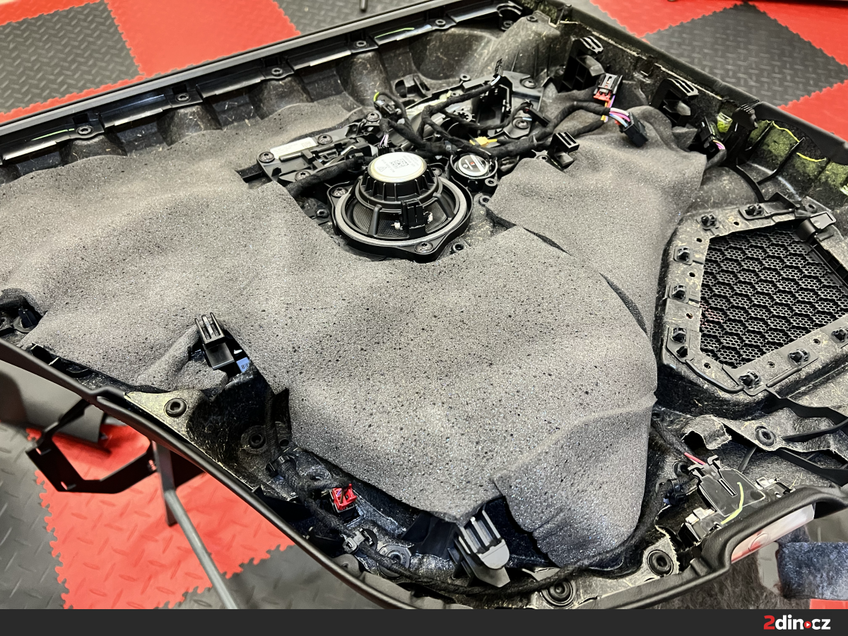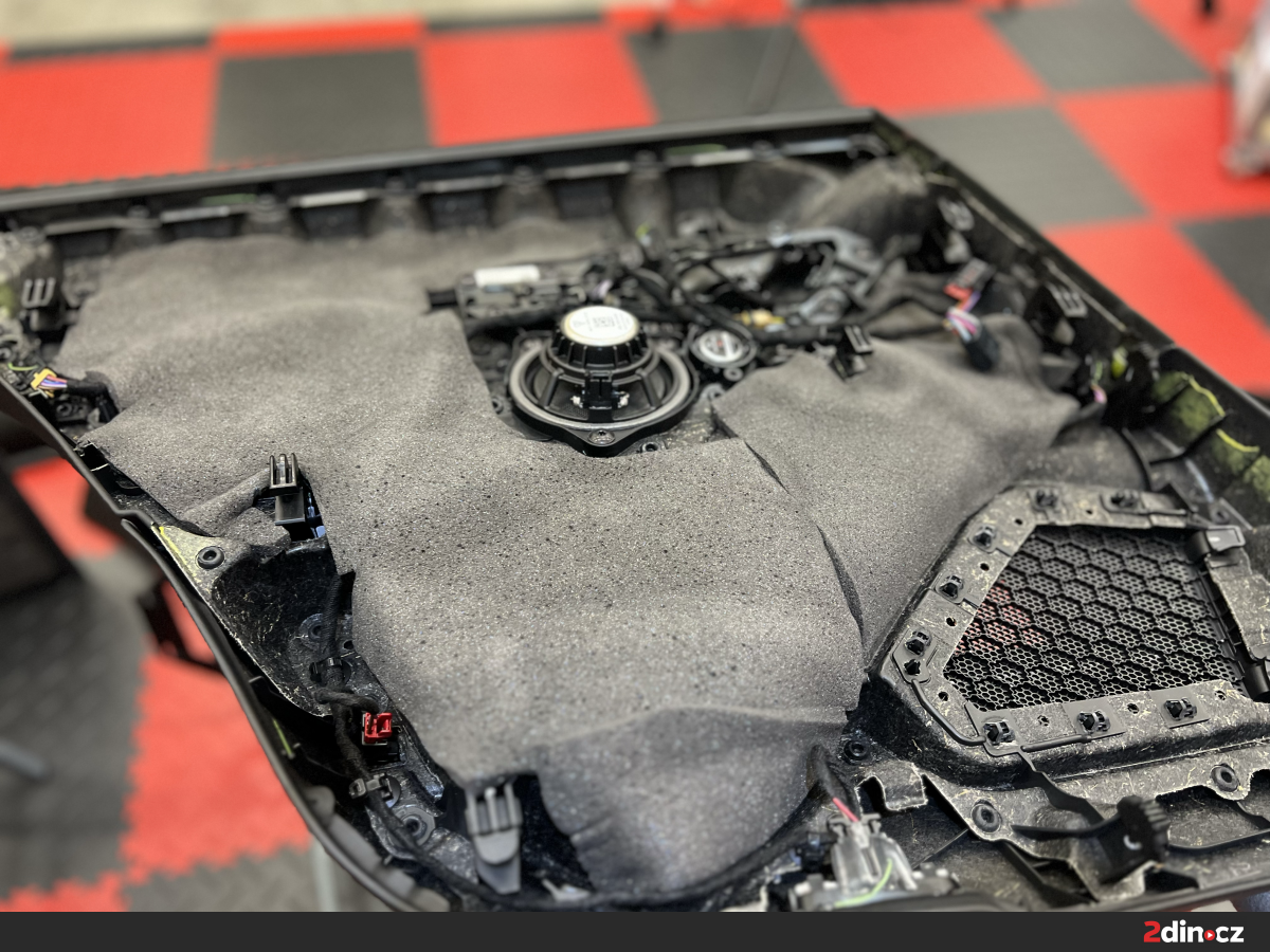 Pro dokonalý zvukový projev potřebujete ty správné podmínky. Proto jsme před samotnou instalací reproduktorů provedli rozsáhlé odhlučnění dveří a zavazadlového prostoru. Použili jsme špičkové materiály od STP – kombinaci antivibračních vrstev (Black Gold Camo, Devil’s Gold, Murena 2 a Murena 3) a akustických pohlcovačů (Biplast 10, Relief 15 Premium). Tento vícestupňový systém nejen potlačuje vibrace, a pohlcuje hluk, ale také absorbuje vnitřní rezonance a šum, což má zásadní vliv na čistotu a čitelnost reprodukované hudby. Odhlučnění nám umožnilo připravit ideální akustické prostředí pro instalované komponenty.