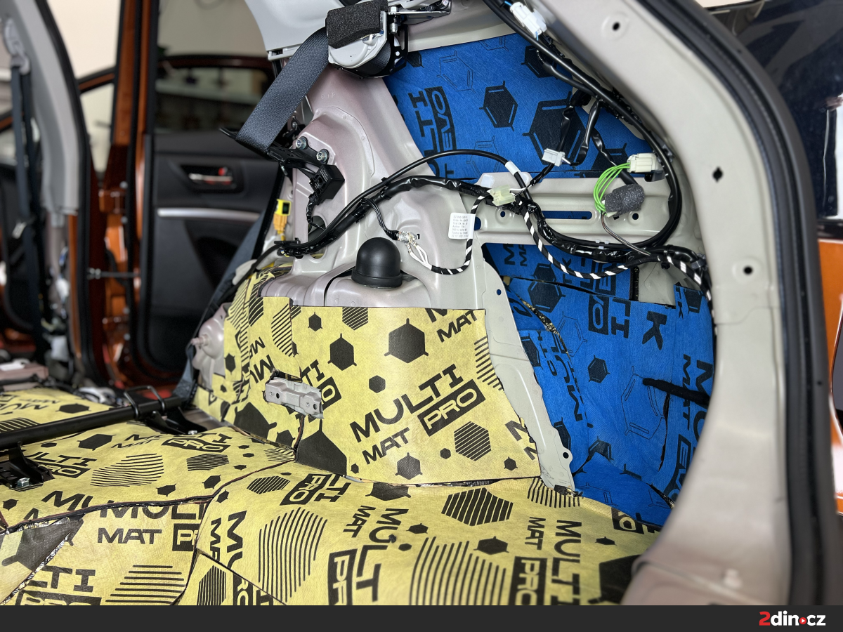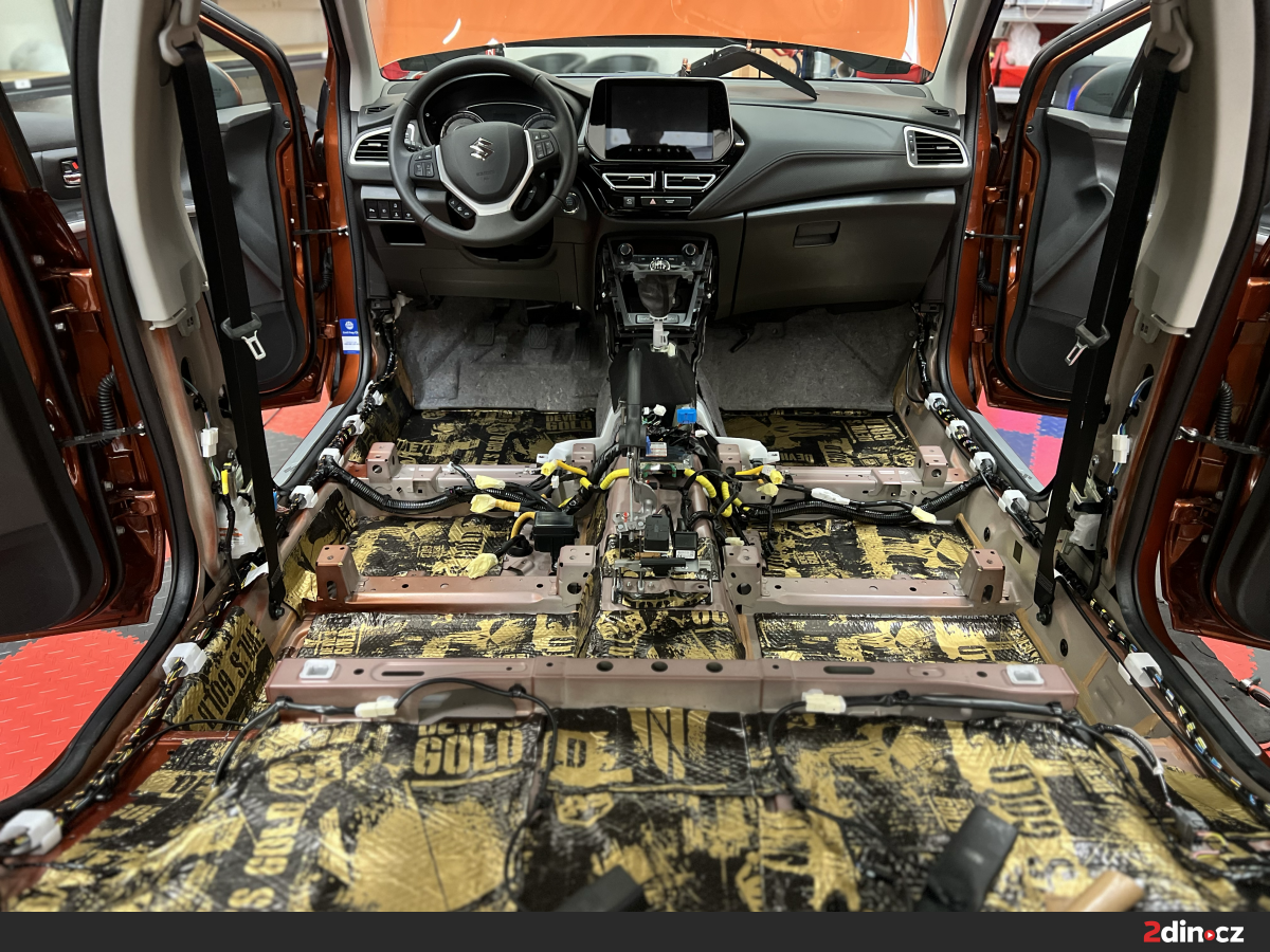 Podlaha patří mezi nejdůležitější části vozu z hlediska přenosu hluku od pneumatik, podvozku i samotné vozovky. U Suzuki SX4 S-Cross bylo právě v této oblasti znatelné, že tovární řešení nedokáže dostatečně filtrovat vibrace ani rušivé akustické vlivy, který se během jízdy přenáší do kabiny. Proto jsme po demontáži interiérových prvků provedli pečlivou aplikaci materiálů na podlahové plochy. Jako základ byl použit antivibrační materiál STP Devil's Gold, který pomáhá zpevnit plechové části a výrazně snižuje jejich nežádoucí rezonance. Následně byly využity zvukově izolační materiály CTK Multimat EVO a CTK Multimat PRO, které účinně omezují šíření hluku do interiéru. Celek doplnil termoakustický materiál STP AeroFlex 10, jenž přispívá k odizolování prostoru posádky a současně zlepšuje její celkové pohodlí při běžném i dálničním provozu.