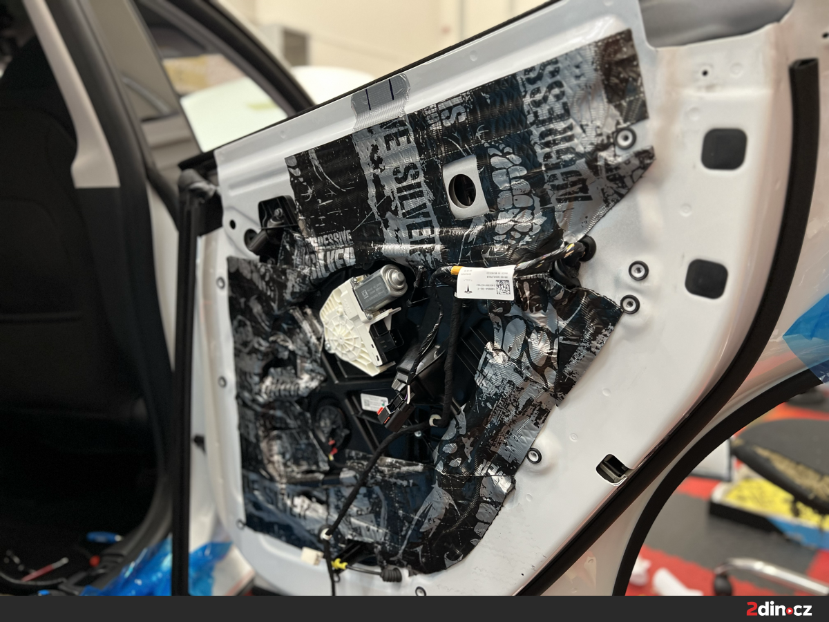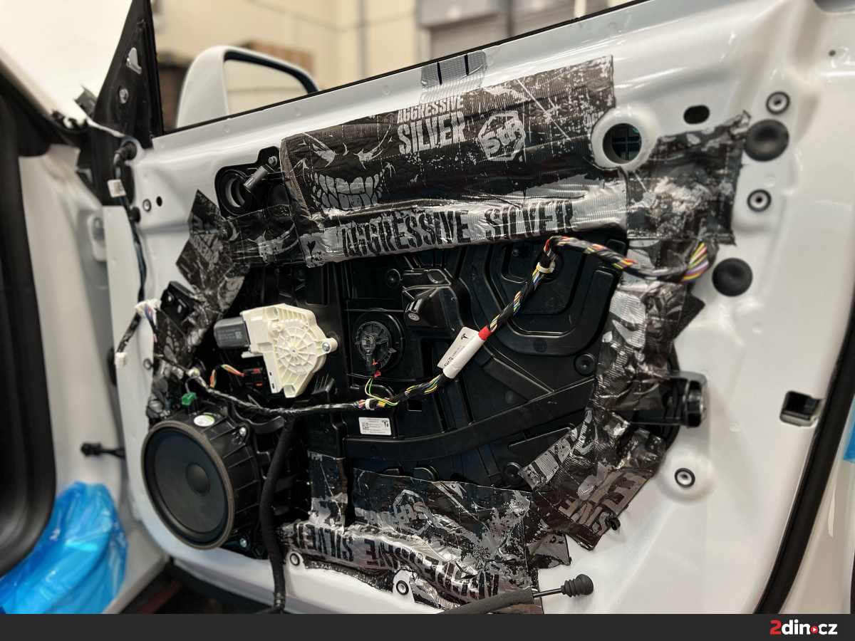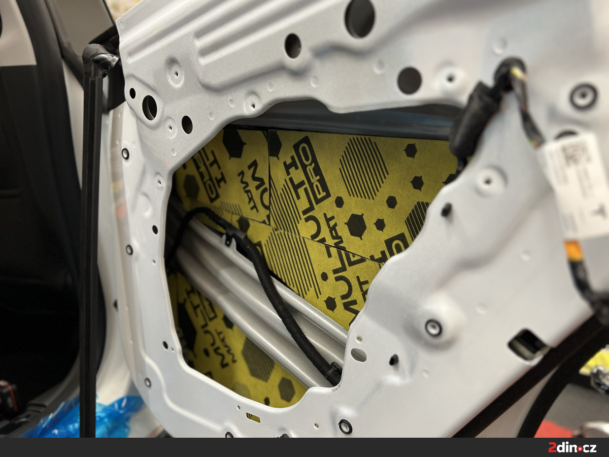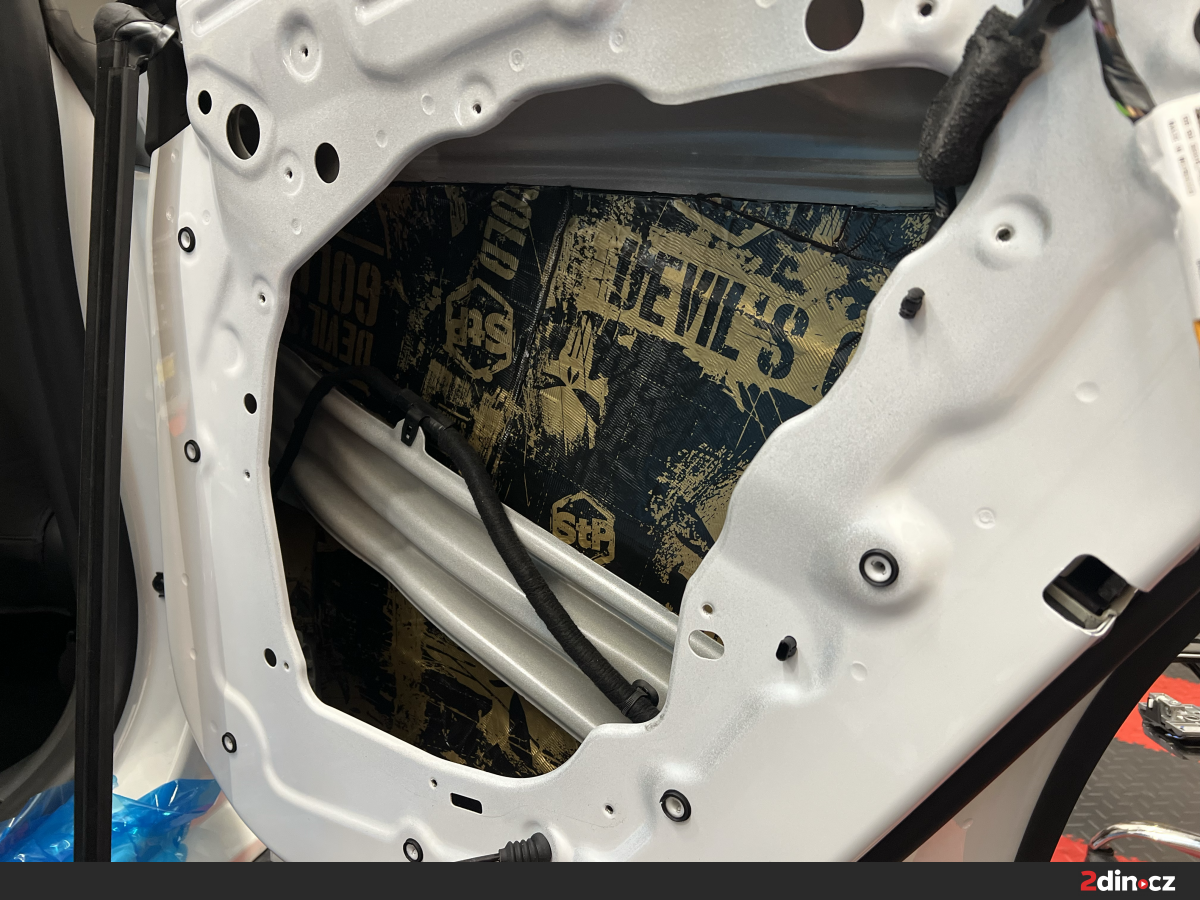 Dveře vozidla byly upraveny ve více vrstvách s použitím kombinace antivibračních a akustických materiálů. Na plechové části byla aplikována vrstva STP Aggressive Silver a CTK Acoustic 20 pro zpevnění konstrukce a redukci rezonancí. Pro další potlačení hluku a zlepšení akustických vlastností dveří následovala aplikace pohlcujícího materiálu StP Relief 15 Premium na tapecírung. Díky této vrstvě dochází ke znatelnému zlepšení akustické pohody ve voze a eliminaci běžných pazvuků způsobených vibracemi plastů a plechu. Výsledkem je pevnější a akusticky vyváženější konstrukce dveří, která účinně izoluje kabinu od vnějších ruchů.