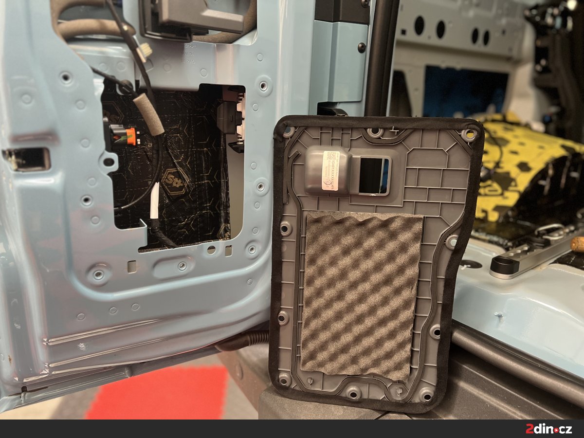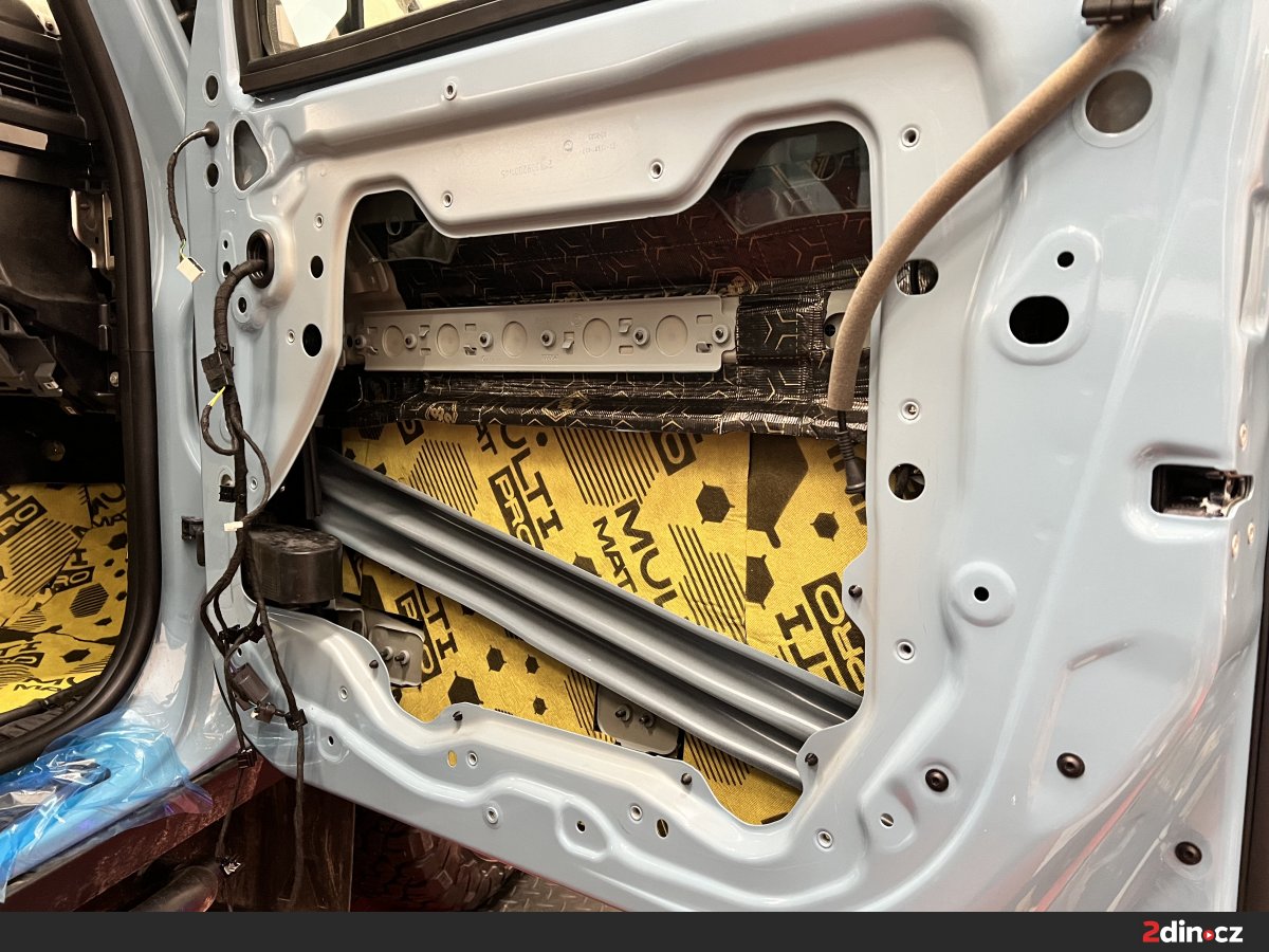 Dveře hrají zásadní roli nejen v celkové hlučnosti kabiny, ale navíc fungují jako ozvučnice pro reproduktory. U tohoto projektu jsme je ošetřili pomocí kombinace STP Black Silver a STP Black Gold Camo, které posloužily jako antivibrační základ na vnější i vnitřní plechy dveří. Tím jsme zabránili přenosu vibrací a výrazně zvýšili tuhost konstrukce. Do vnitřních plastových částí dveří jsme poté instalovali akustickou pěnu Silent Coat SA15, která eliminuje rezonance plastových výplní a zároveň utěsňuje prostor kolem reproduktorů. Tento systém odhlučnění proměnil dveře v kvalitní ozvučnici, která umožňuje vytáhnout z reproduktorů maximální výkon a čistotu.